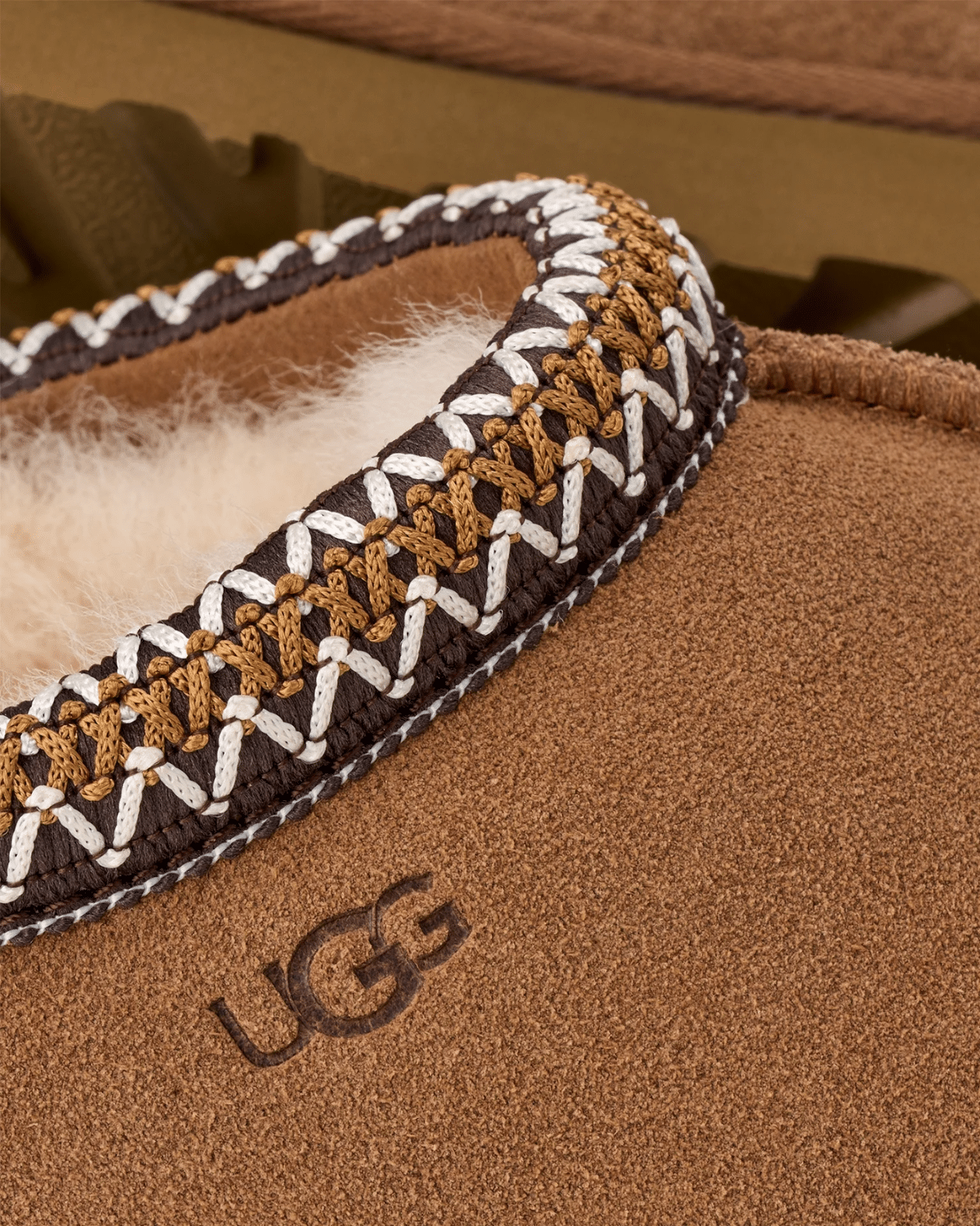 החלק העליון עשוי זמש חום טבעי רך, עם קולר מעוטר ב-UGGbraid שנוצר מסיבי פוליאסטר ממוחזרים.