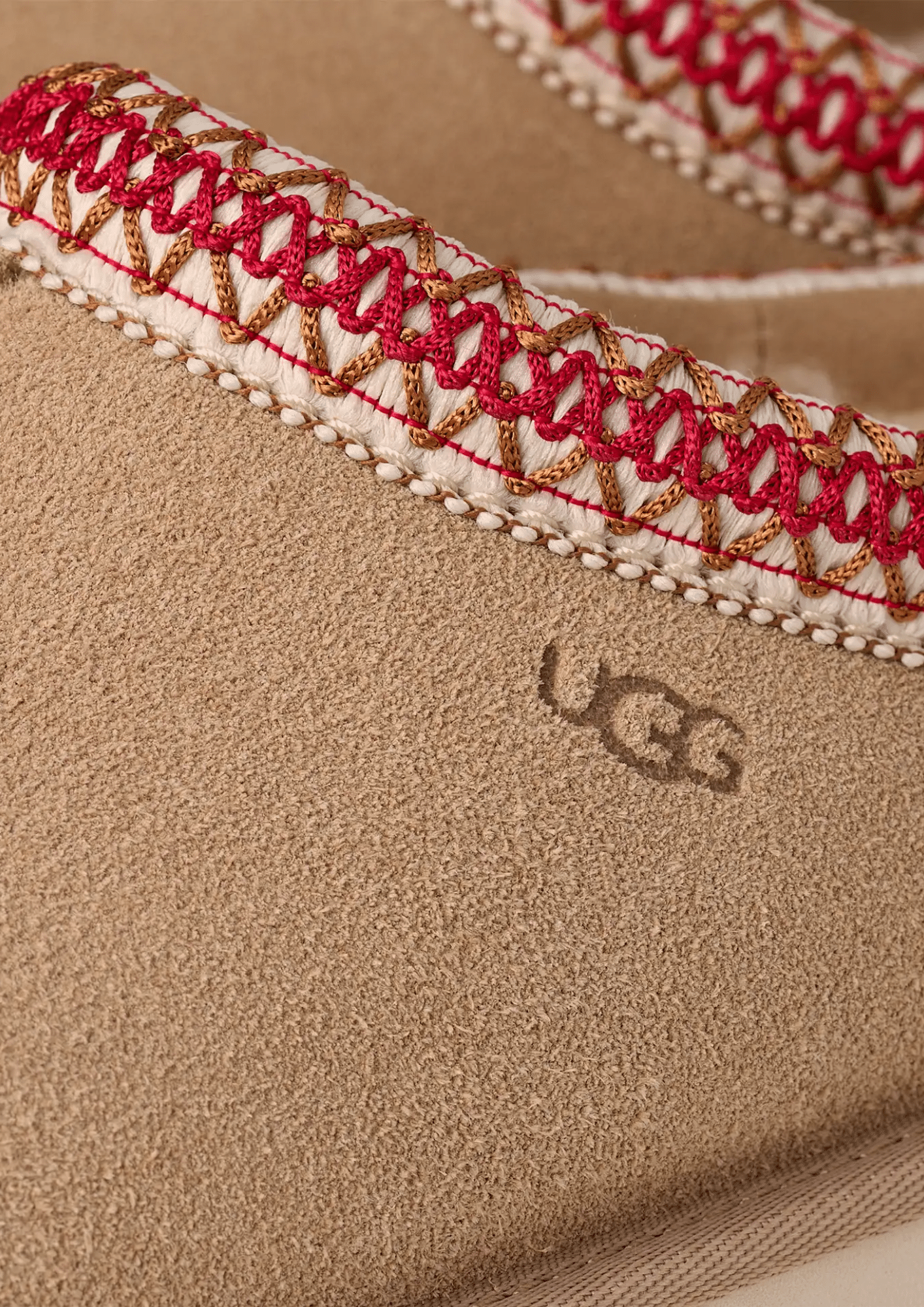 החלק העליון עשוי זמש חום טבעי רך, עם קולר מעוטר ב-UGGbraid שנוצר מסיבי פוליאסטר ממוחזרים.