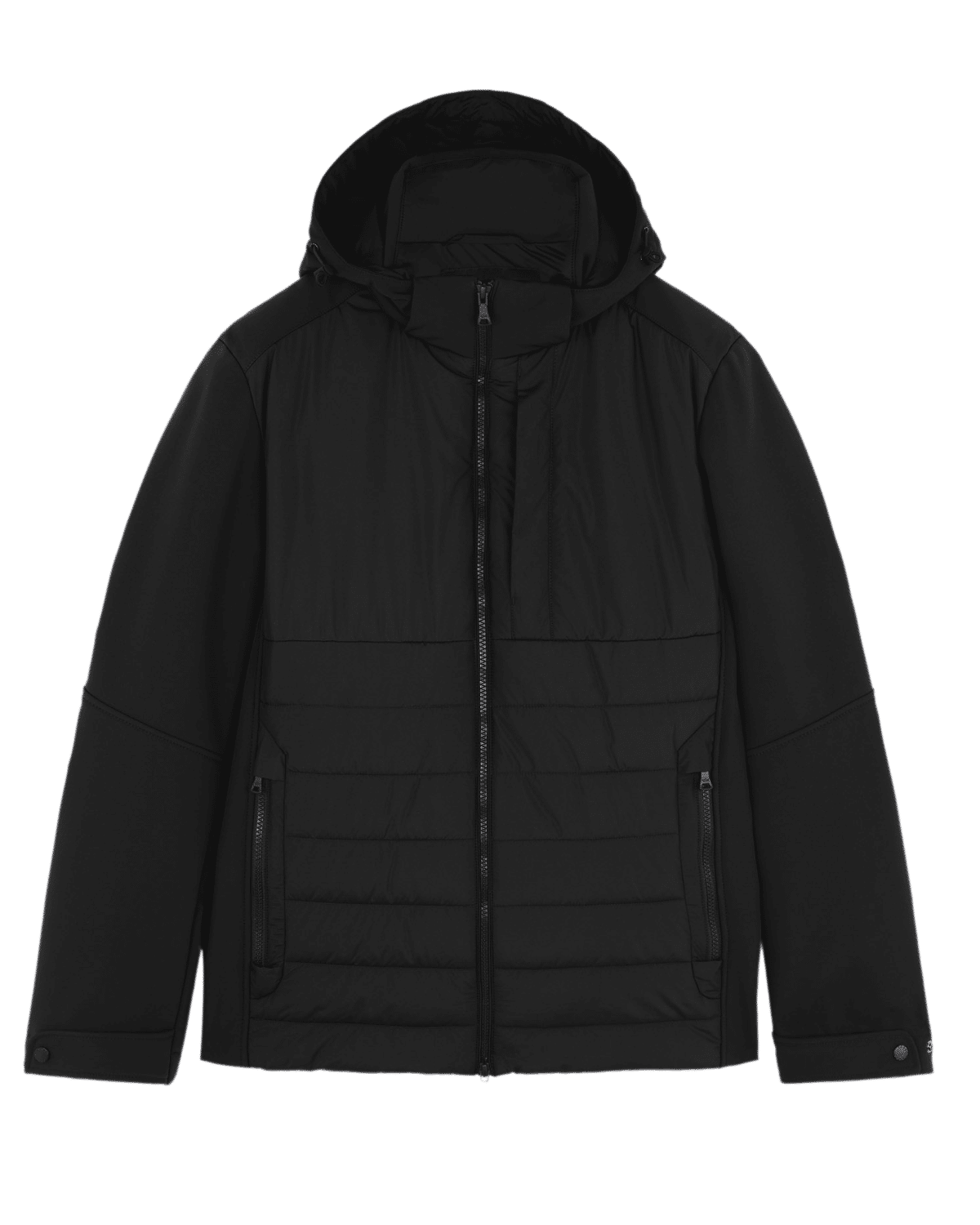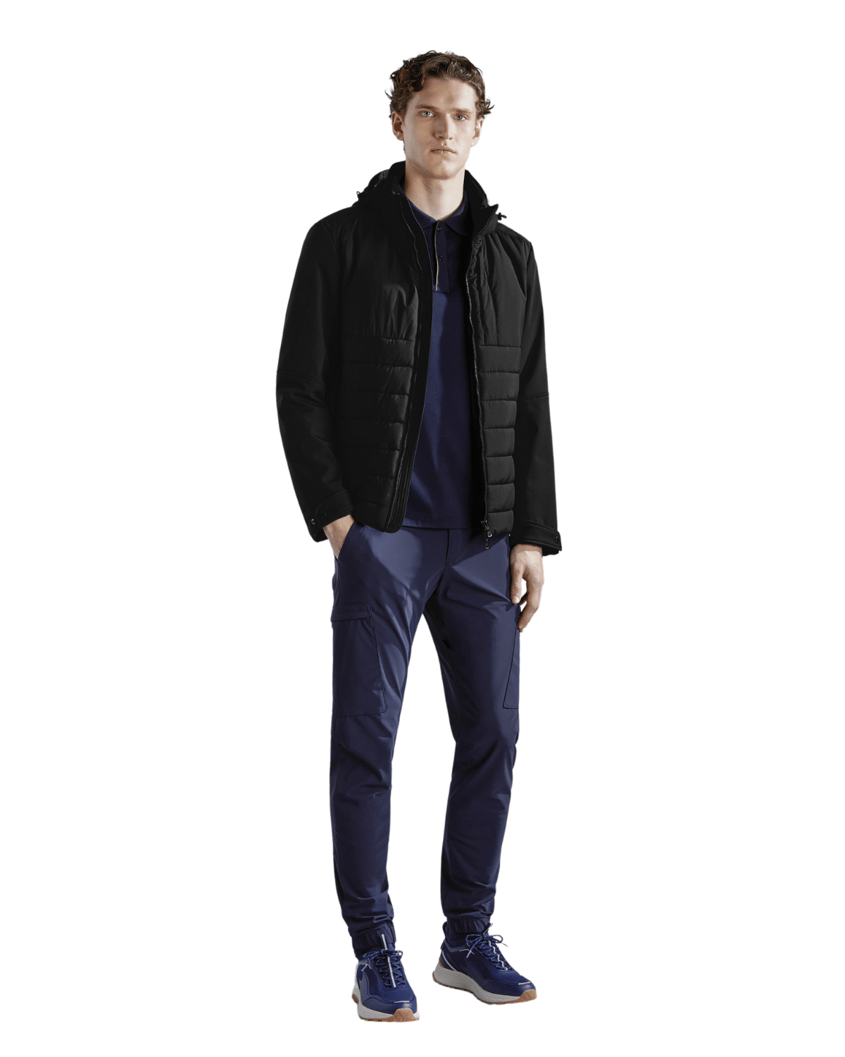 מעיל גברים מבית Paul & Shark בצבע שחור, עם כובע קפוצ’ון מובנה, רוכסן קדמי מלא וכיסים פרקטיים בצדדים.