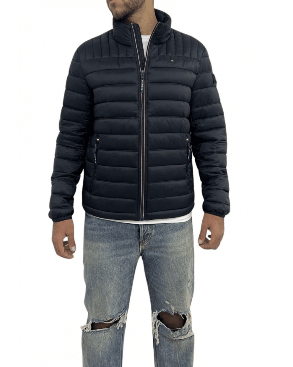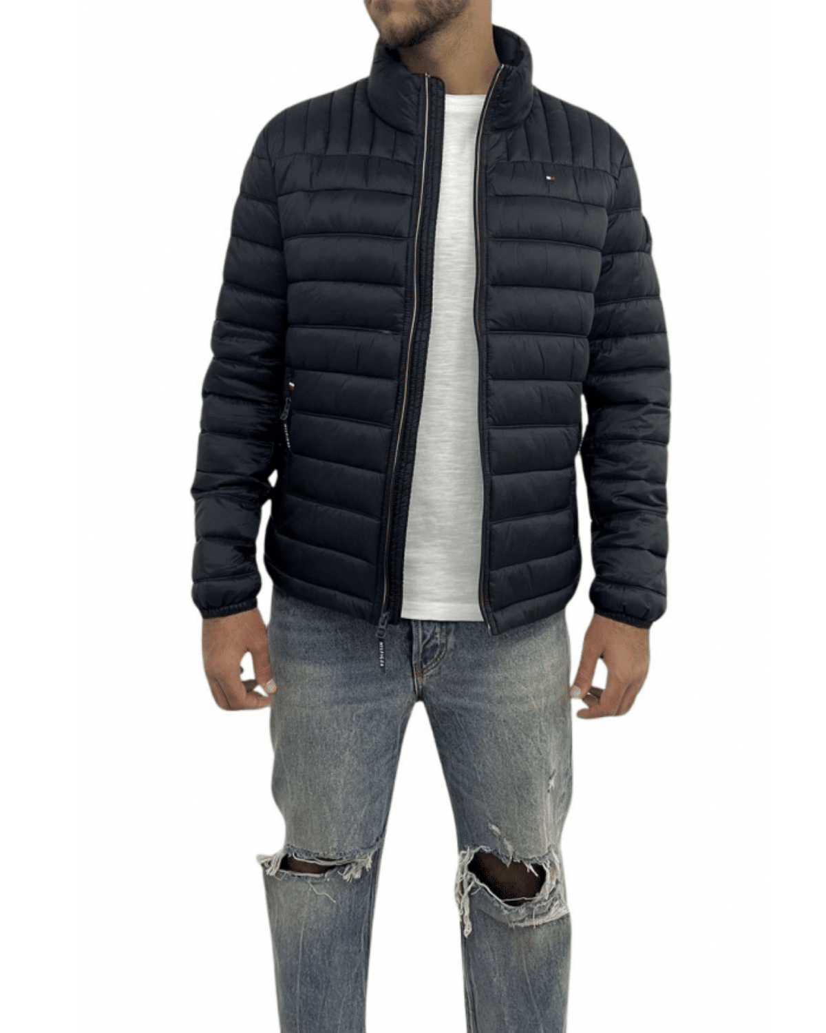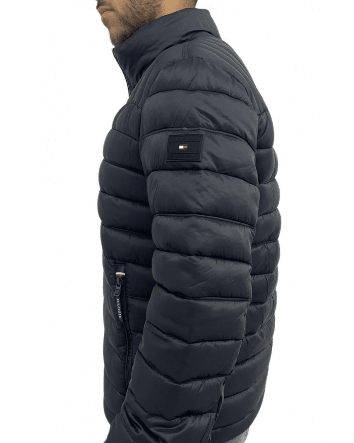 מאפיינים אופנתיים: לוגו מותג ניגודי מודפס של הילפינגר על הצוואר האחורי, דגל טומי בחזה השמאלי ותיקון לוגו גומי על זרוע שמאל; צנרת על פני החזה והגב לתוספת פרטים; בטנה פנימית מרופדת