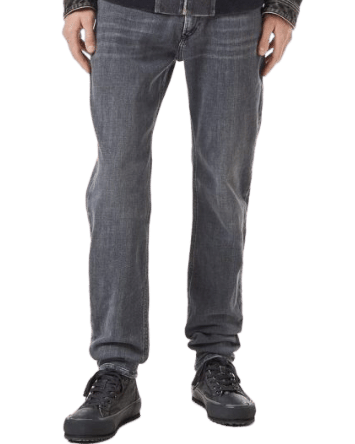 ג׳ינס בגזרת סקיני בצבע אפור כהה עם שפשופים בירכיים ובברכיים
