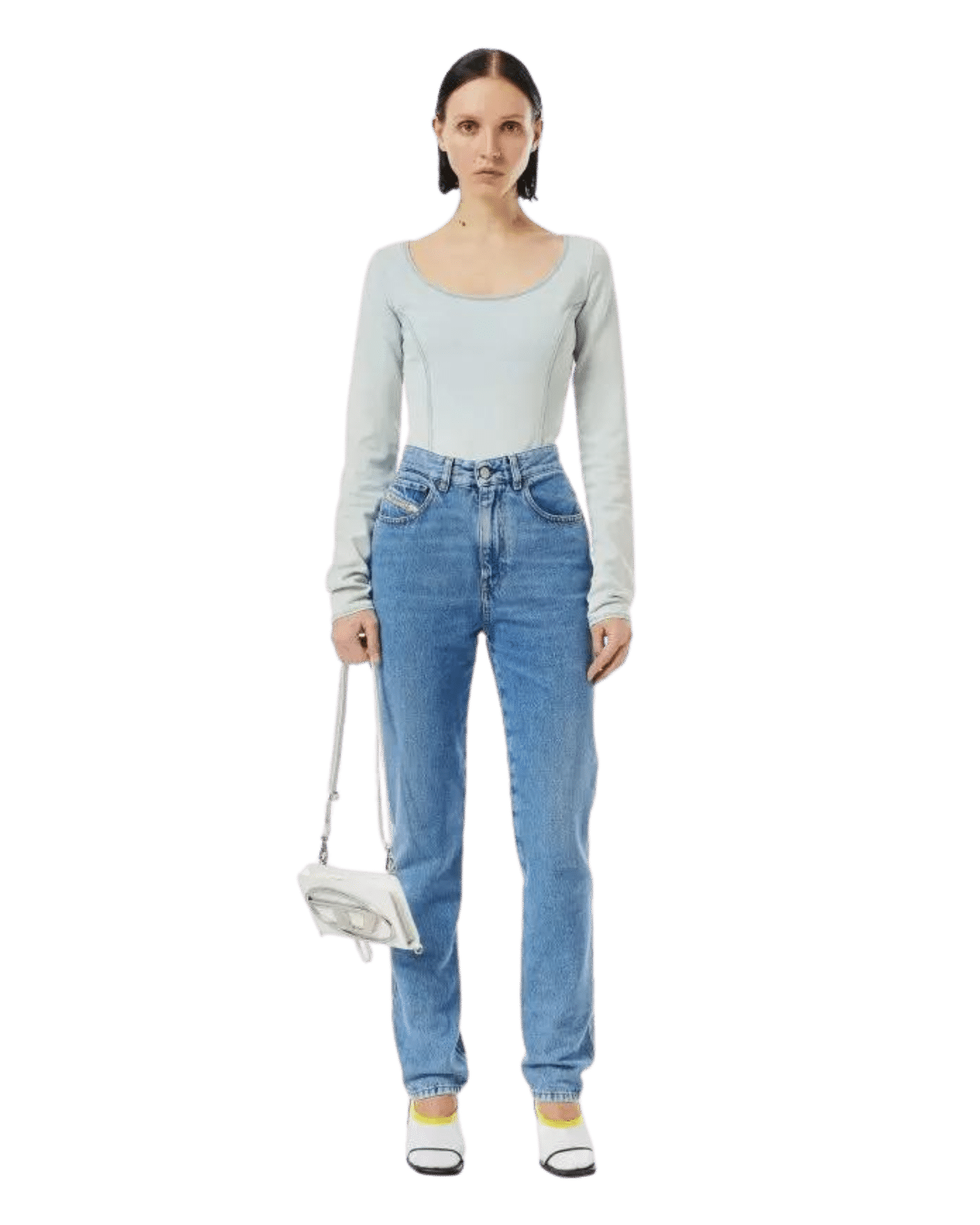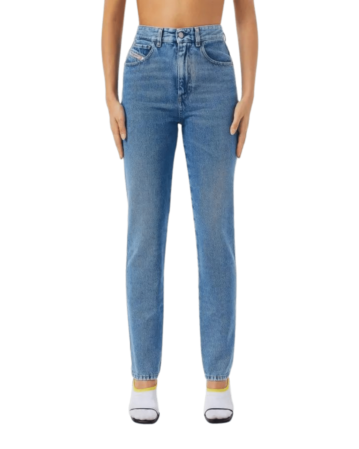 ג׳ינס כחול בגזרה גבוהה וצרה שעבר עיבוד למראה וינטג׳