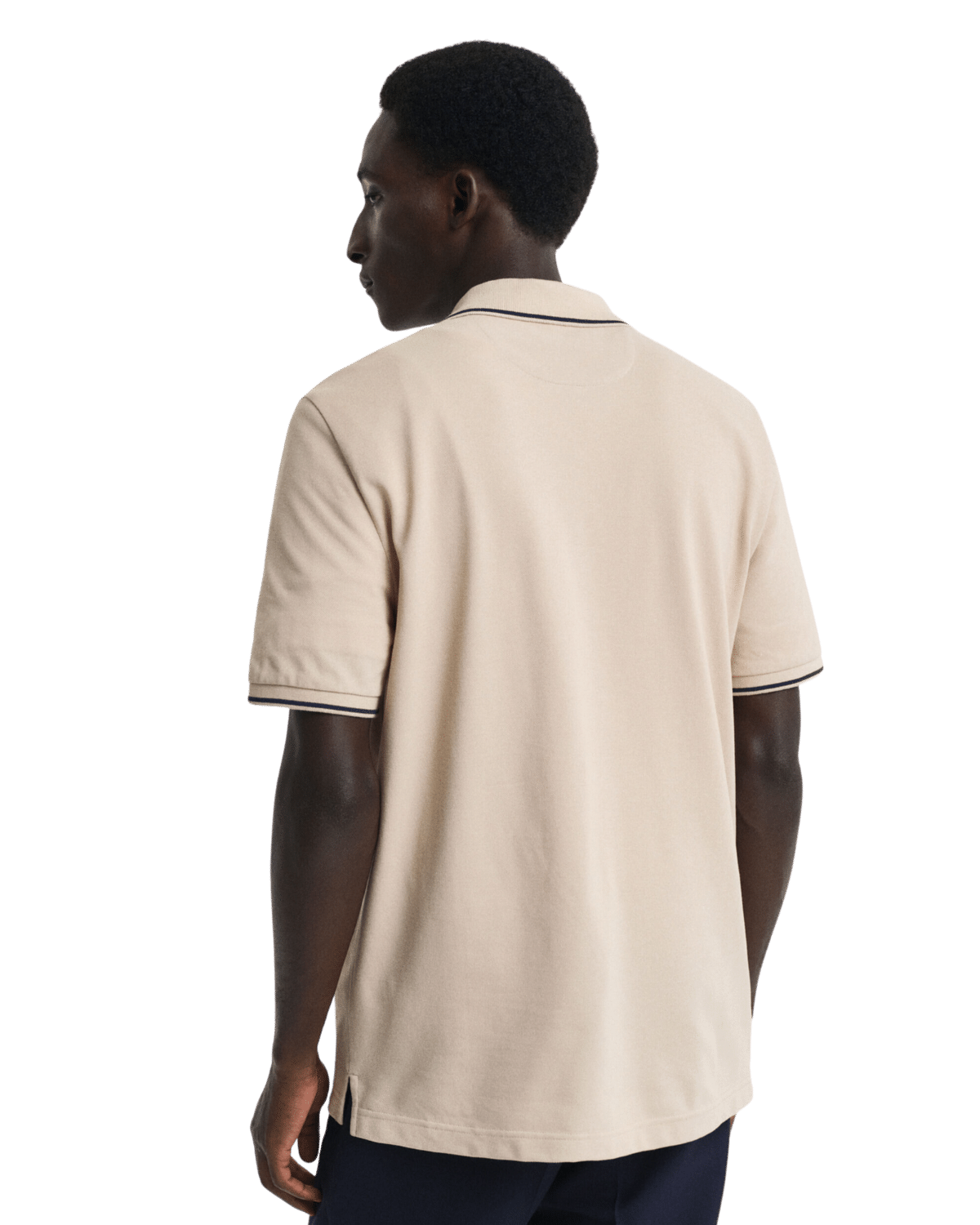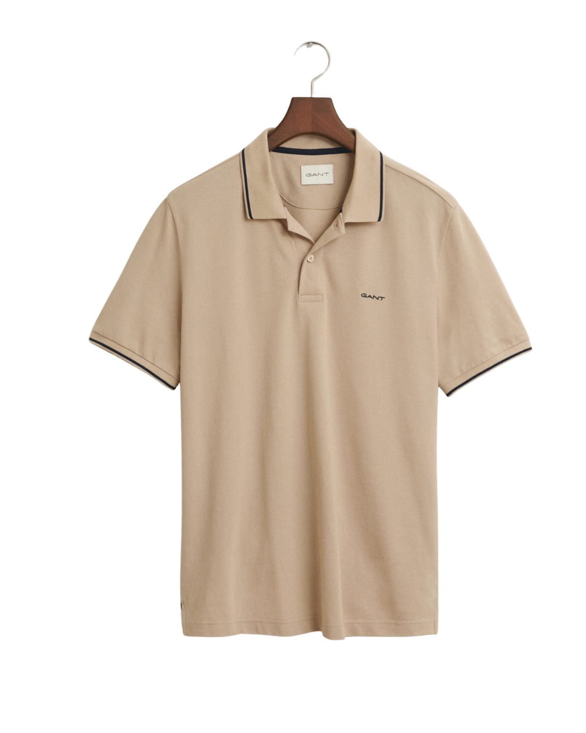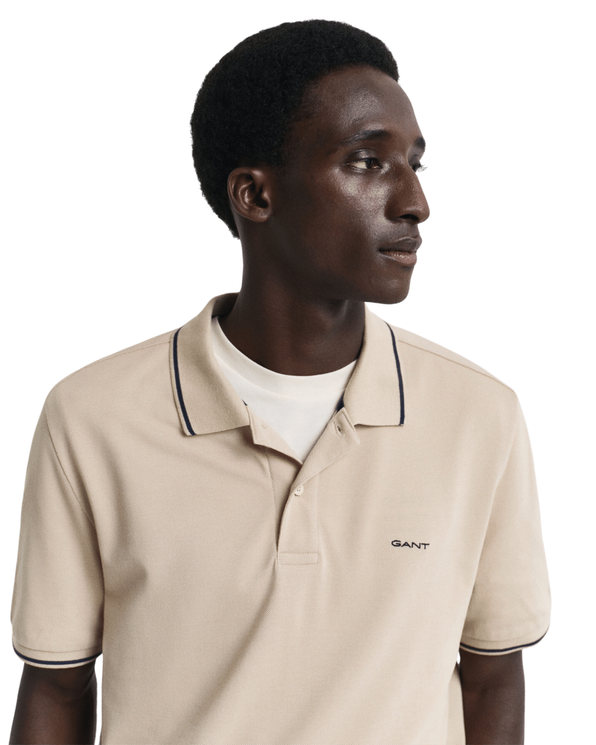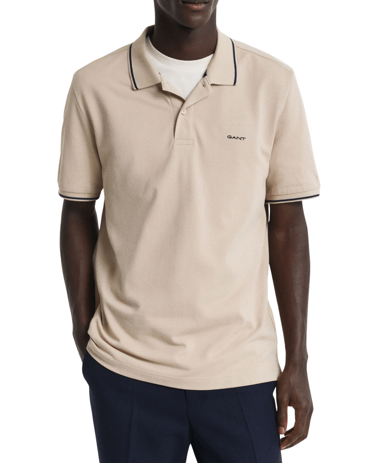 חולצת פולו קצרה לגברים מבית המותג היוקרתי גנט, בצבע בז' אלגנטי.