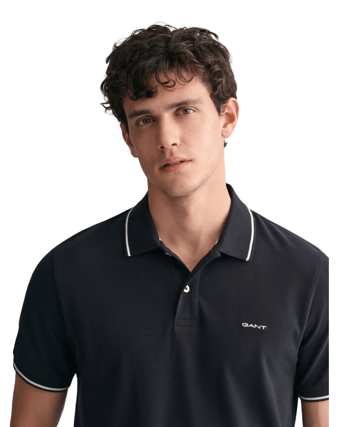 העיצוב הקלאסי כולל צווארון פולו עם סגירת כפתורים ולוגו המותג הרקום בחזית, המשדר מראה מתוחכם ויוקרתי.