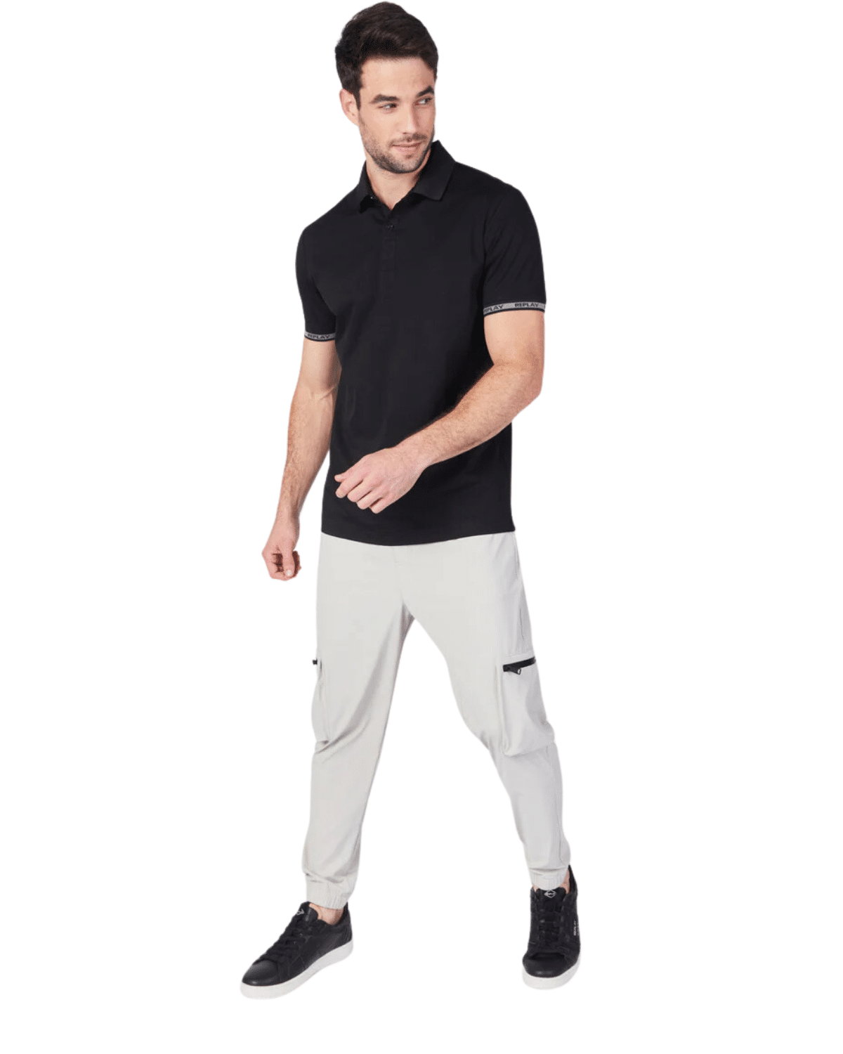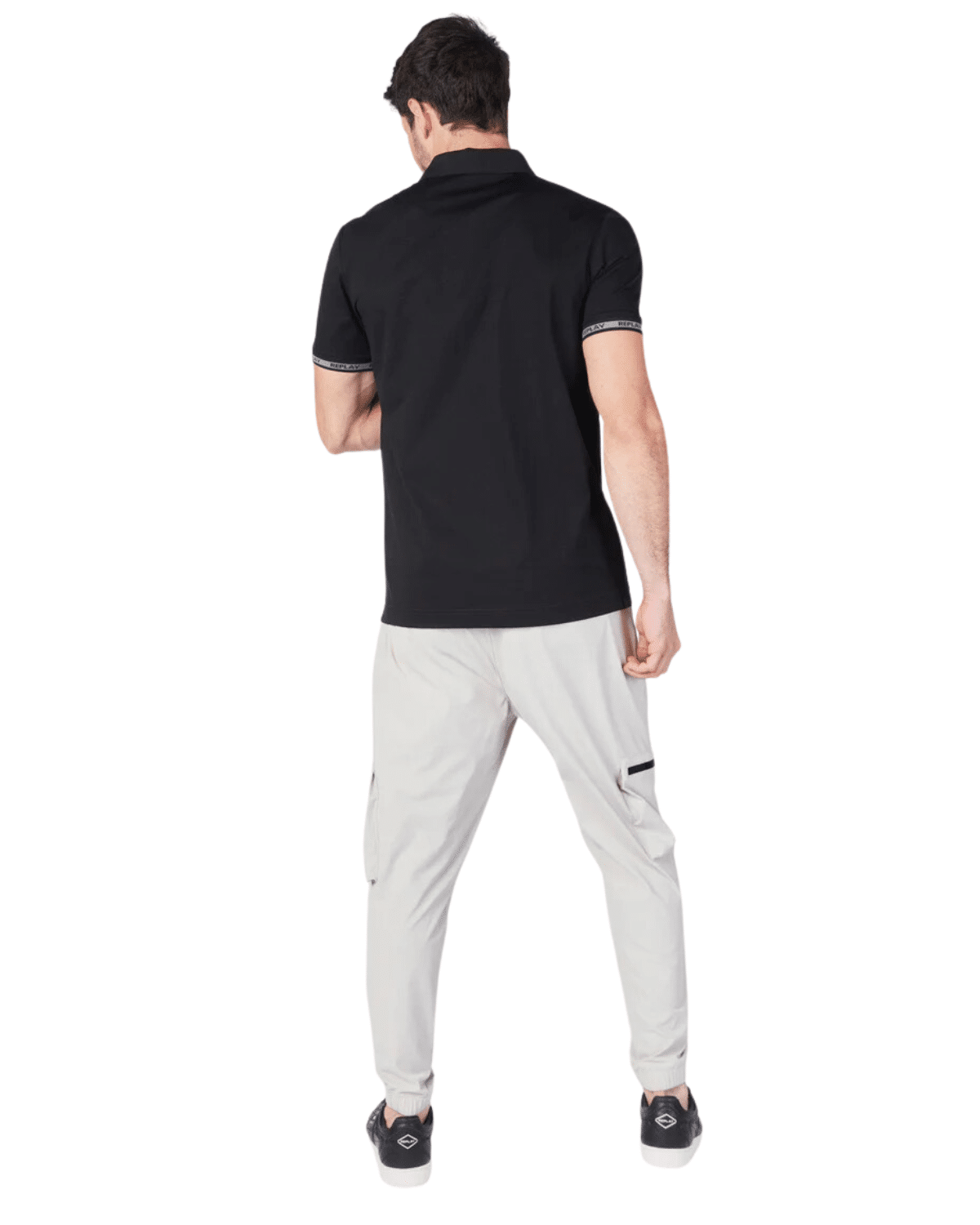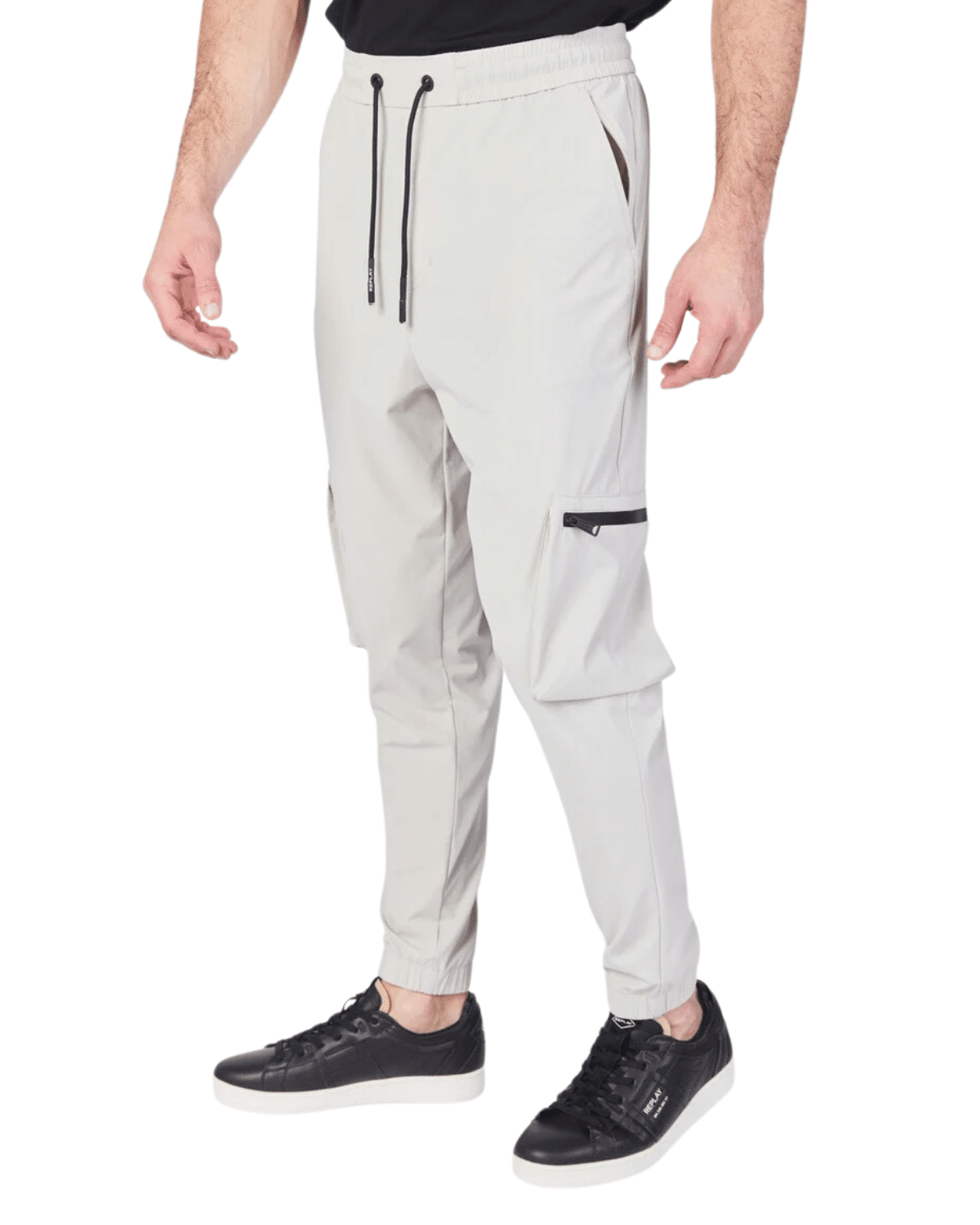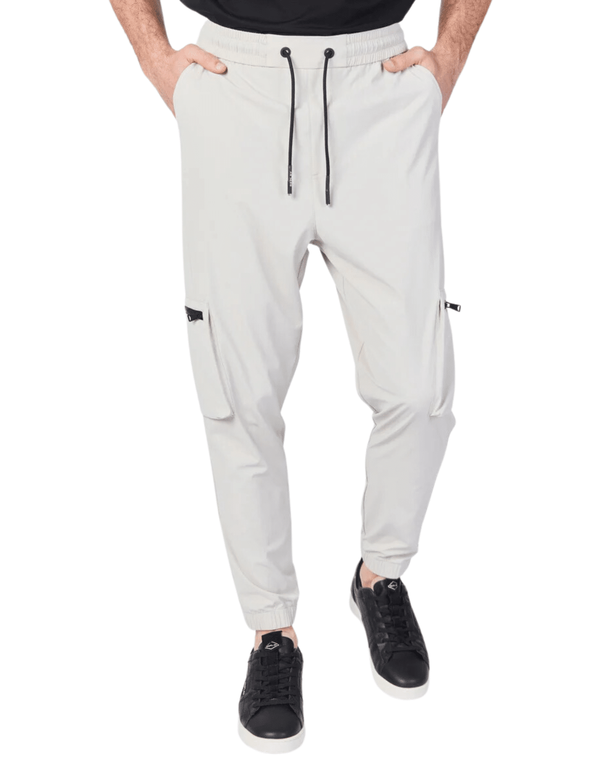 למכנסיים כיסים מרוכסנים ותווית ממותגת על הירך.