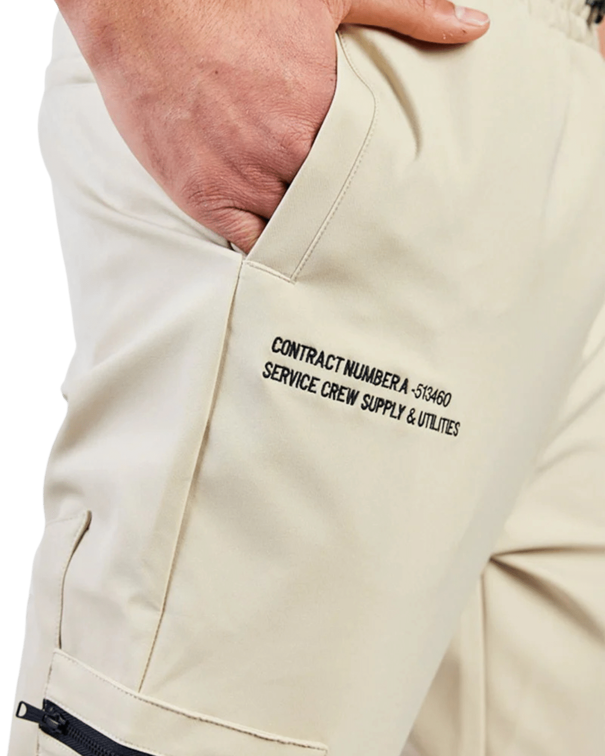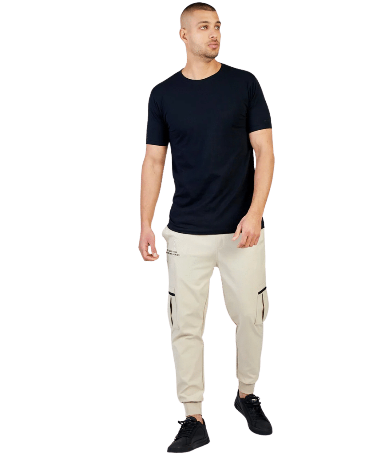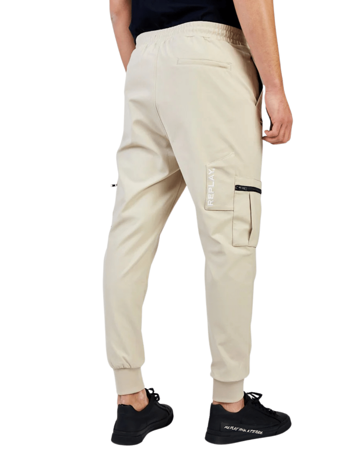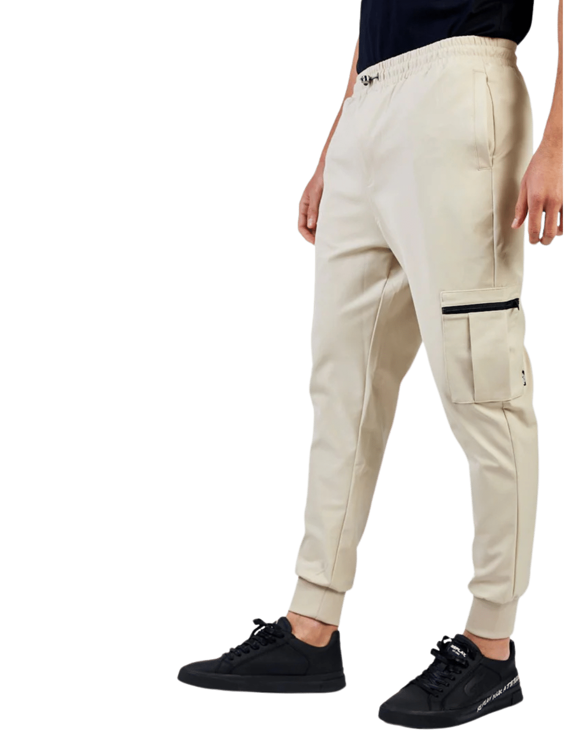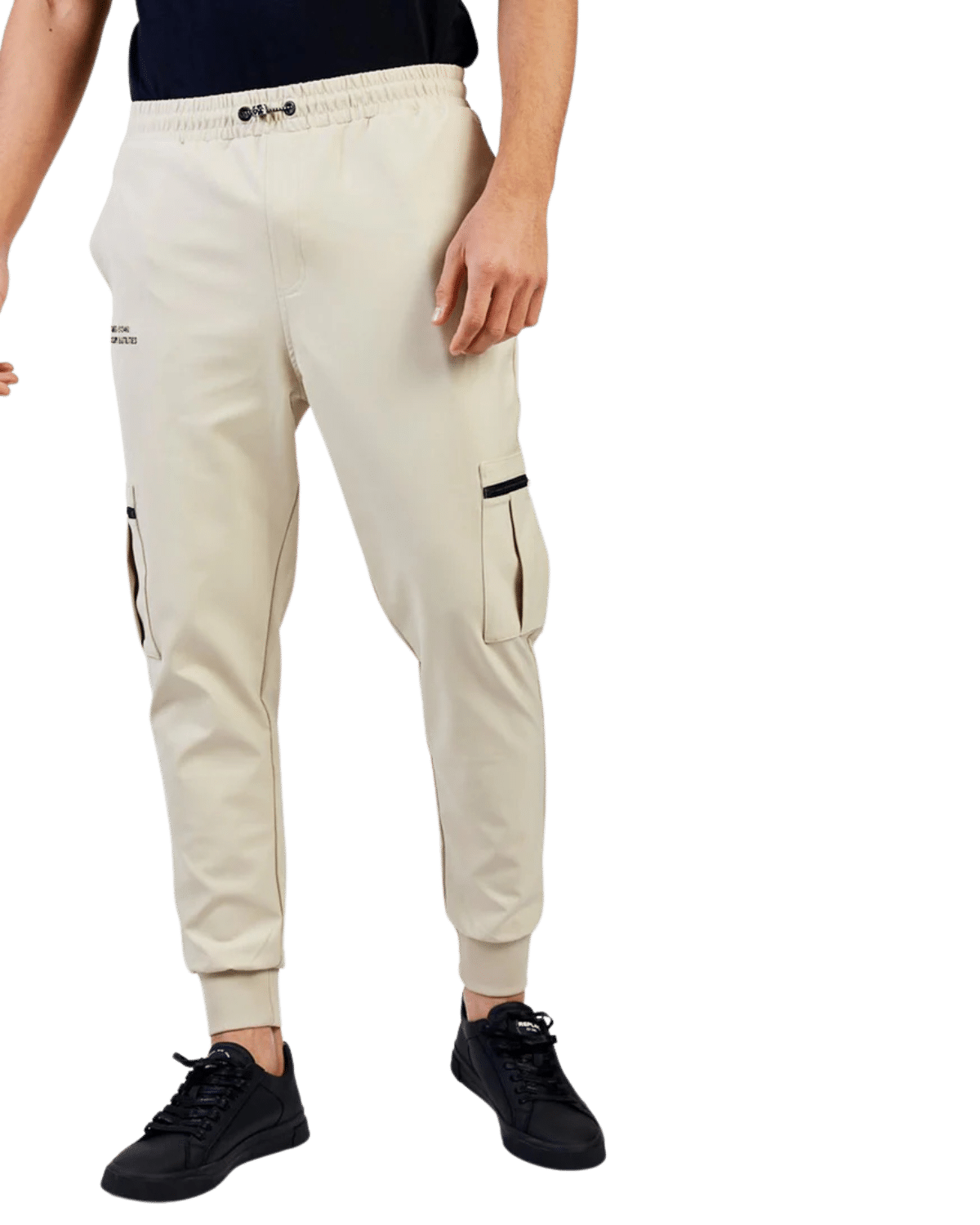 מכנסי טרנינג ניילון ארוכים עם חמישה כיסים. למכנסיים גומי אלסטי במותן וריב במכפלות.