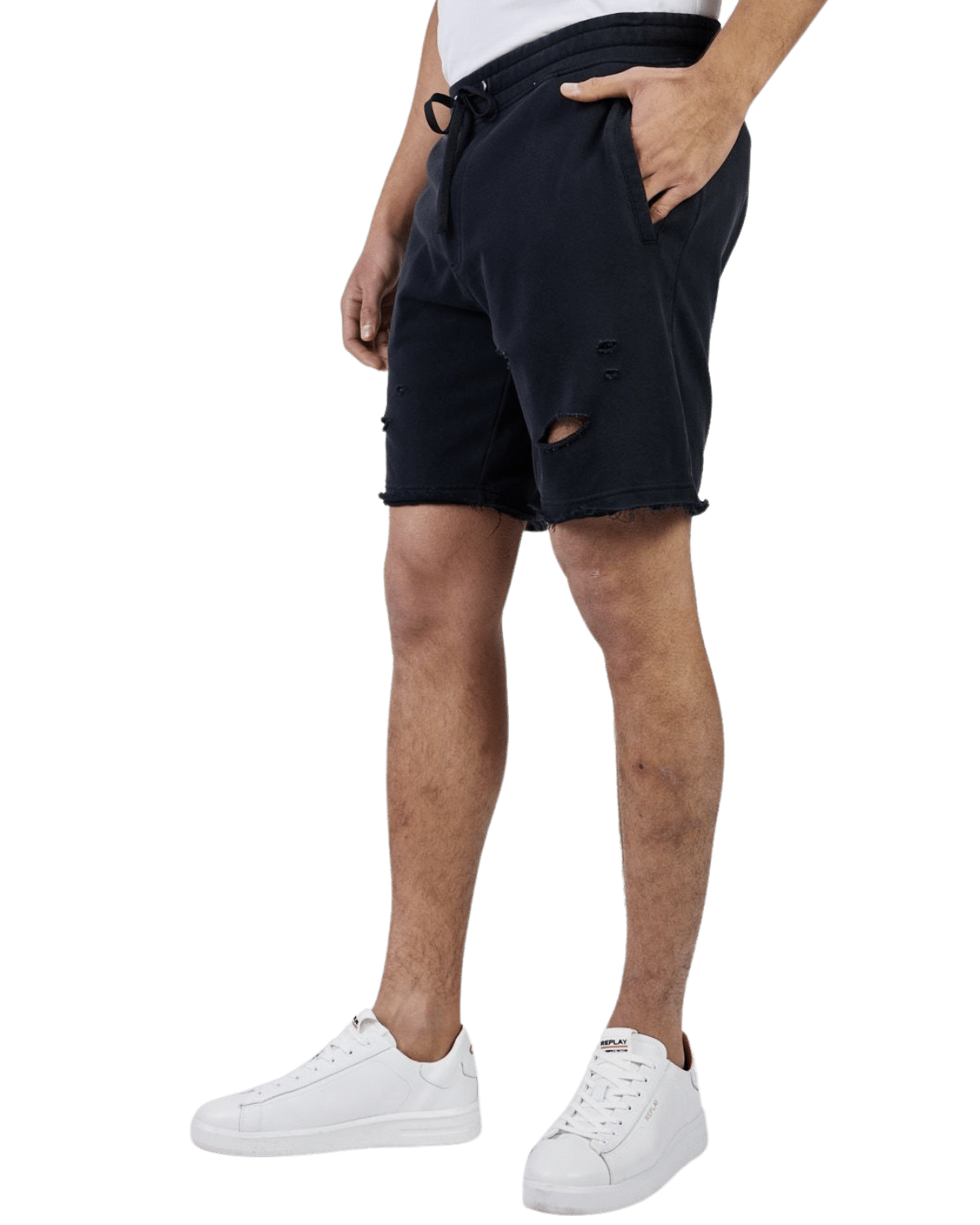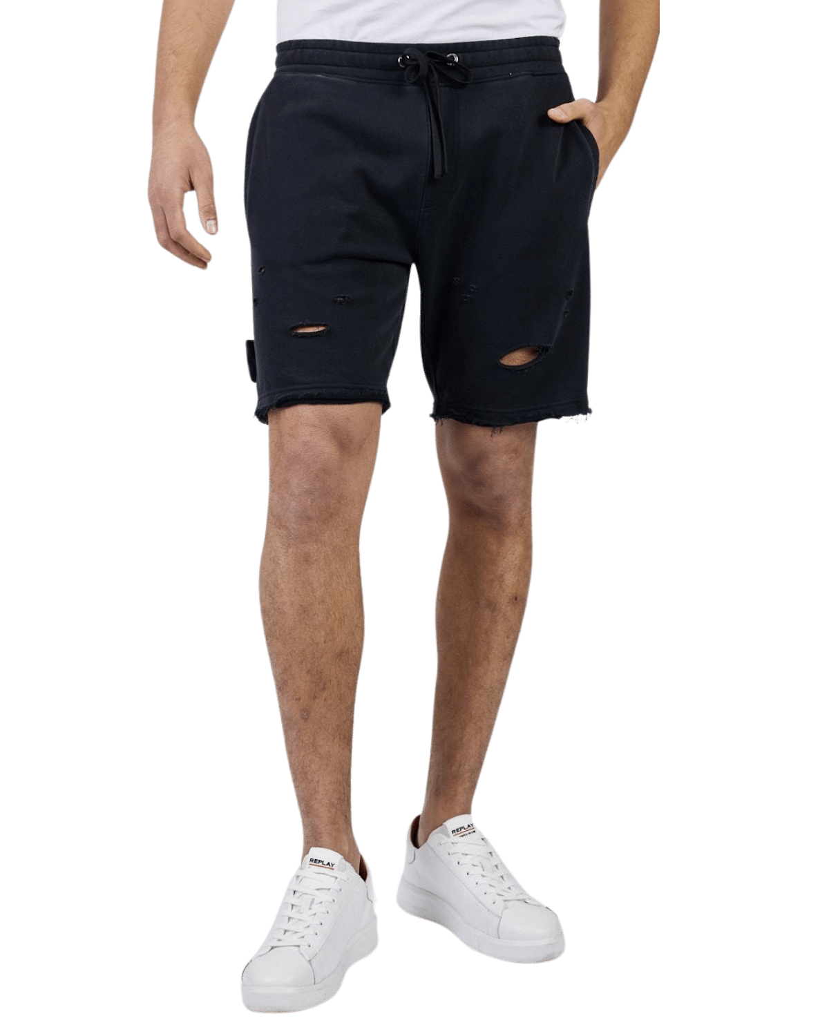 מכנסי טרנינג קצרים בגזרה רחבה. למכנסיים מותן אלסטית עם שרוכים לקשירה וכיסים צידיים.