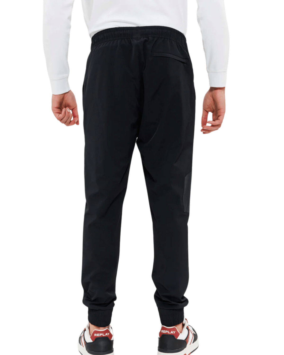 מכנסי נילון לגברים בגוון שחור, עשויים מבד נעים וגמיש, עם עיצוב מודרני.