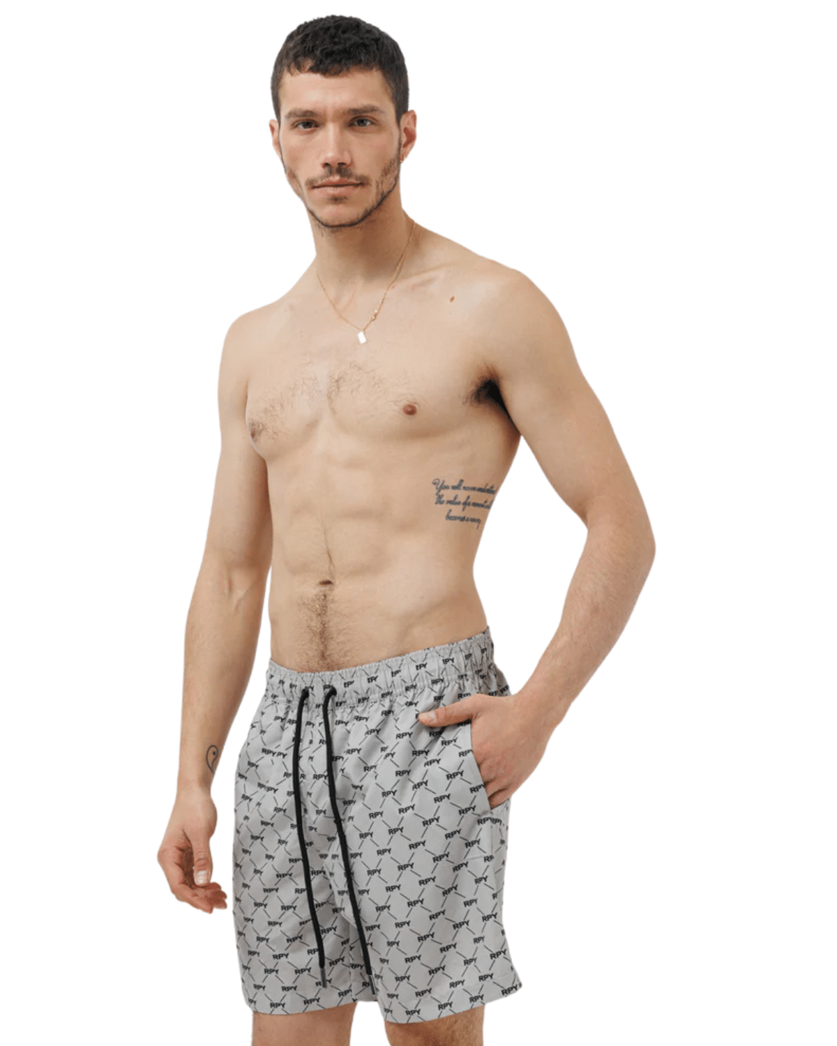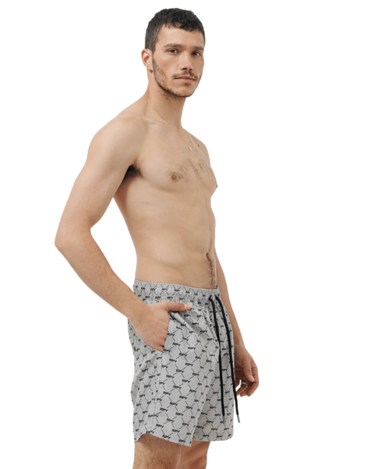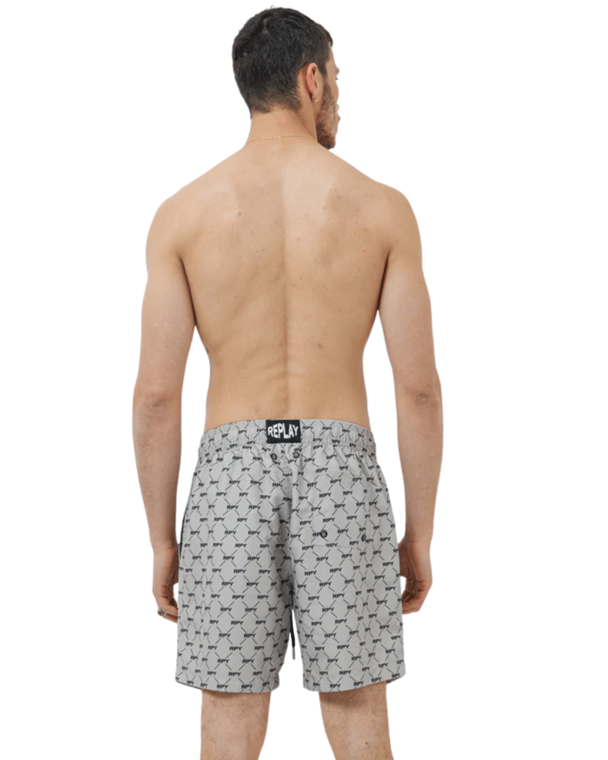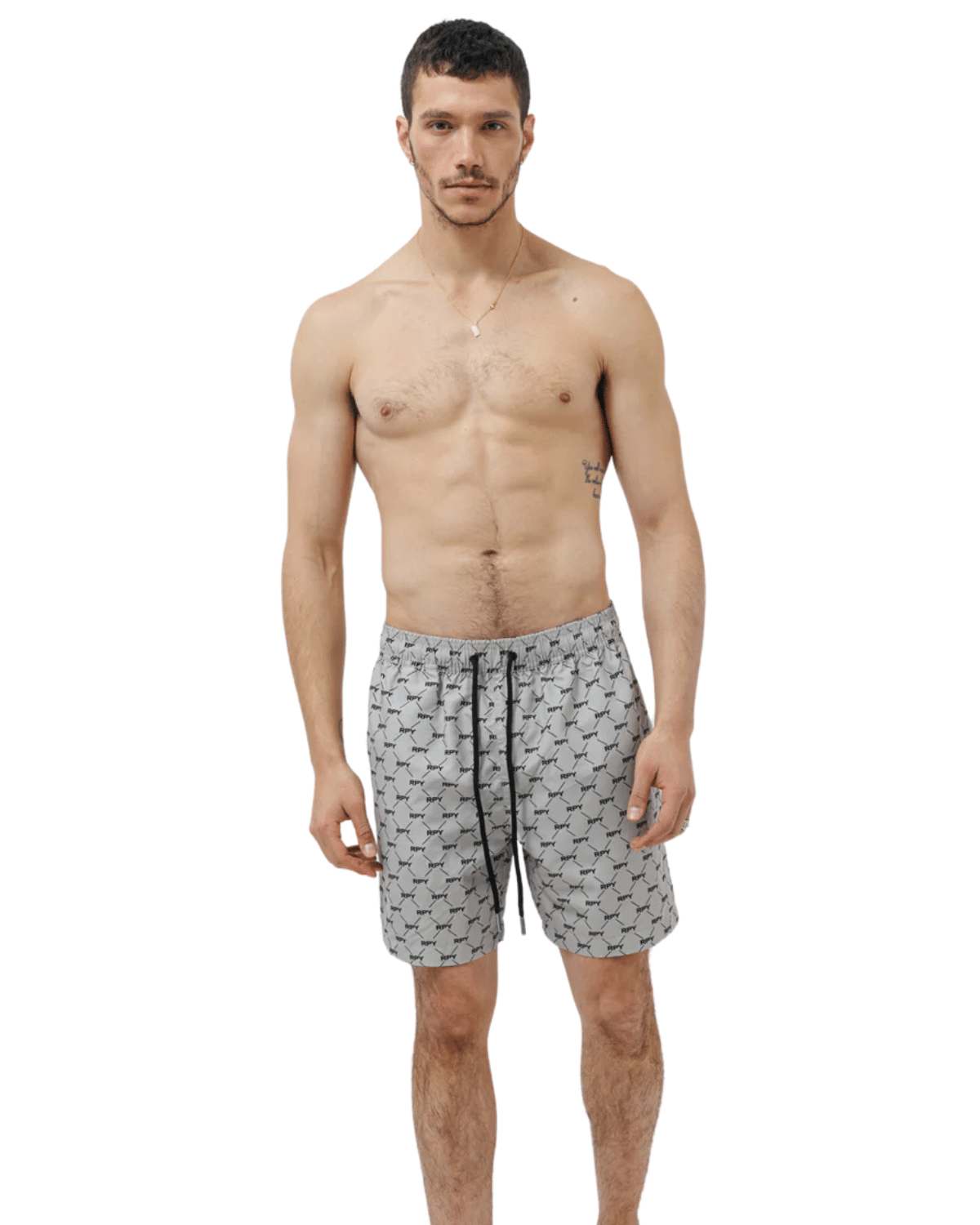 שורט ים לגברים בצבע אפור עם דפוס שחור ייחודי, בעיצוב שמשלב קלילות קייצית עם ניחוח איטלקי יוקרתי.