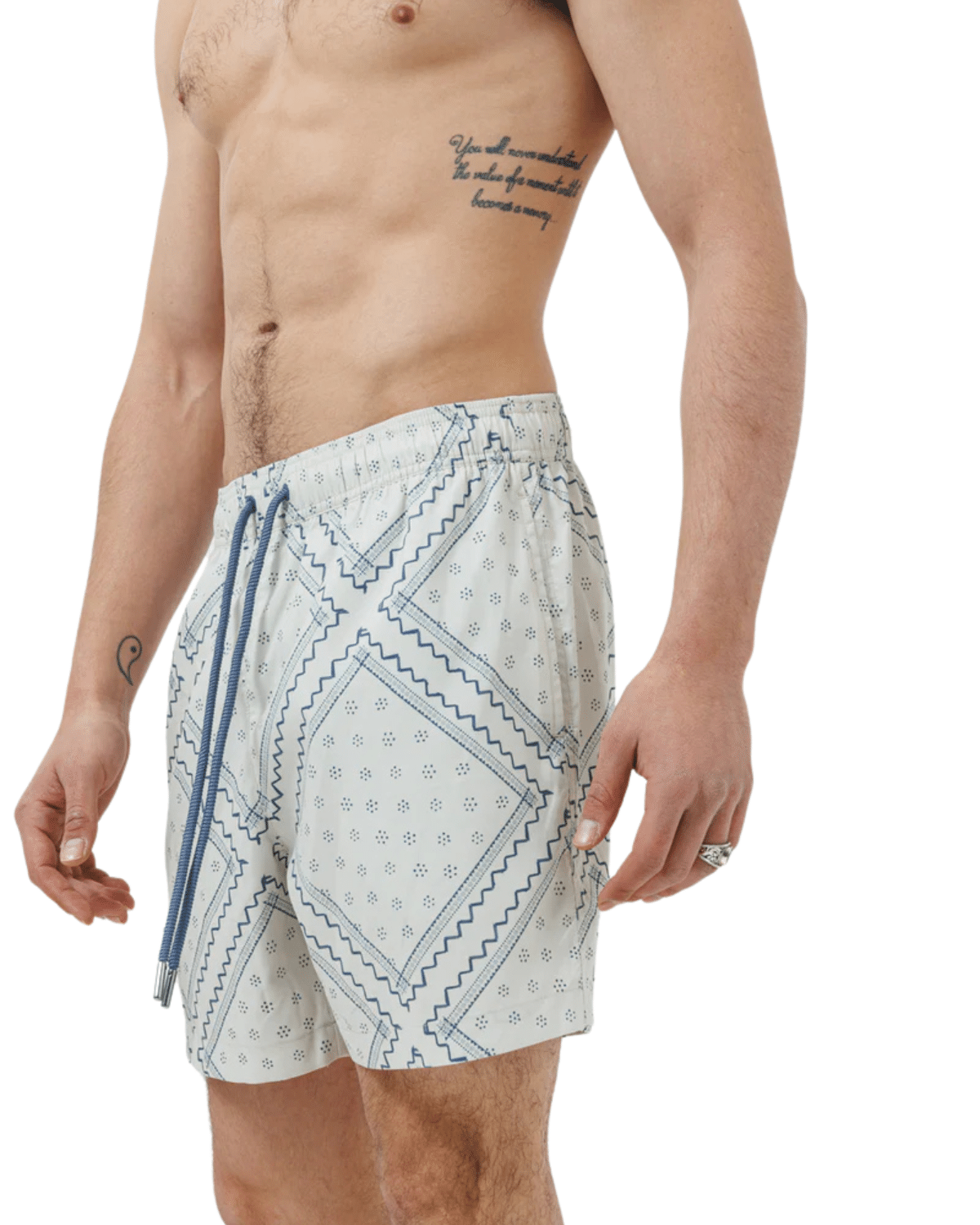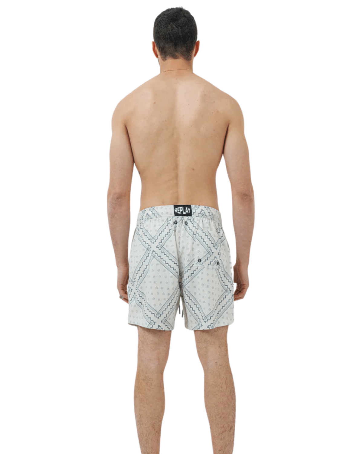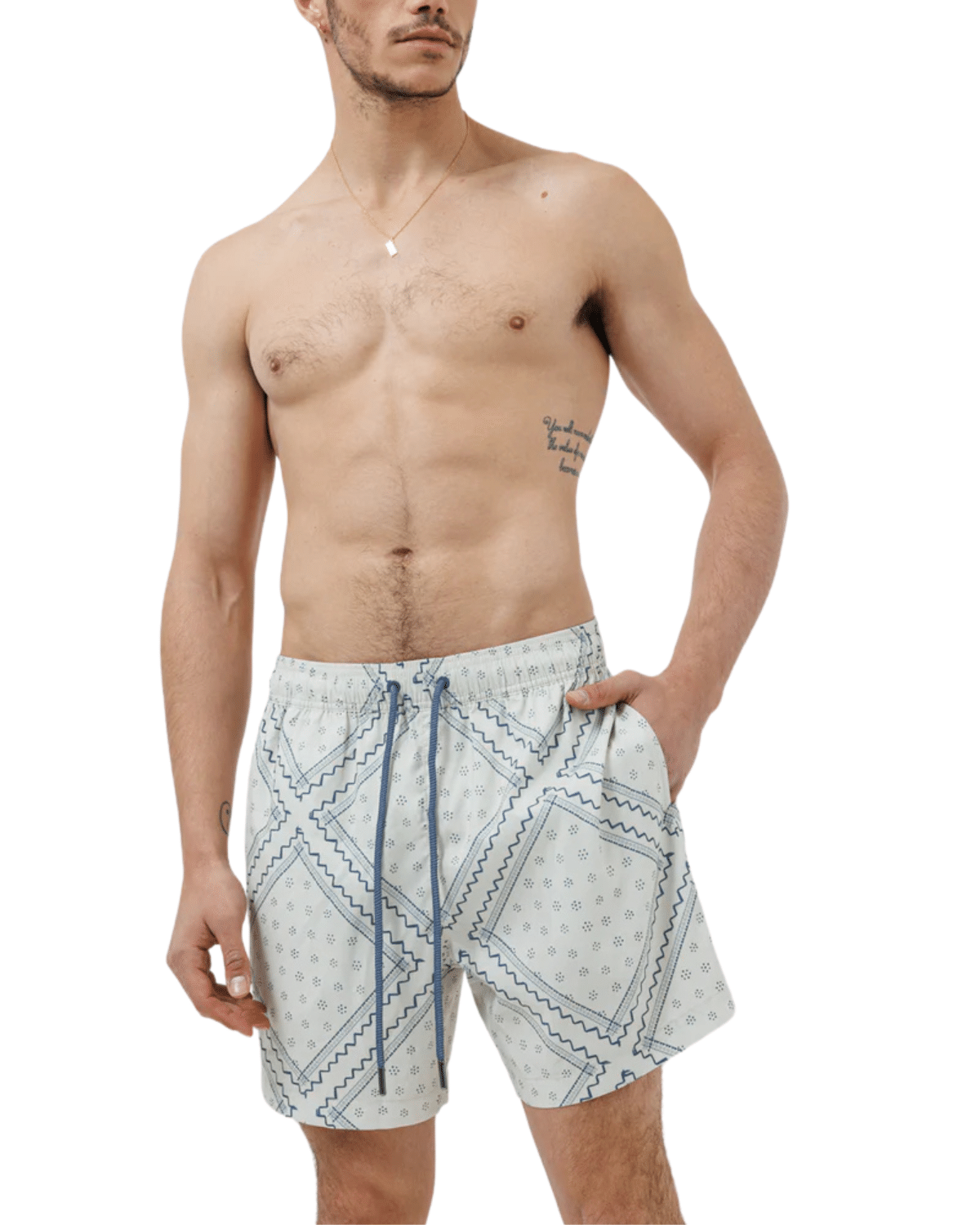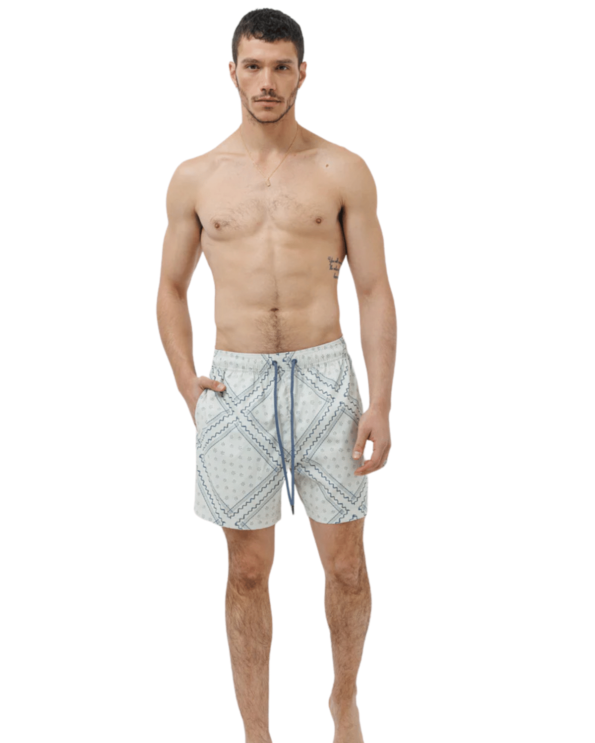 שורט ים לגברים בצבע לבן עם דפוס תכלת עדין ומרענן, בעיצוב שמשלב קלילות קייצית עם ניחוח איטלקי יוקרתי.