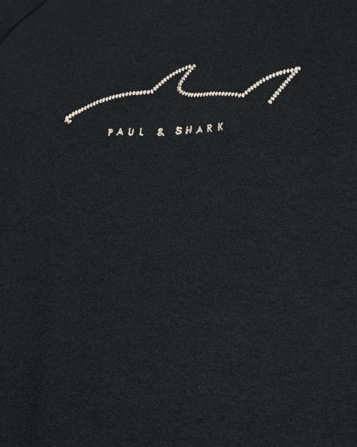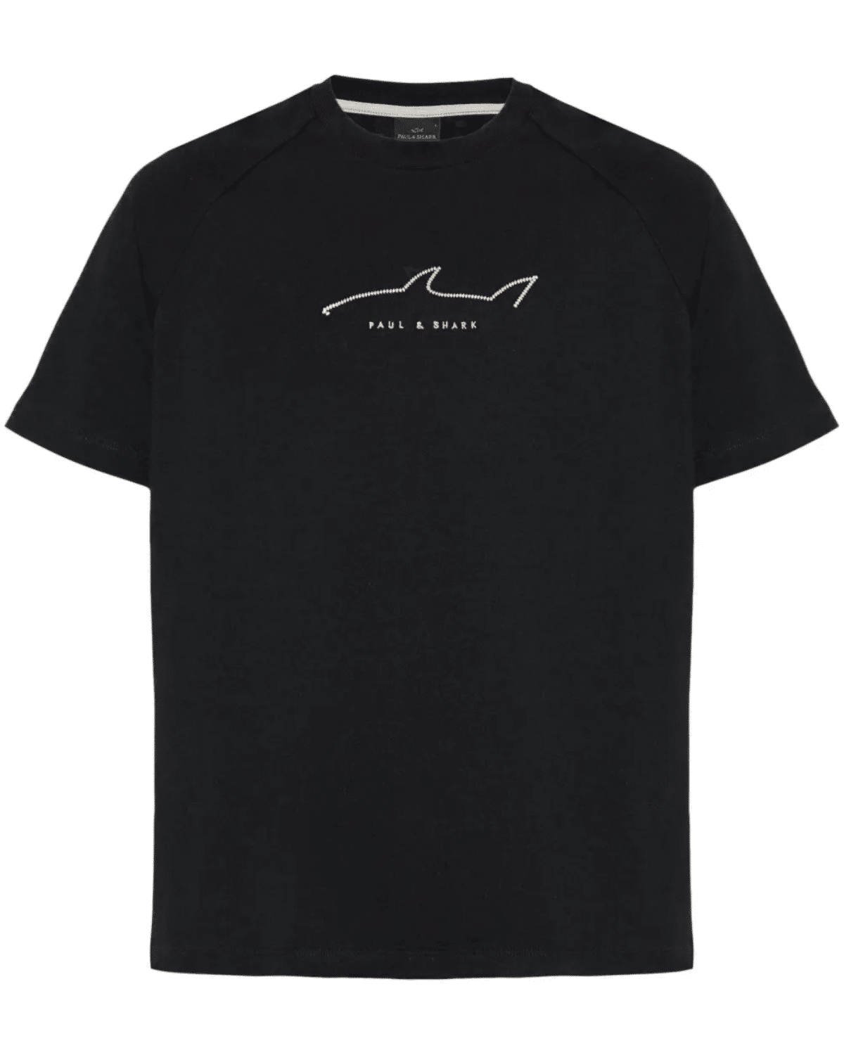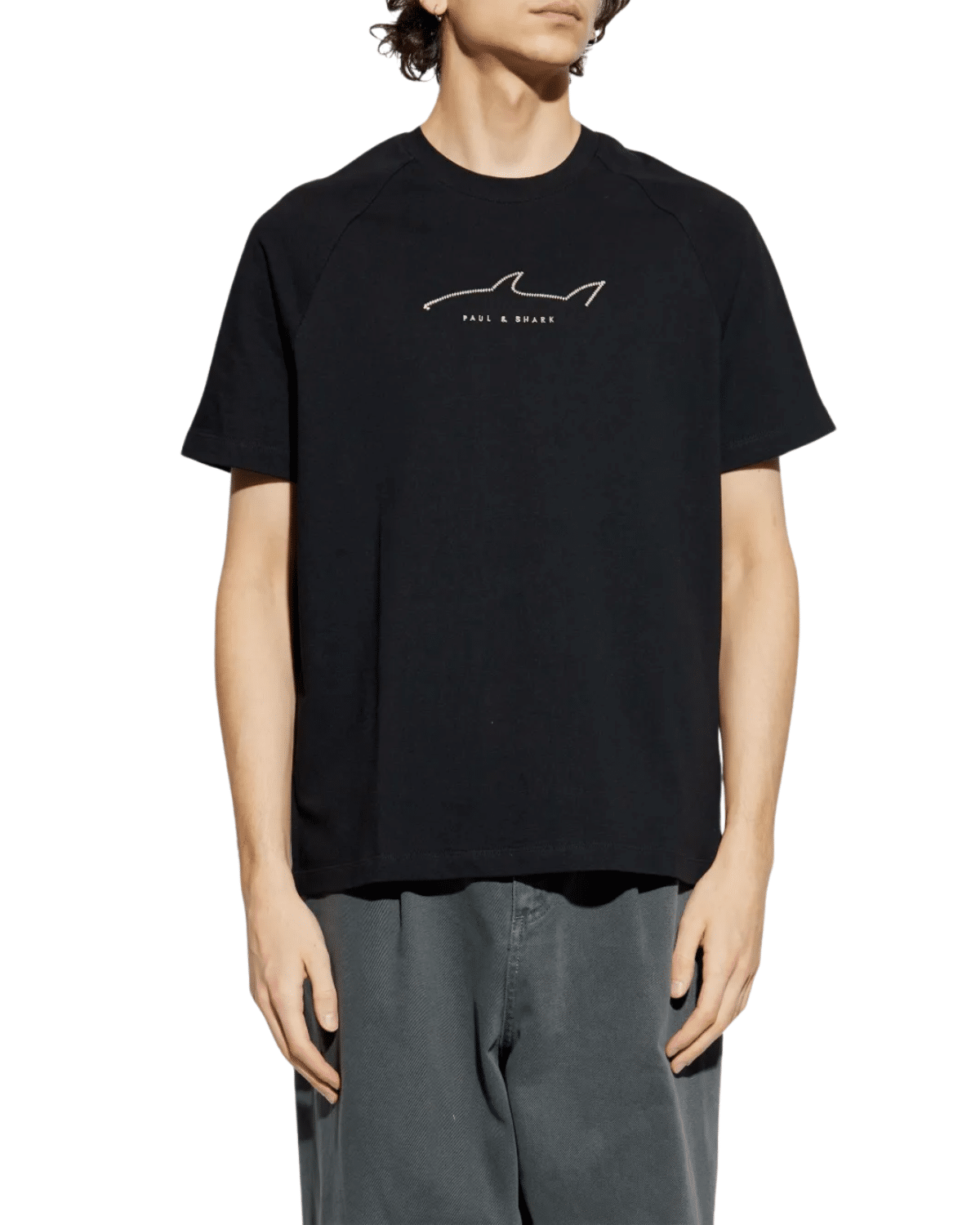 חולצה קצרה לגברים בצבע שחור עם לוגו המותג מקדימה, המשלבת סגנון אלגנטי עם נוחות יומיומית.