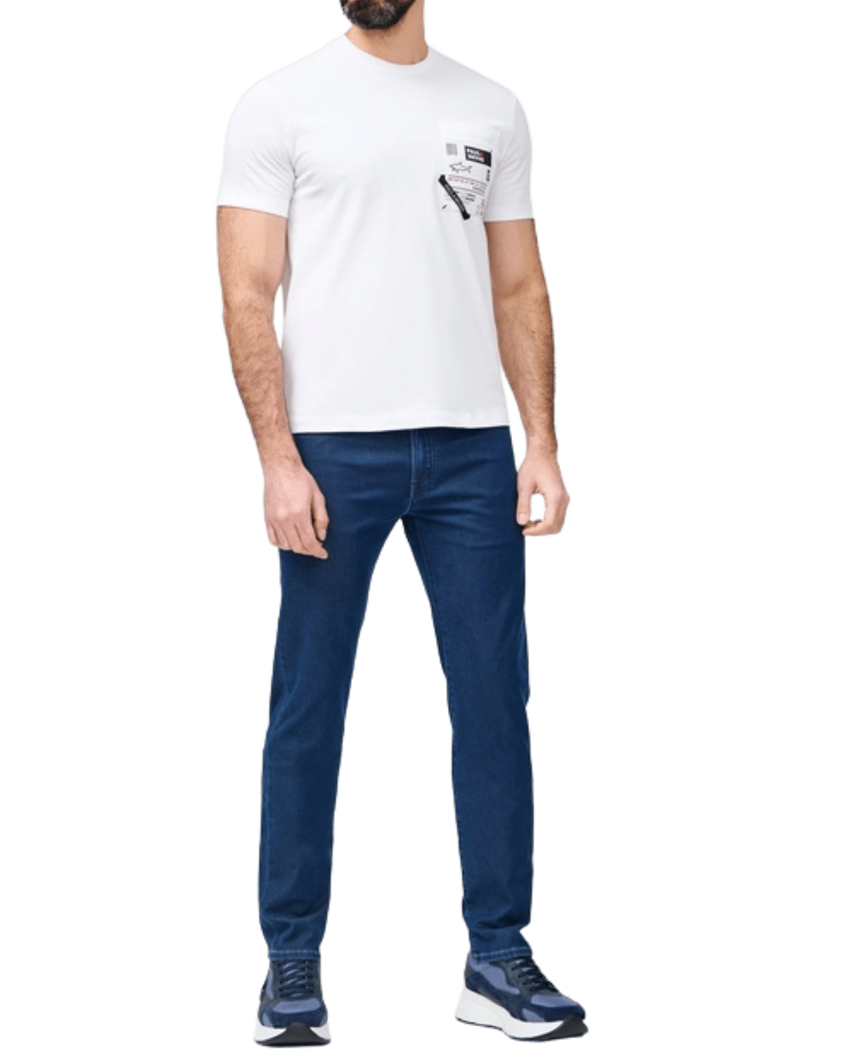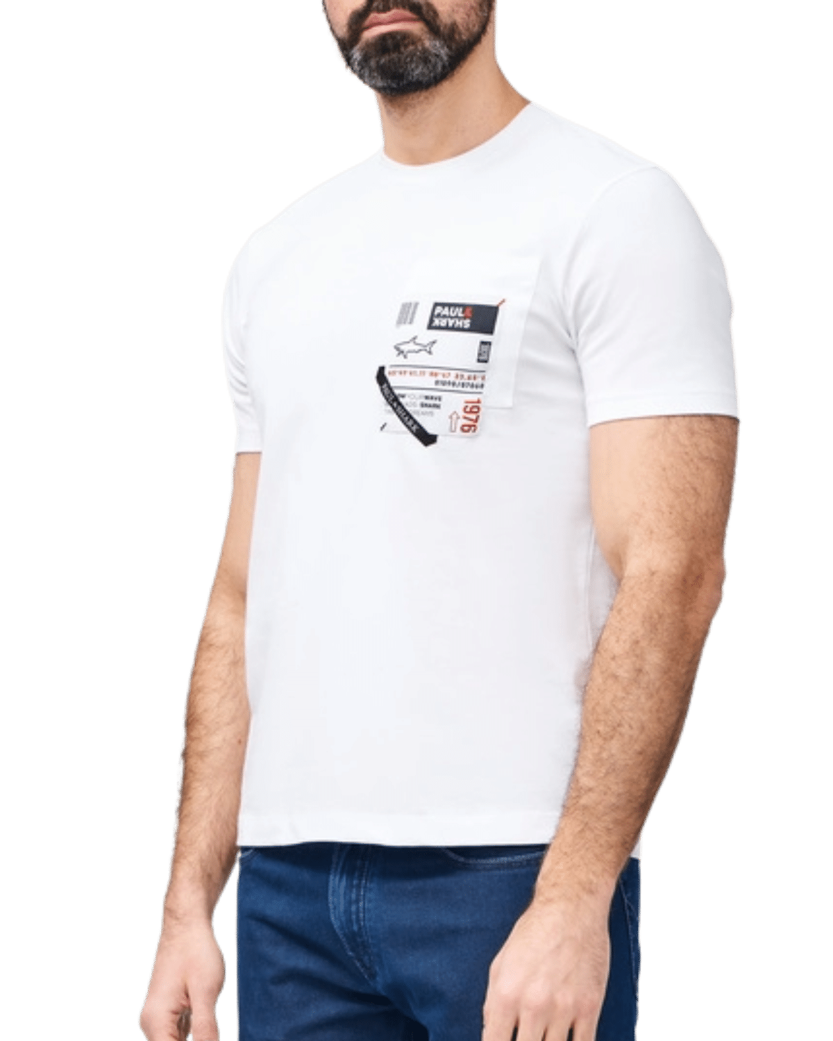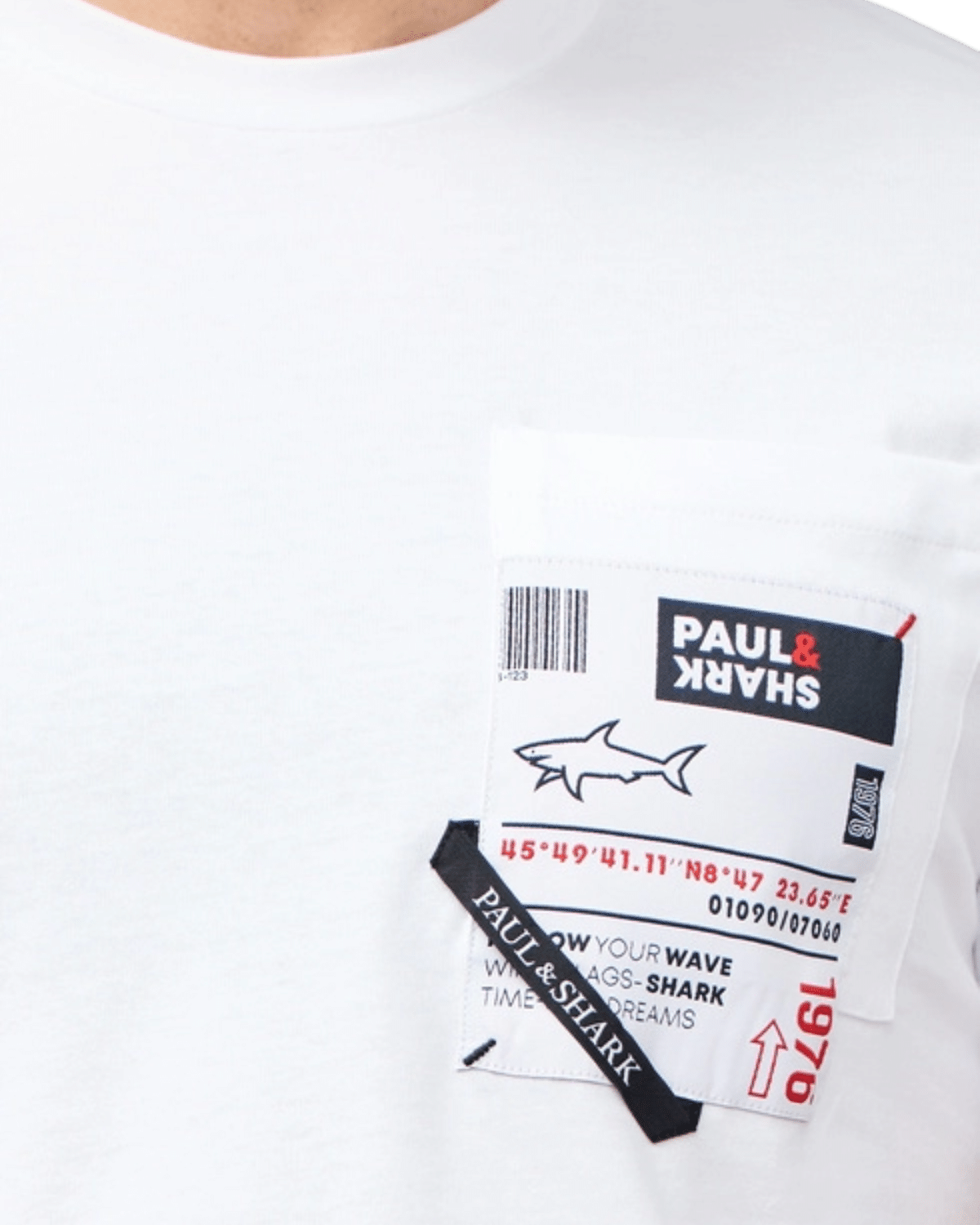 בחזית החולצה, באזור החזה השמאלי, מופיע כיס מעוצב עם הדפסים גרפיים הכוללים כיתובים בסגנון מודרני ולוגו קטן המוסיף טאץ’ ייחודי ויוקרתי.