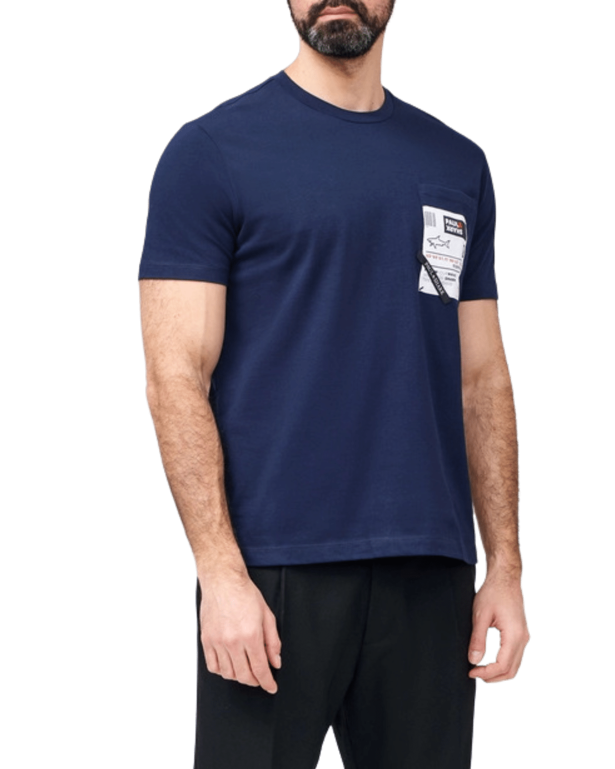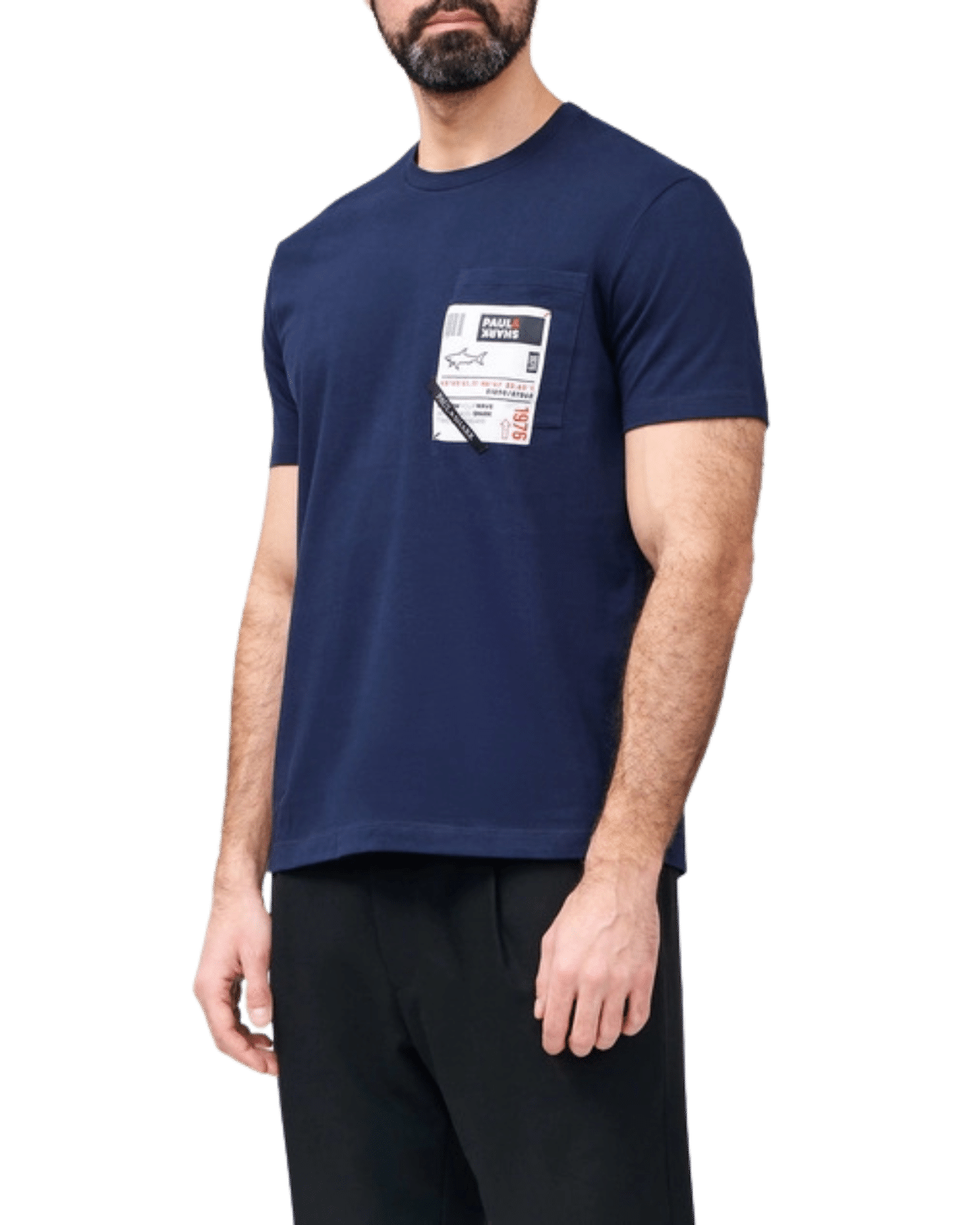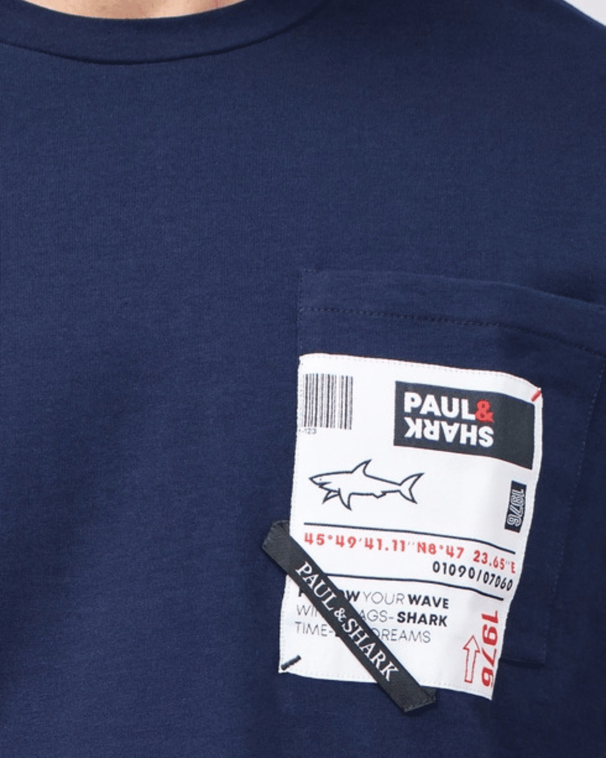 בחזית החולצה, באזור החזה השמאלי, מופיע כיס מעוצב עם הדפסים גרפיים הכוללים כיתובים בסגנון מודרני ולוגו קטן המוסיף טאץ’ ייחודי ויוקרתי.