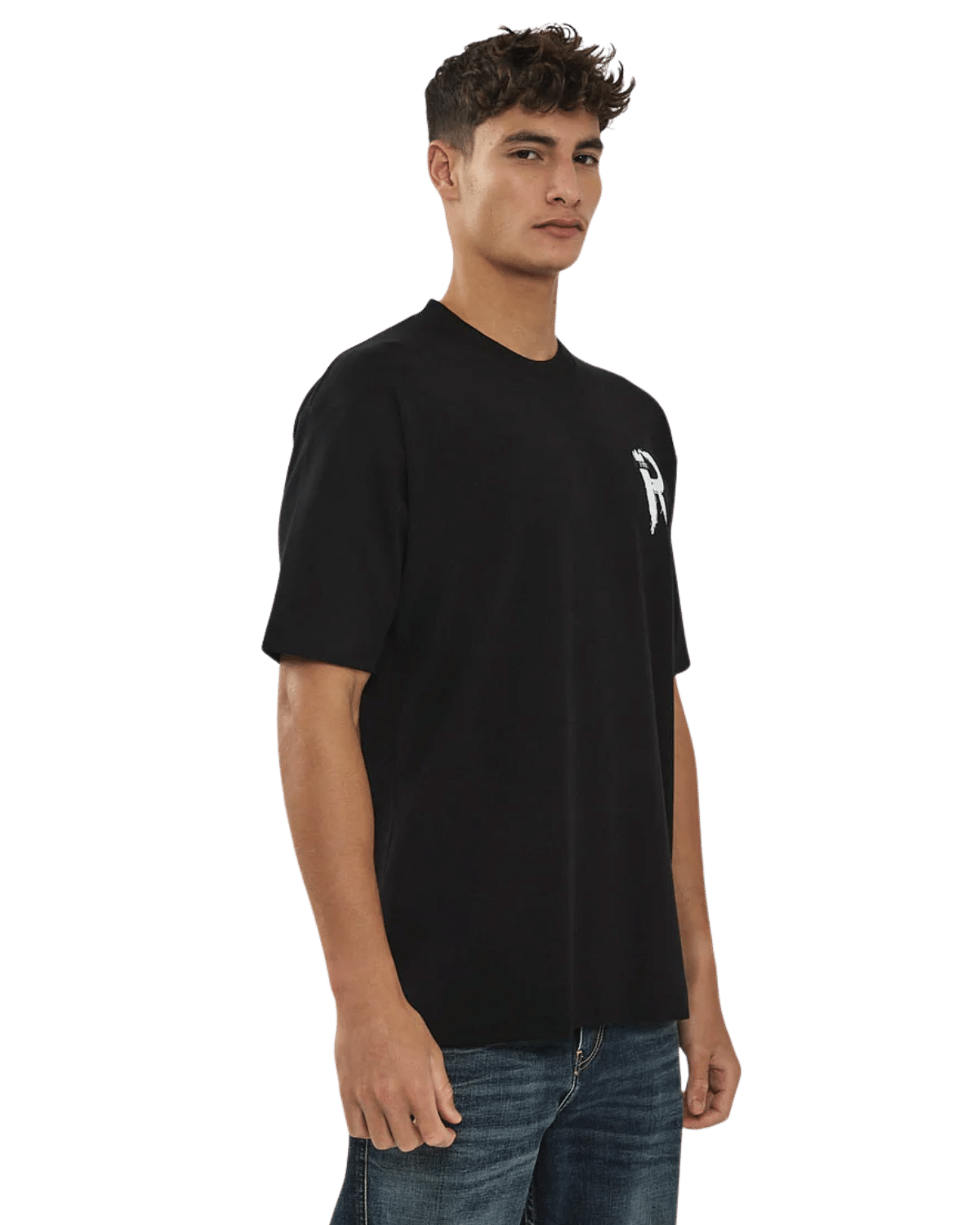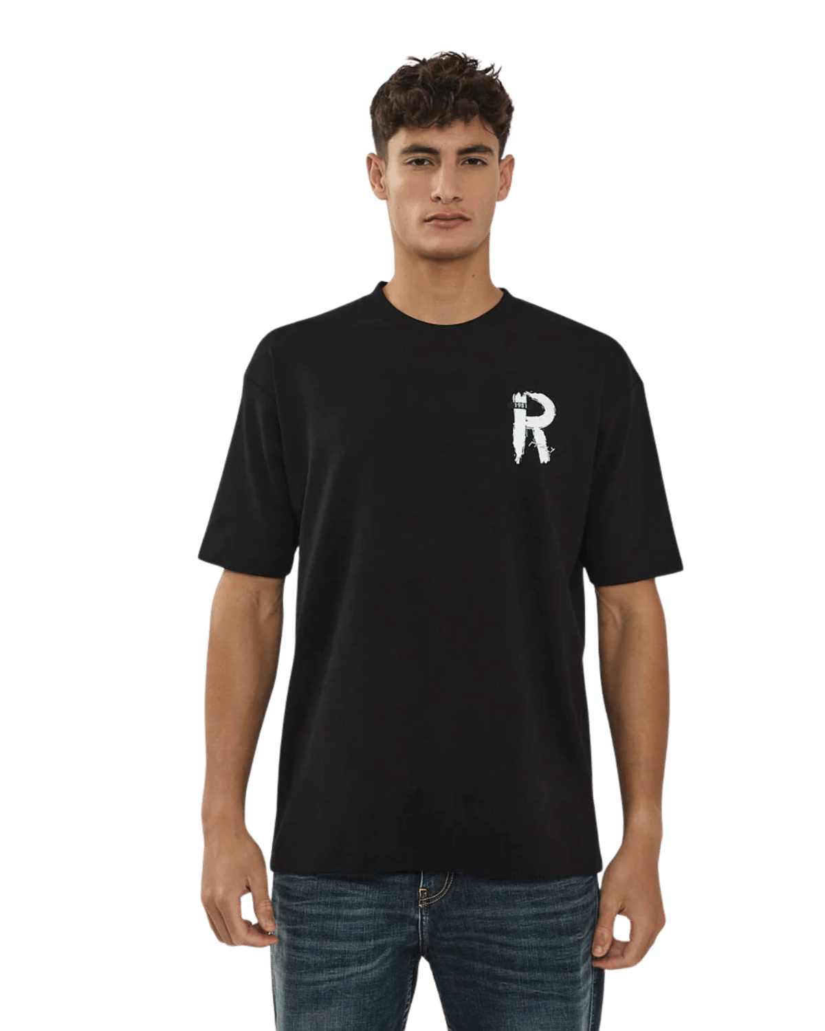 החולצה מעוצבת בסגנון אורבני מודרני עם הדפס לוגו R לבן בחזית, המעניק לה מראה צעיר ואופנתי.