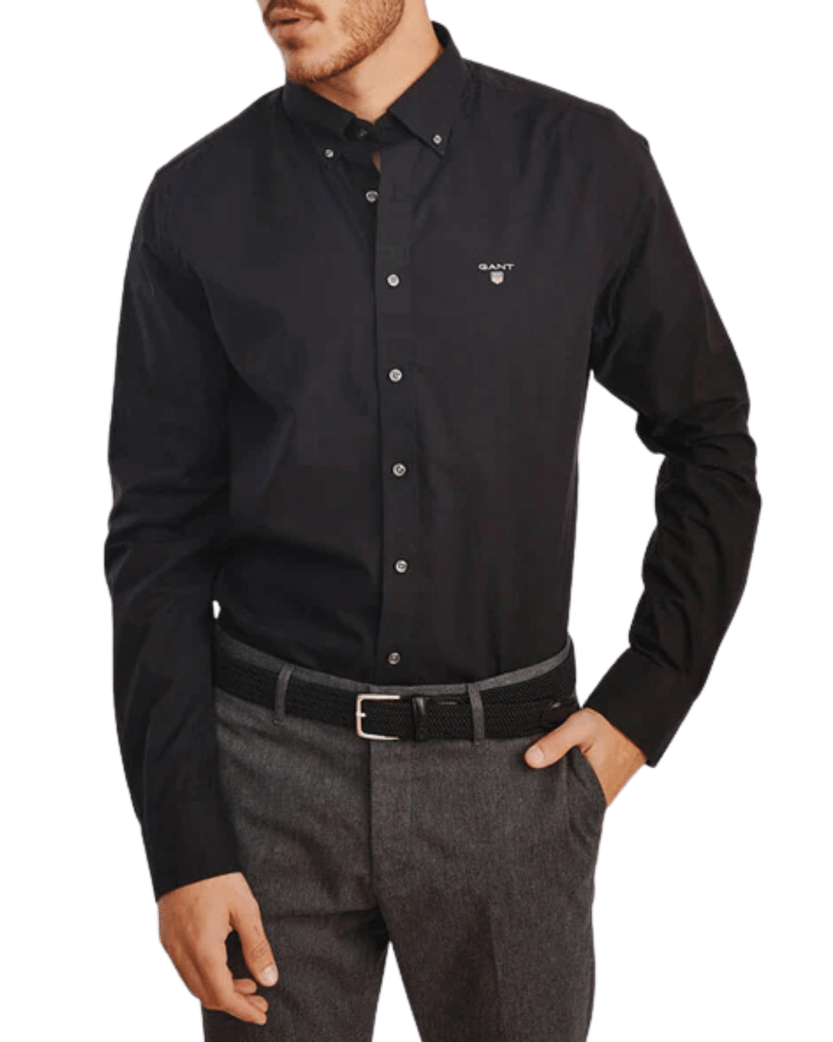 חולצה קלאסית מכופתרת בגוון שחור, עם מראה אלגנטי שמתאים למגוון רחב של סגנונות לבוש.