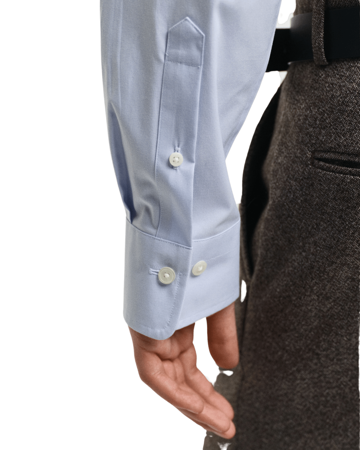 החולצה בנויה עם צווארון נקודתי קלאסי, מפורטת עם מכפלת מעוקלת, חפתים מתכווננים וקיפול מסודר בכסף.