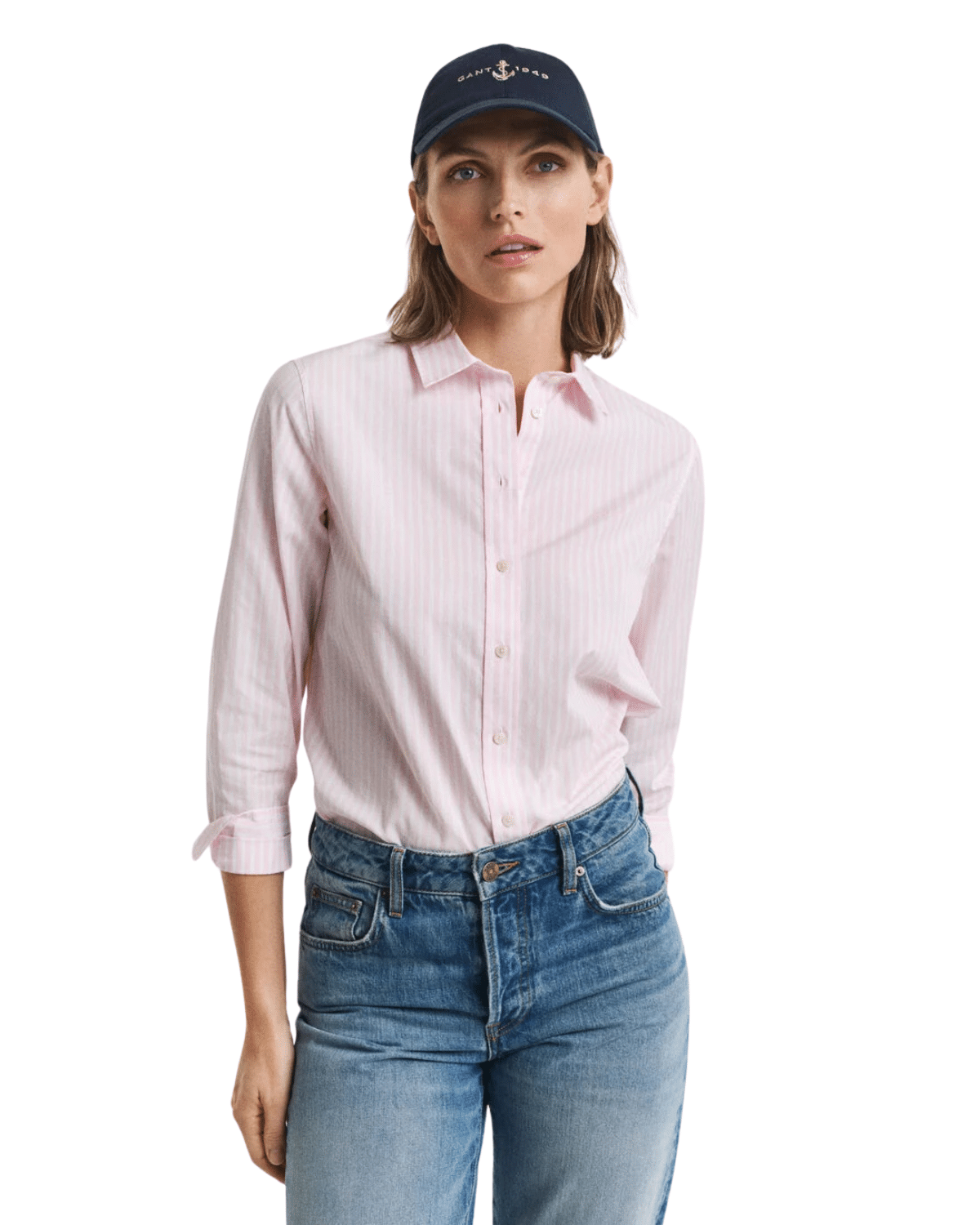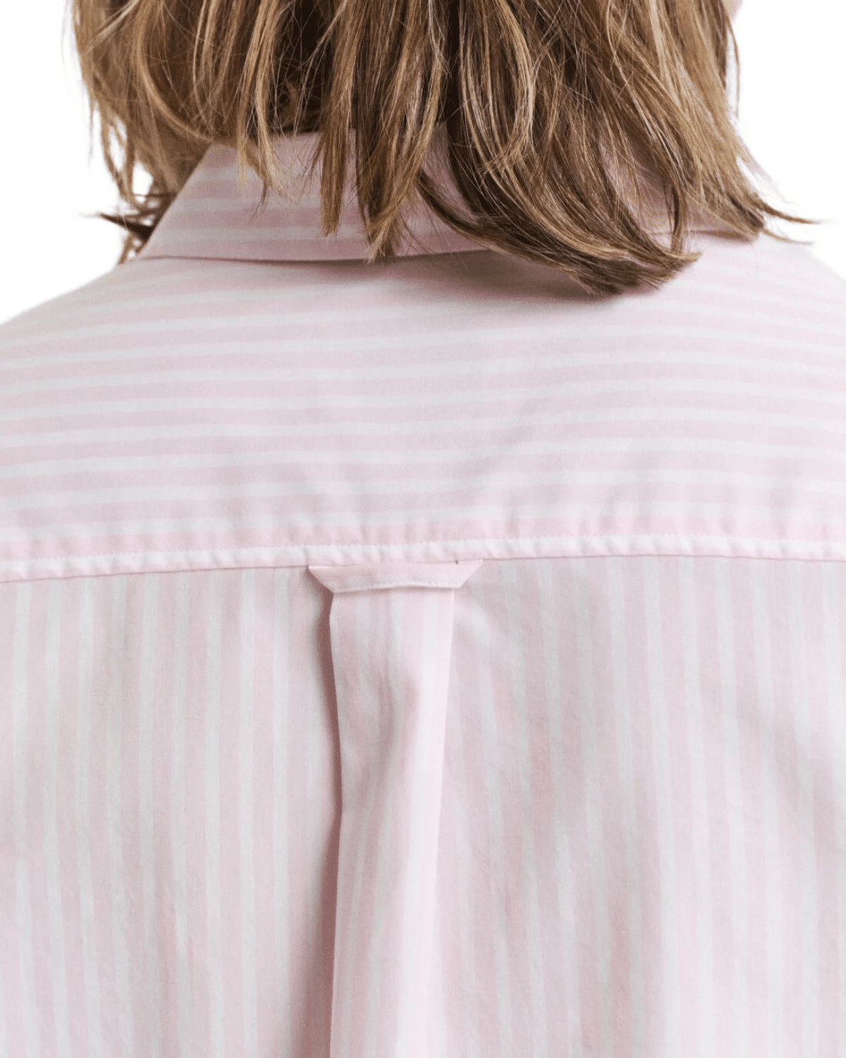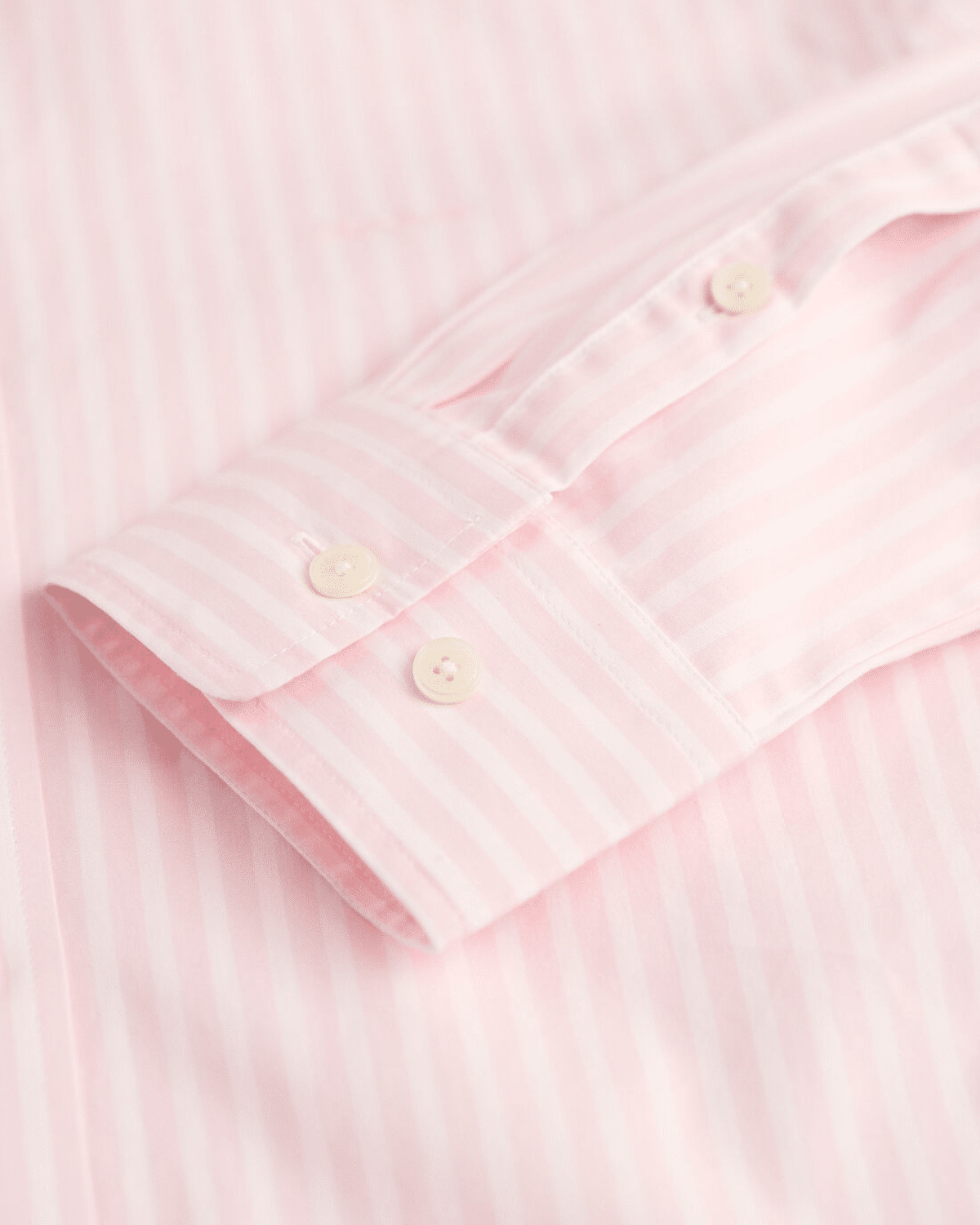 חולצה מכופתרת לנשים בצבע ורוד בהיר עם פסים דקים בצבע לבן, המשלבת עיצוב נשי אלגנטי עם נוחות יומיומית ורמת גימור גבוהה.