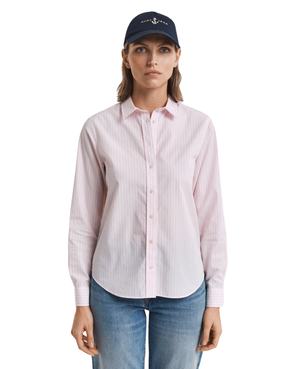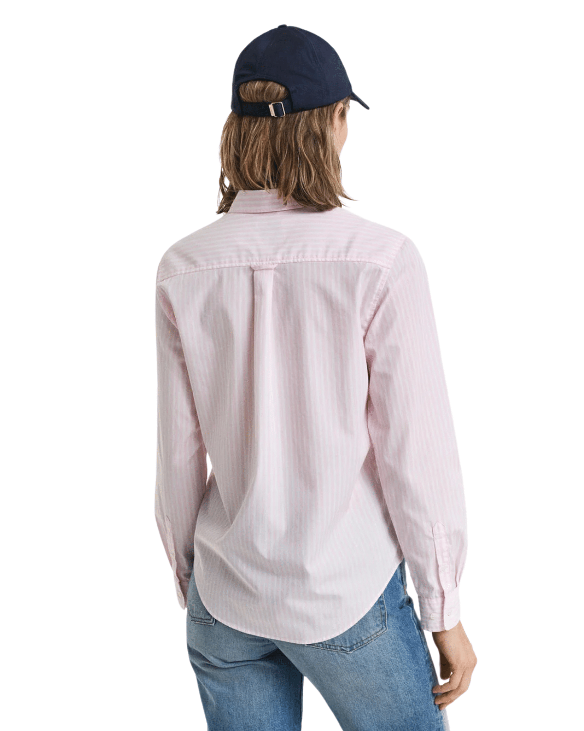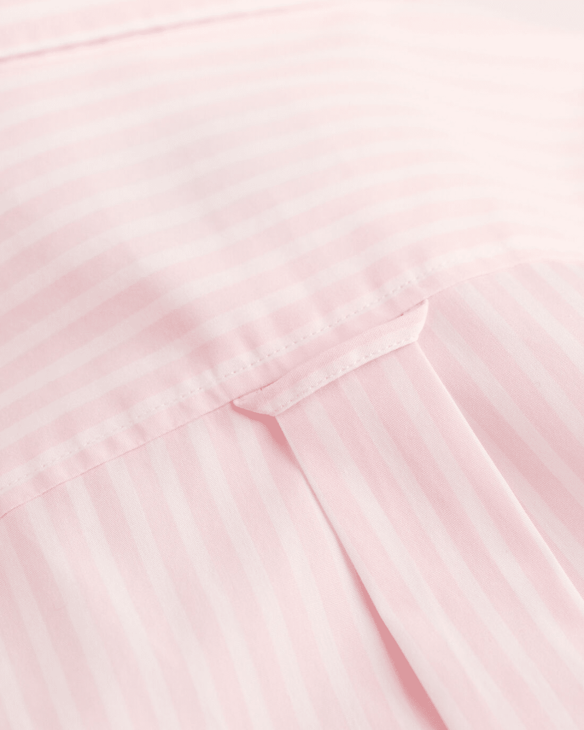 חולצה מכופתרת לנשים בצבע ורוד בהיר עם פסים דקים בצבע לבן, המשלבת עיצוב נשי אלגנטי עם נוחות יומיומית ורמת גימור גבוהה.