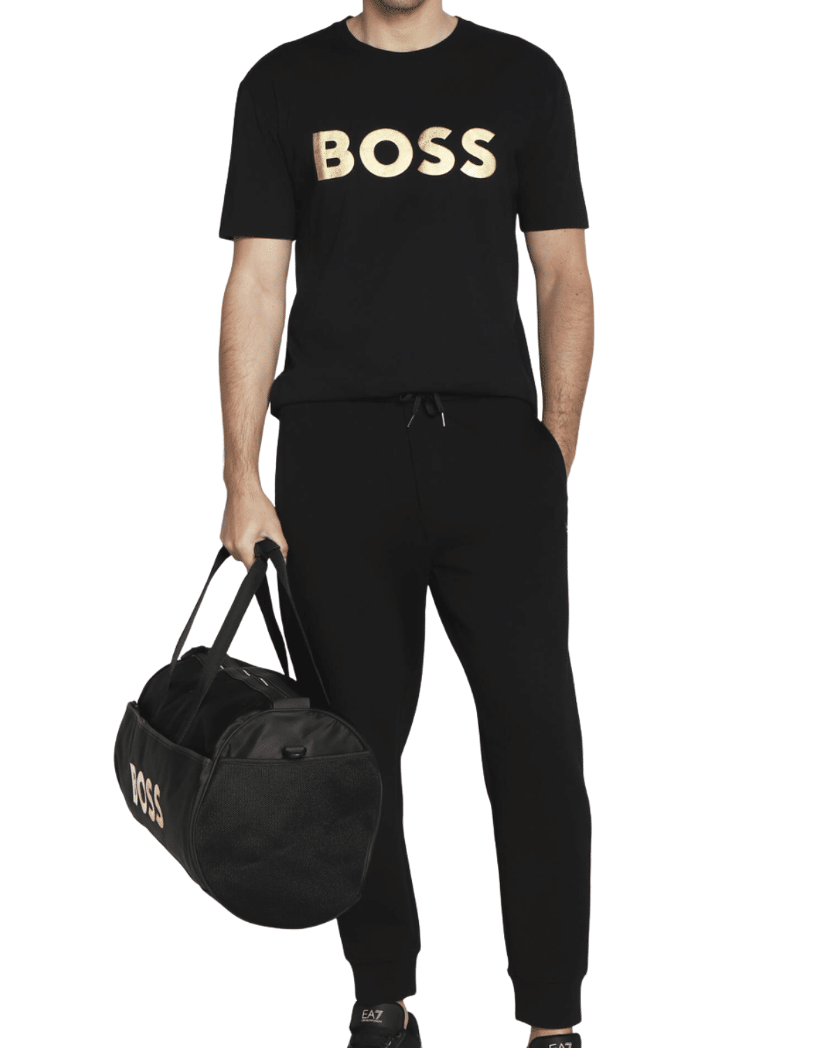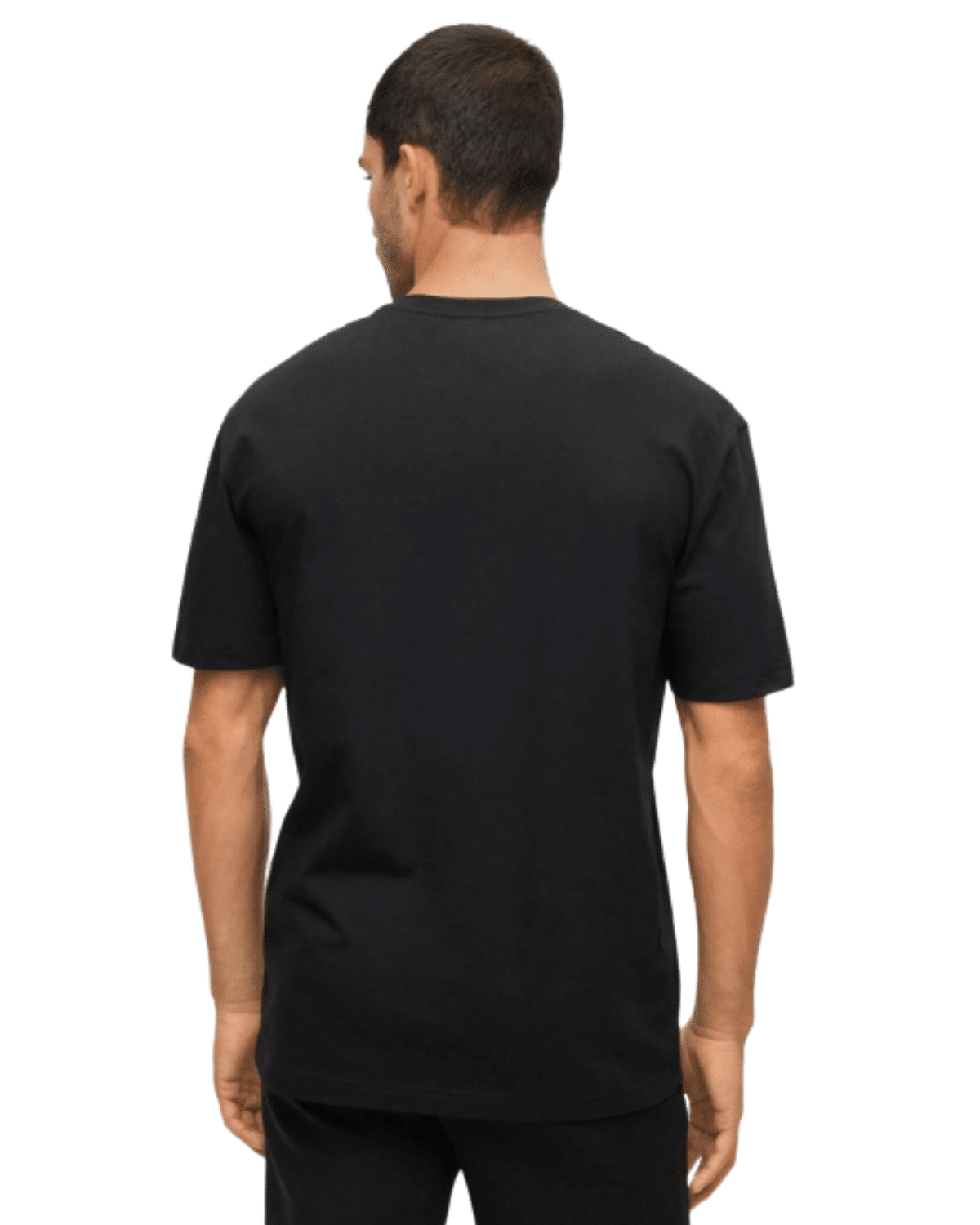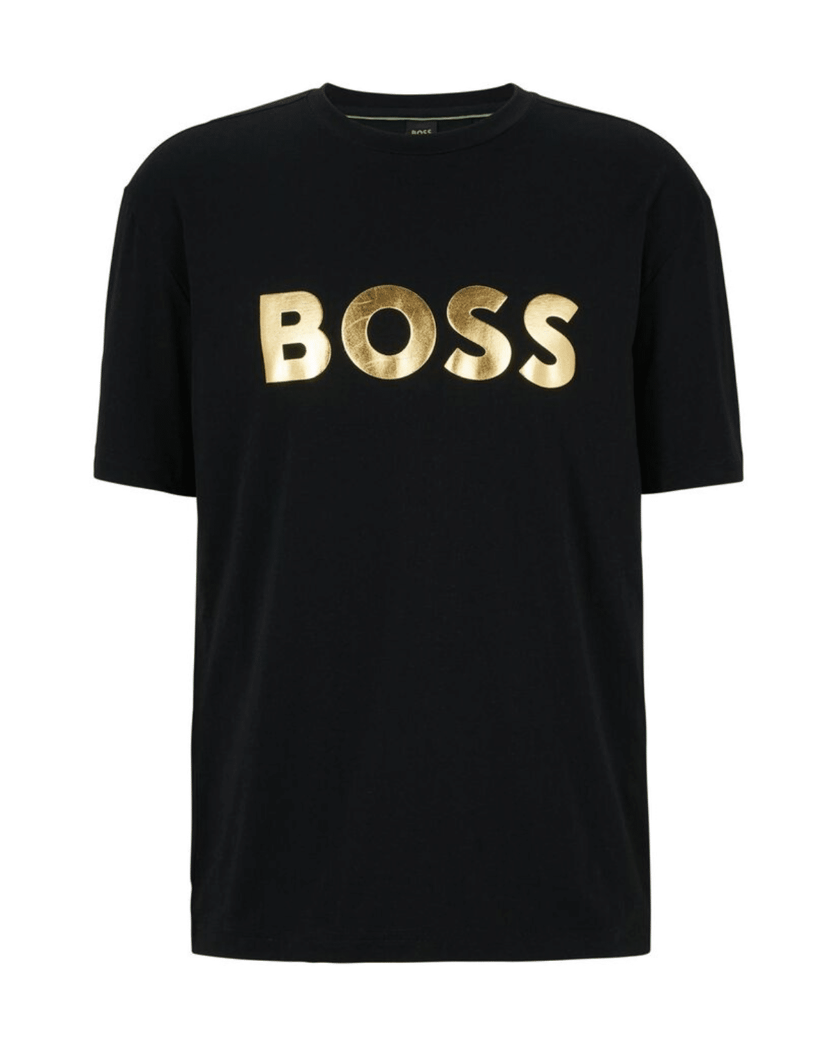 טי שירט גברים אלגנטית בצבע שחור קלאסי, המעוצבת בגזרה רגילה עם לוגו מונוגרמה של BOSS במרכז החזה. העיצוב משלב אלמנט גרפי מודרני עם סגנון נקי ונוח ללבישה.