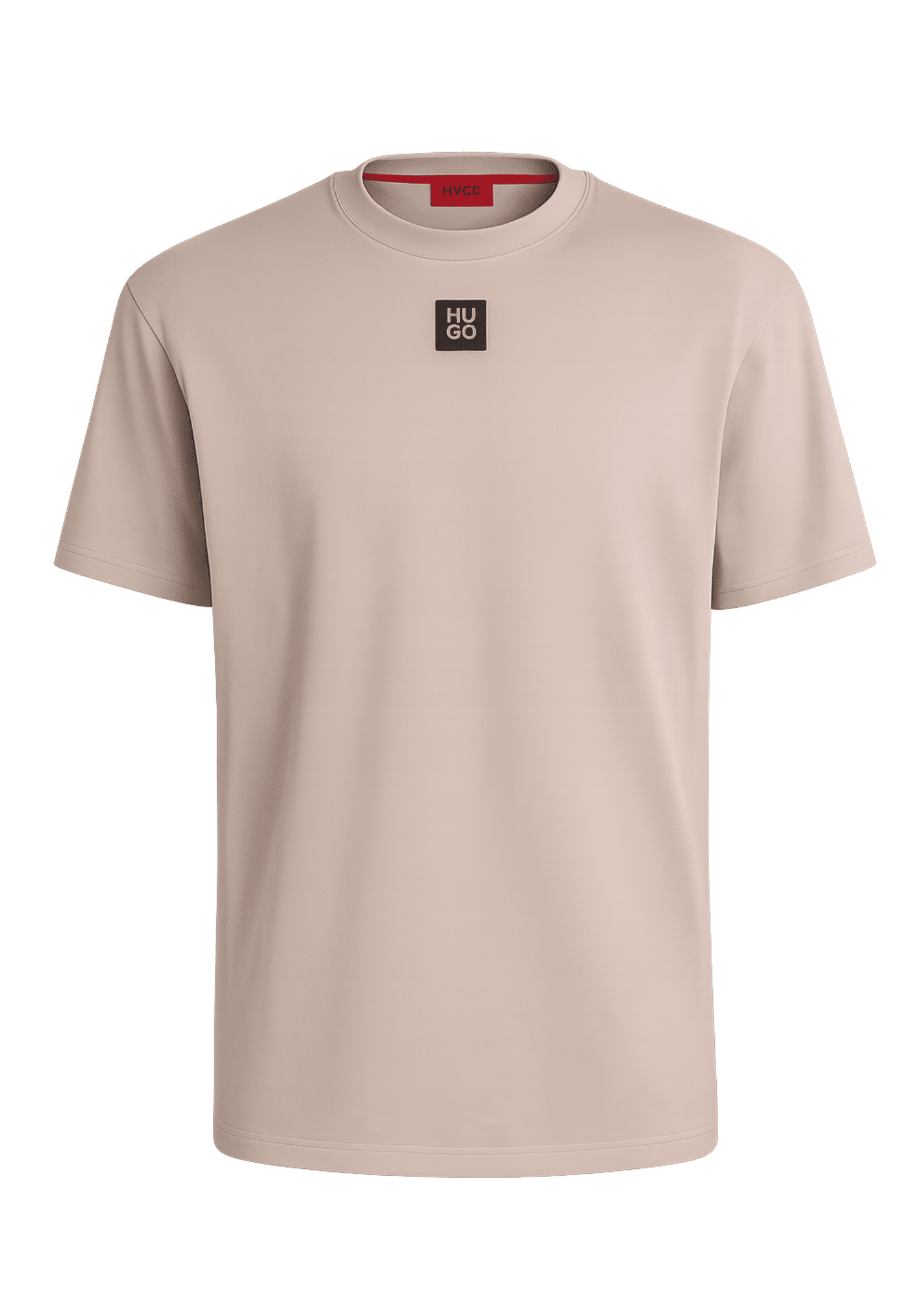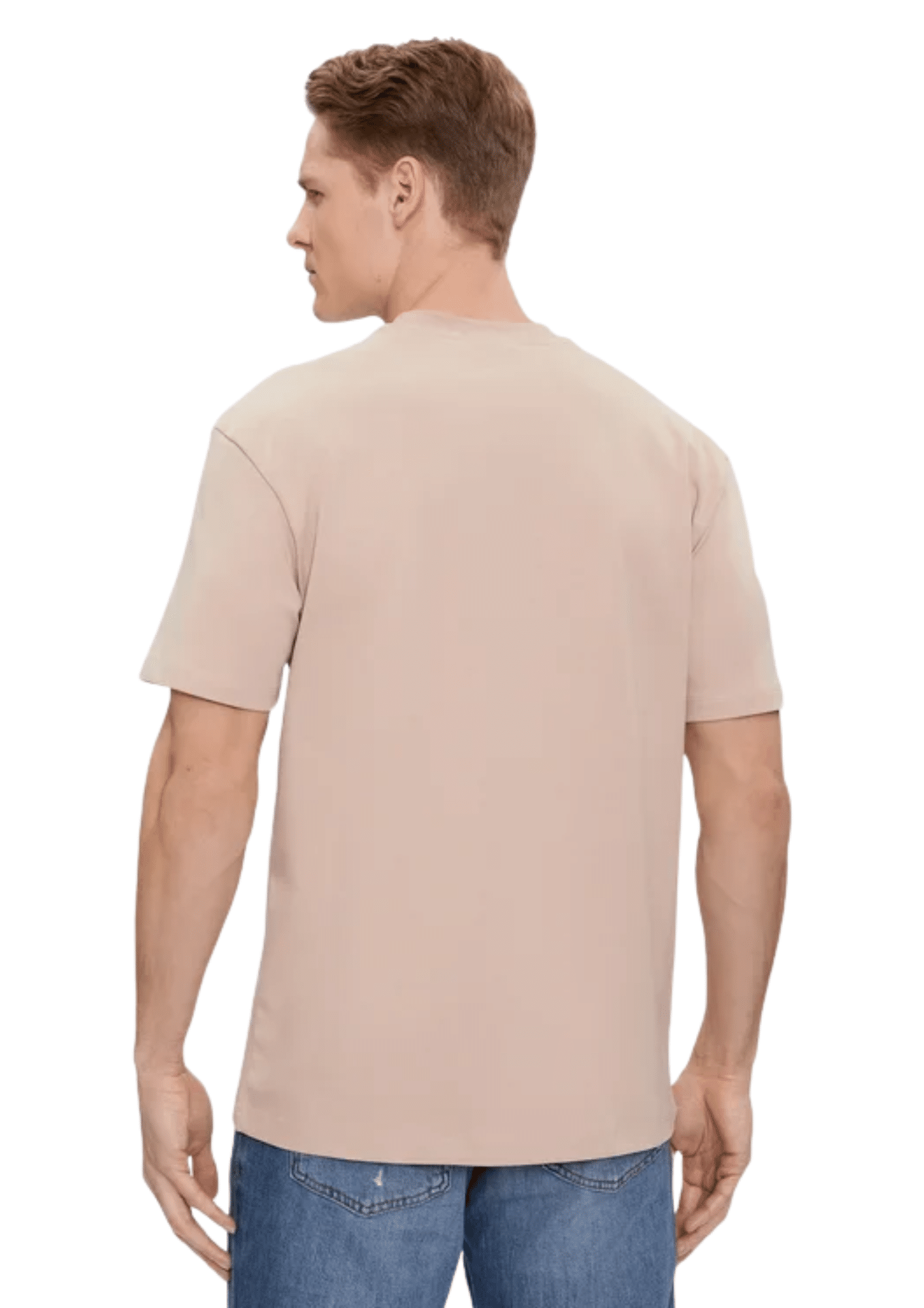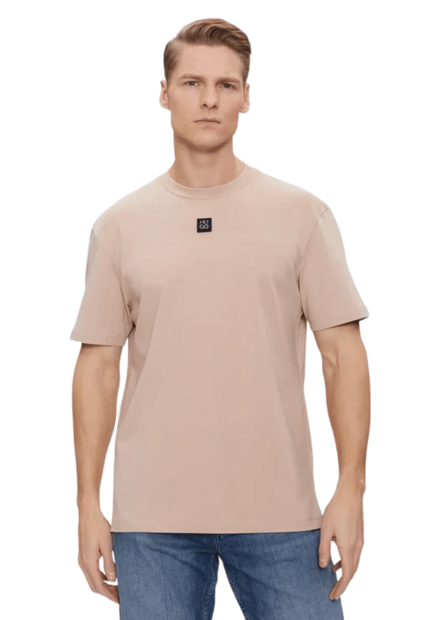 החולצה מגיעה בצבע בז' אחיד עם תג לוגו קטן ומעודן במרכז החזה, המעניק מראה יוקרתי ומדויק ללא עומס עיצובי.