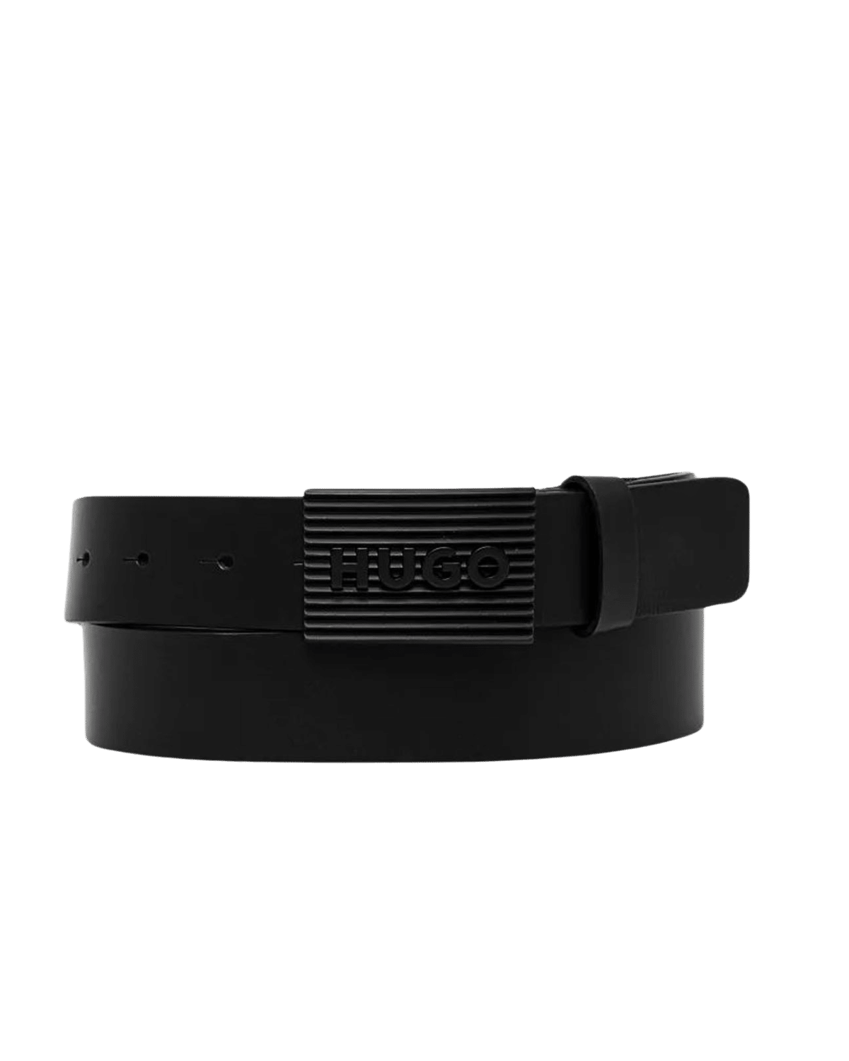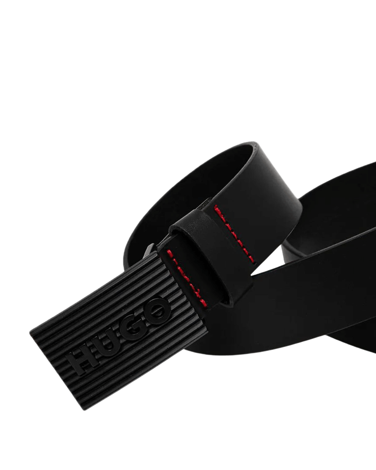 חגורה בעיצוב בית האופנה האיטלקי Hugo Boss העשויה 100% עור משובח בצבע שחור.