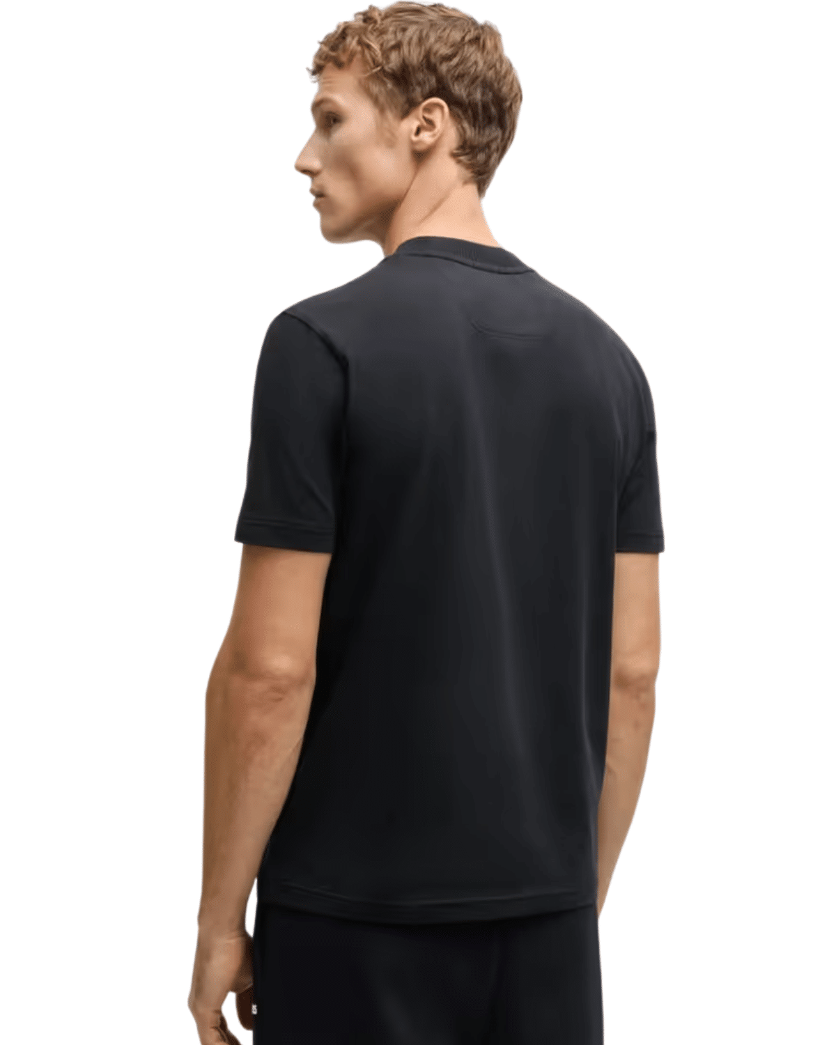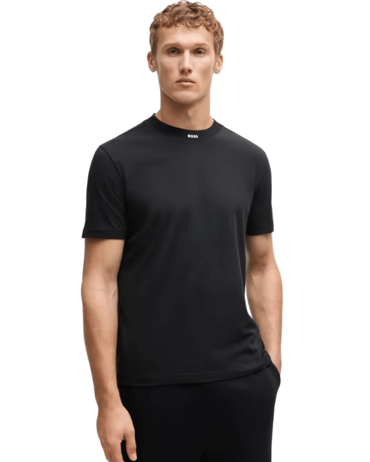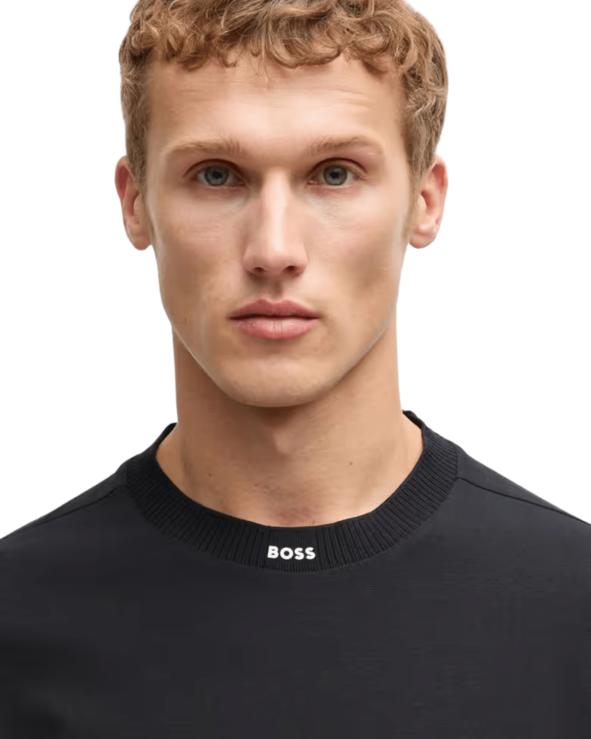 החולצה מעוצבת בסגנון נקי ועל-זמני, כאשר אלמנט ייחודי ומעודן – לוגו HUGO BOSS מודפס על הצווארון – מוסיף עניין ושיק עיצובי מבלי להפר את המראה המינימליסטי.