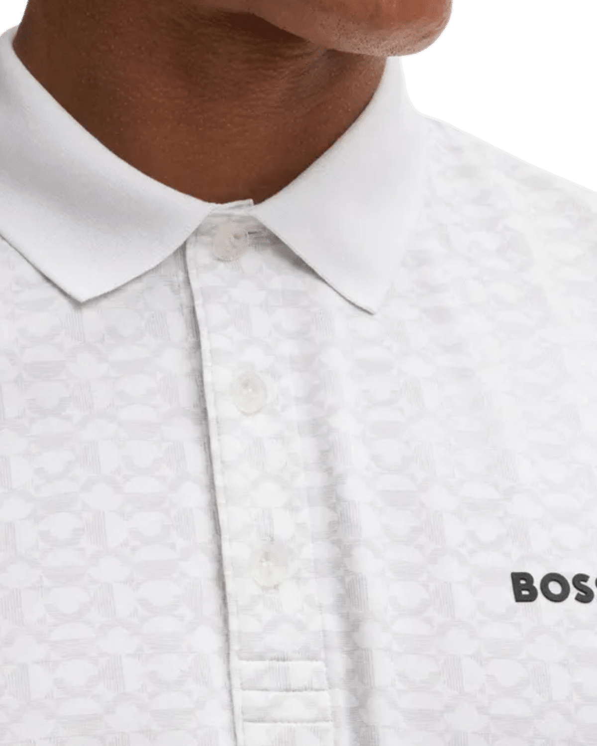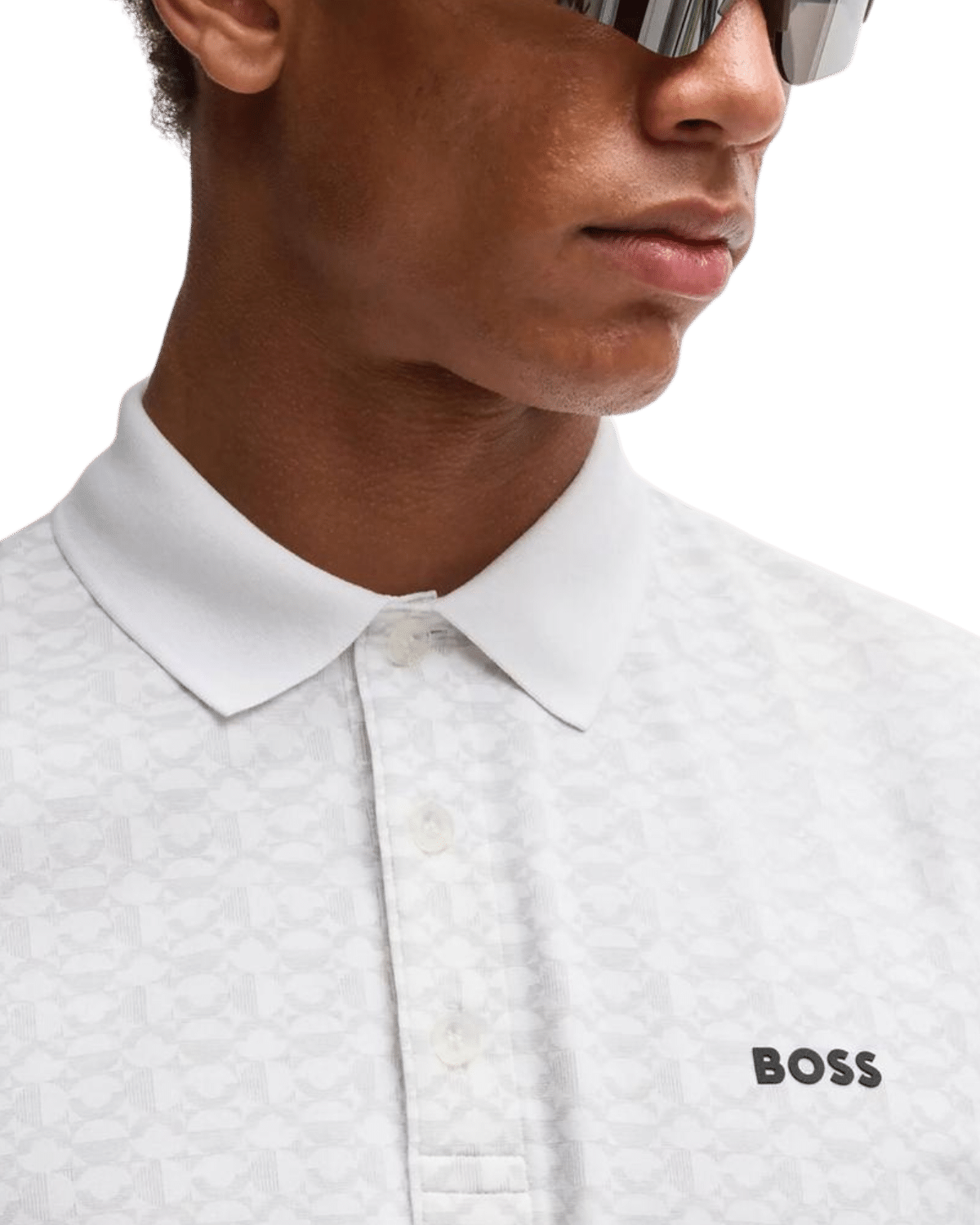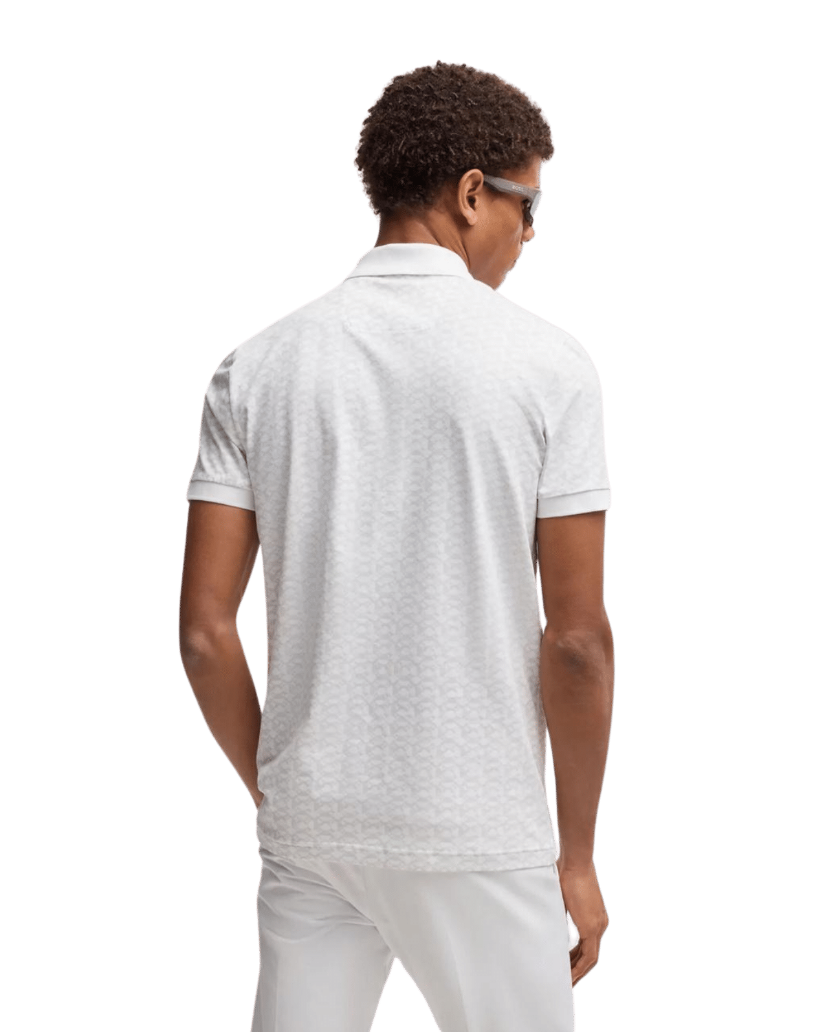 החולצה כוללת צווארון שטוח עם שלושה כפתורים, לוגו עדין והדפס רענן, המוסיפים טאץ' יוקרתי לסגנון הנקי.