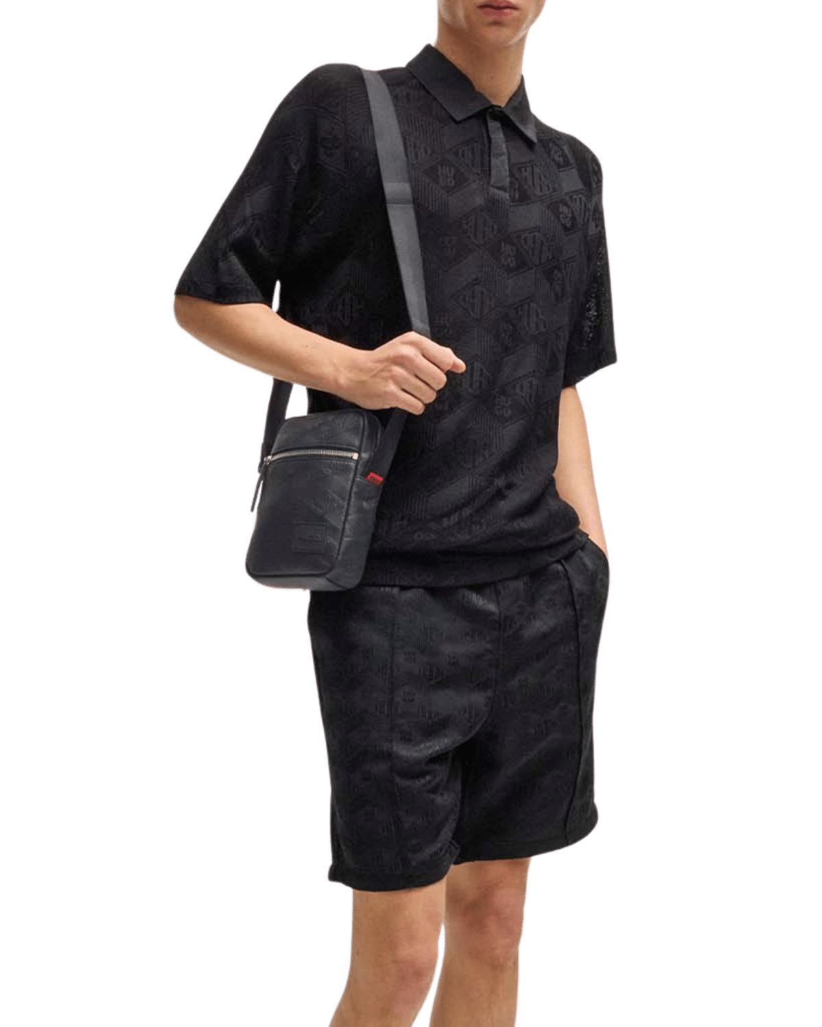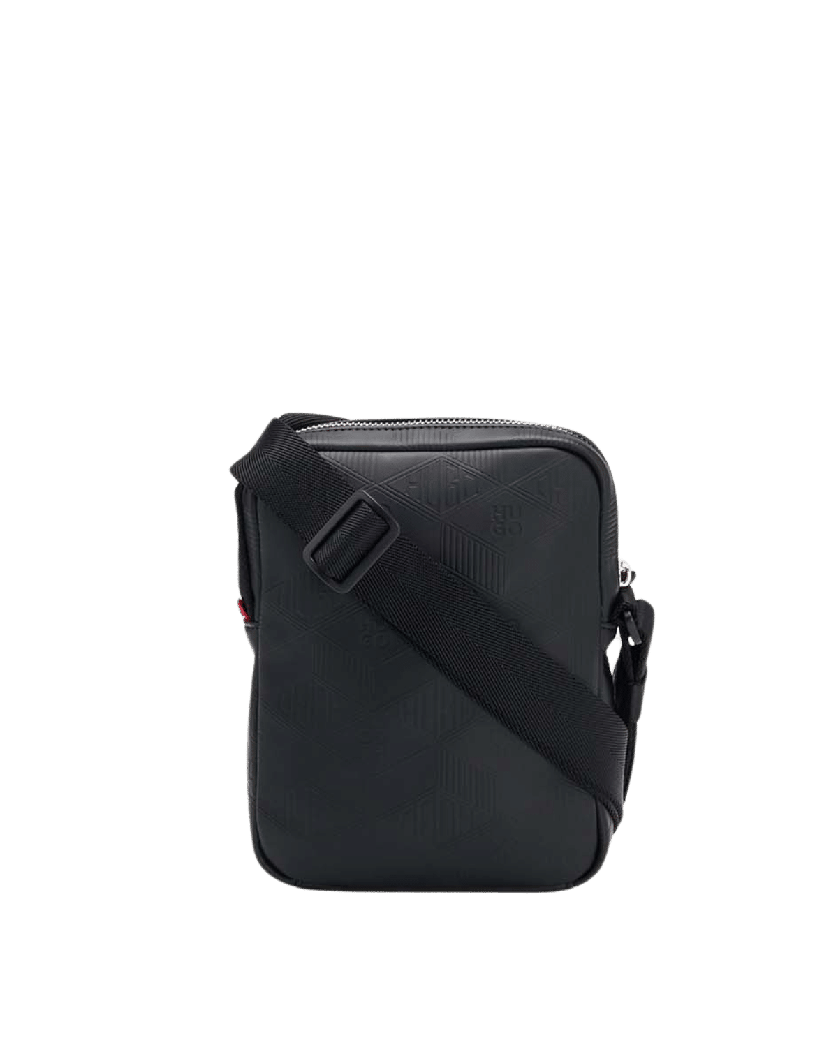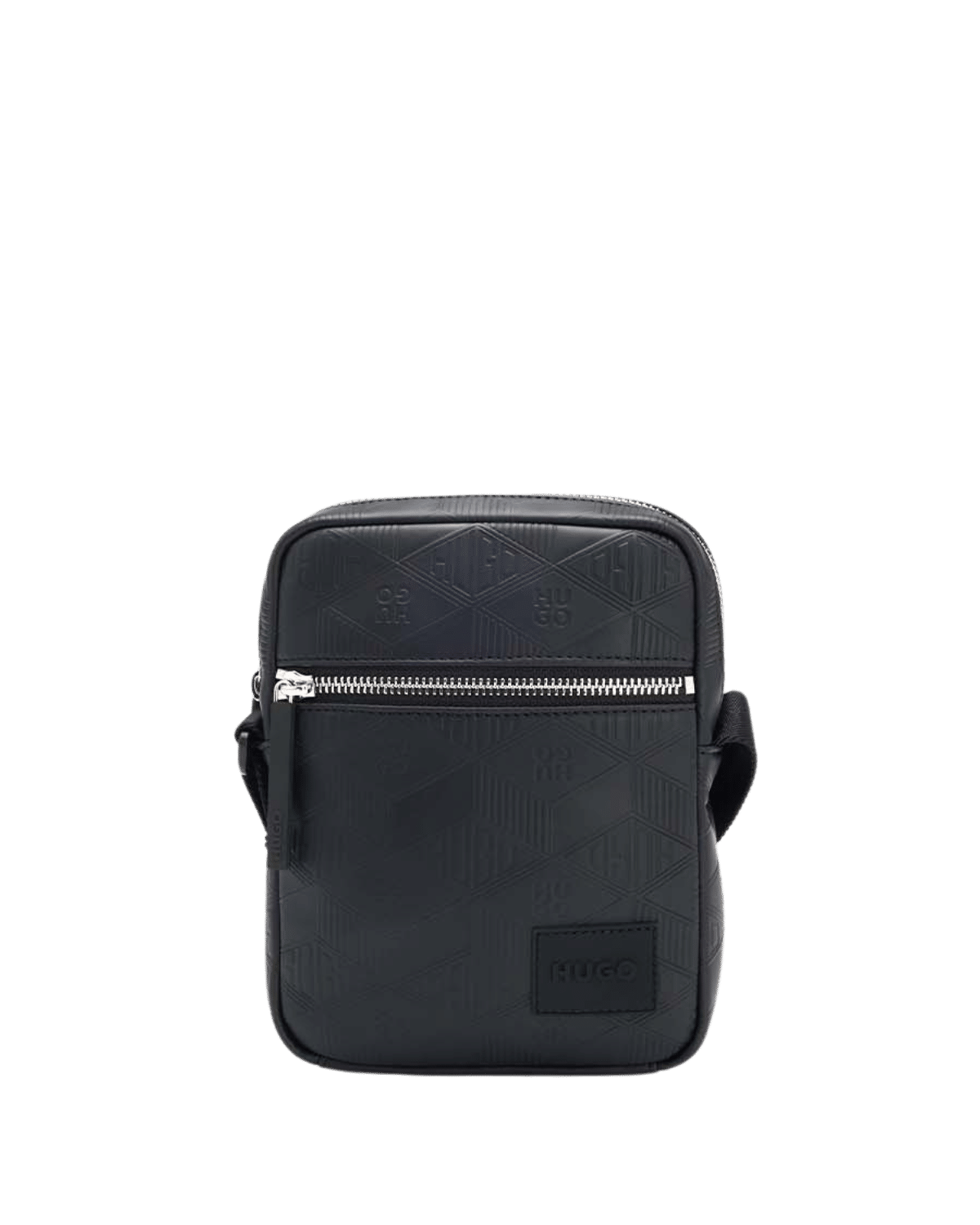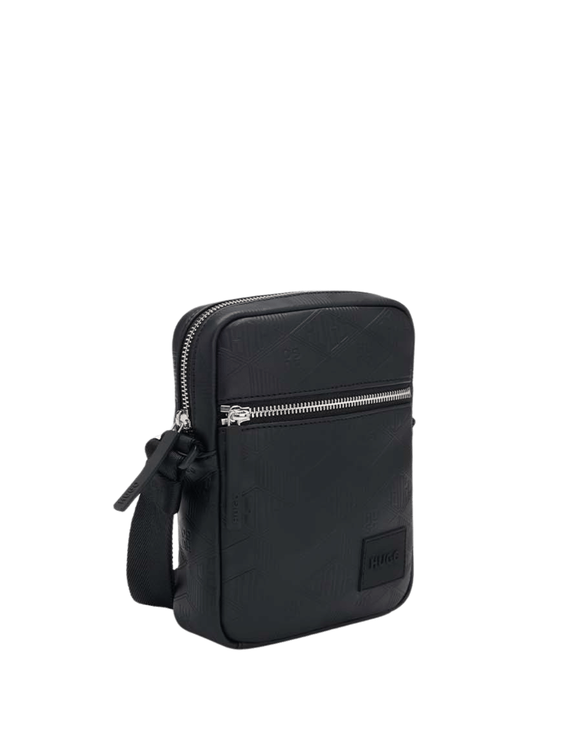 תיק צד קומפקטי ואופנתי לגברים מבית HUGO, בעיצוב מודרני עם שילוב של לוגו גאומטרי ומרקם דמוי עור.