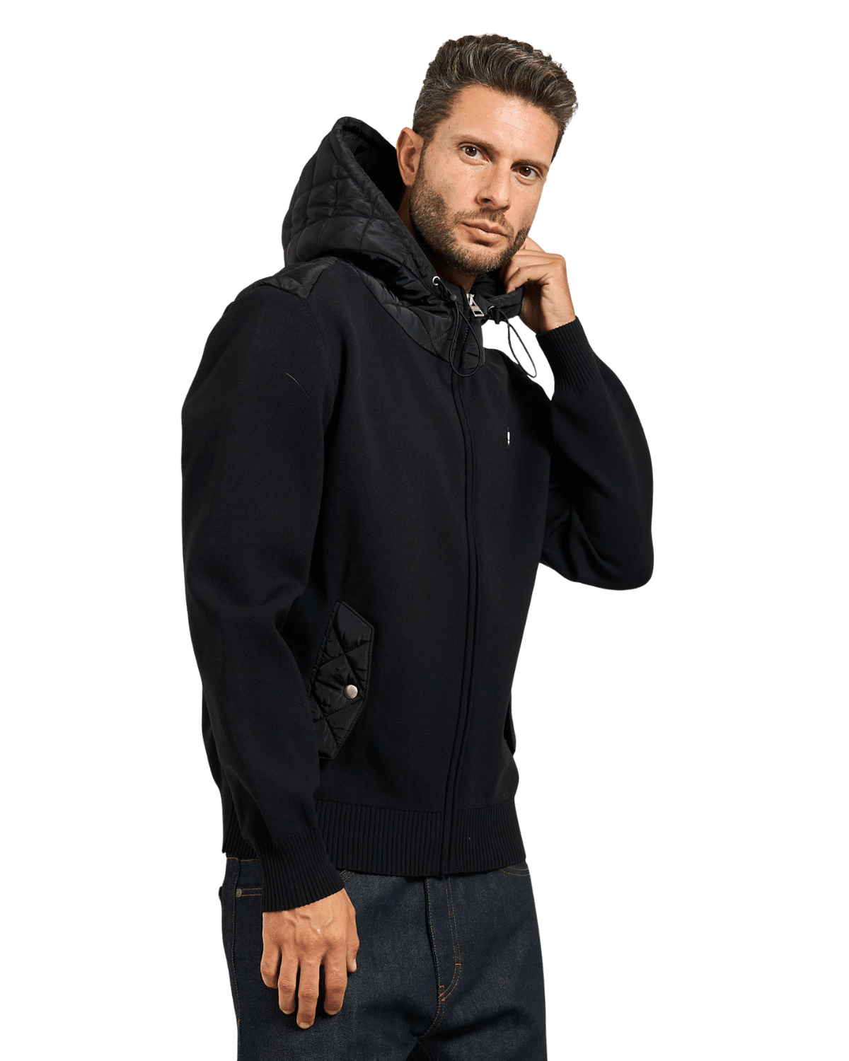 הסווטשירט כולל סגירת רוכסן מלאה, קפוצ'ון מרופד בתפירה ריבועית.
