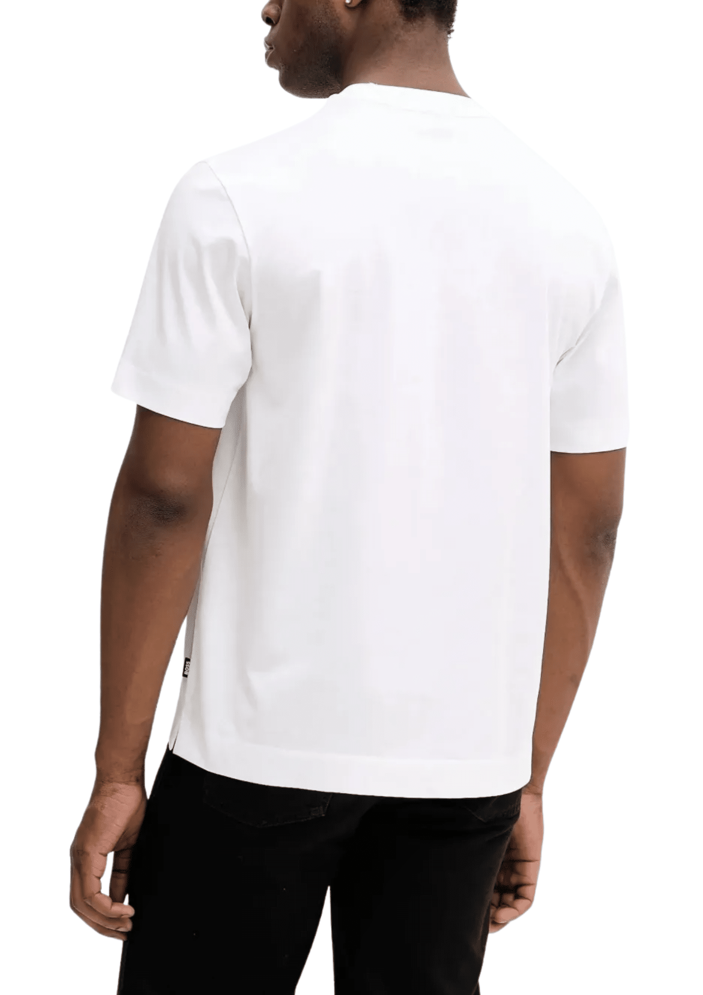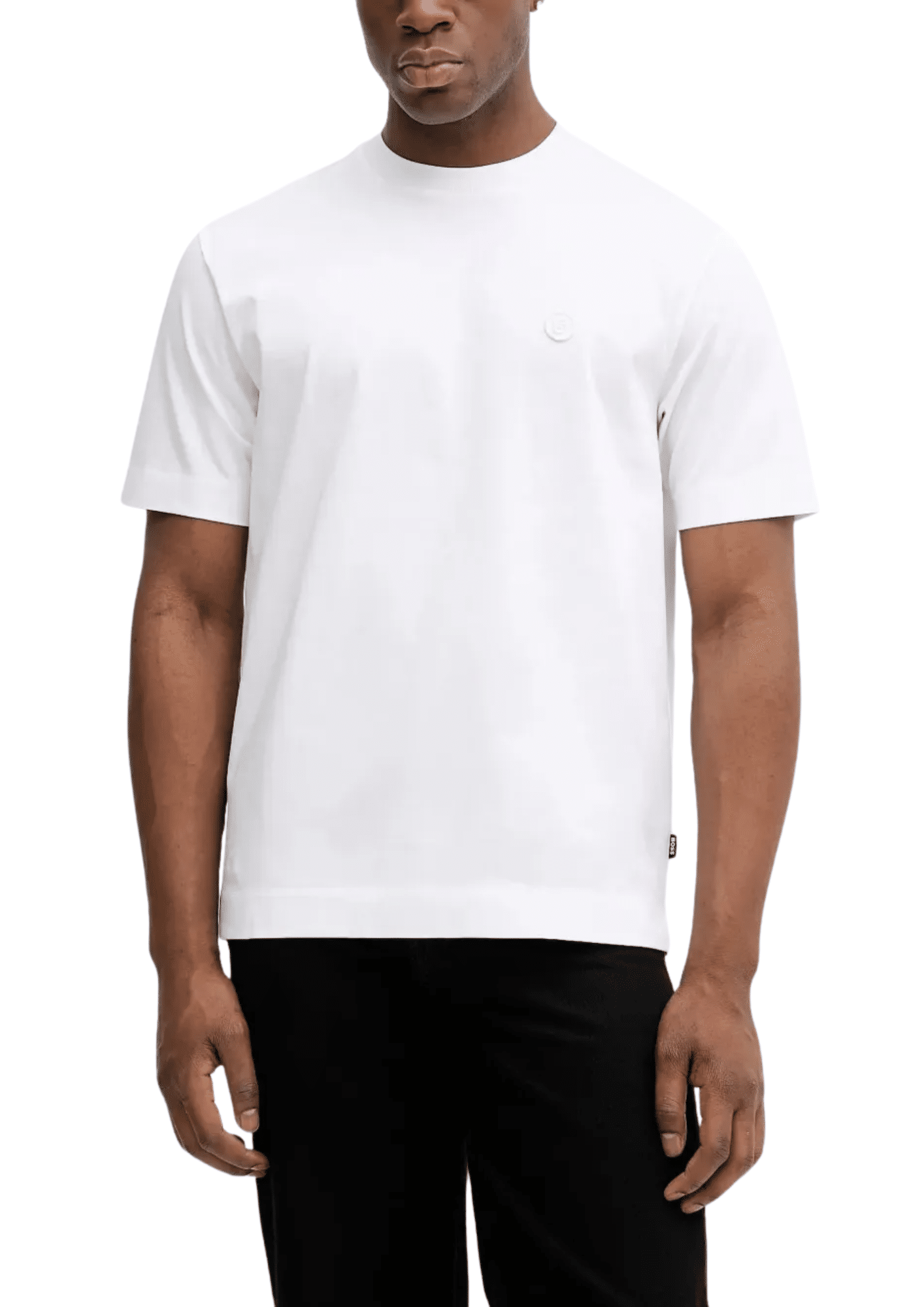 חולצת טי-שירט קצרה לגברים מבית HUGO BOSS בצבע לבן קלאסי, שרוולים קצרים, פריט בסיסי יומיומי שמעניק מראה נקי ומעודן.