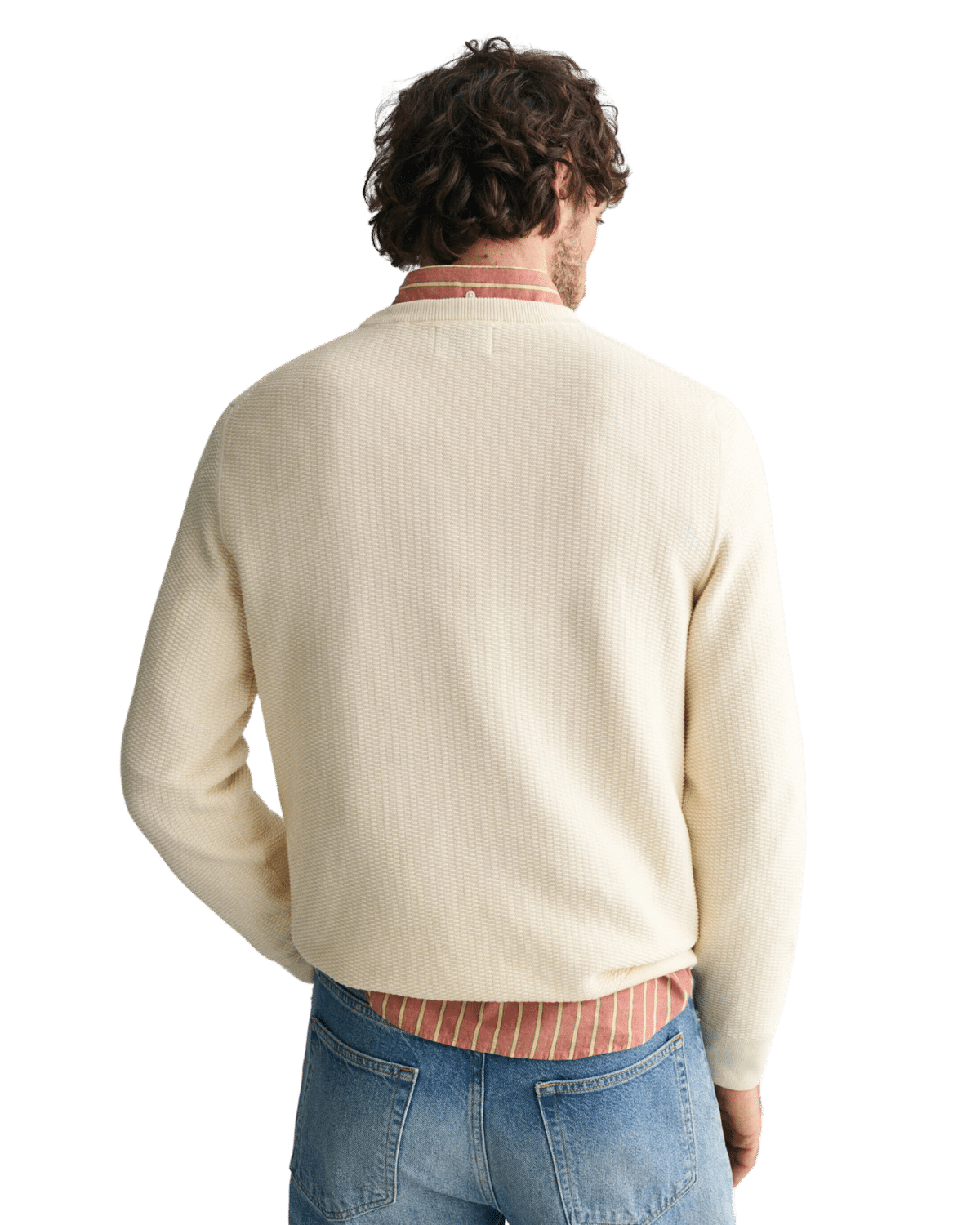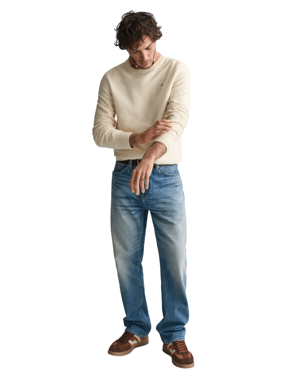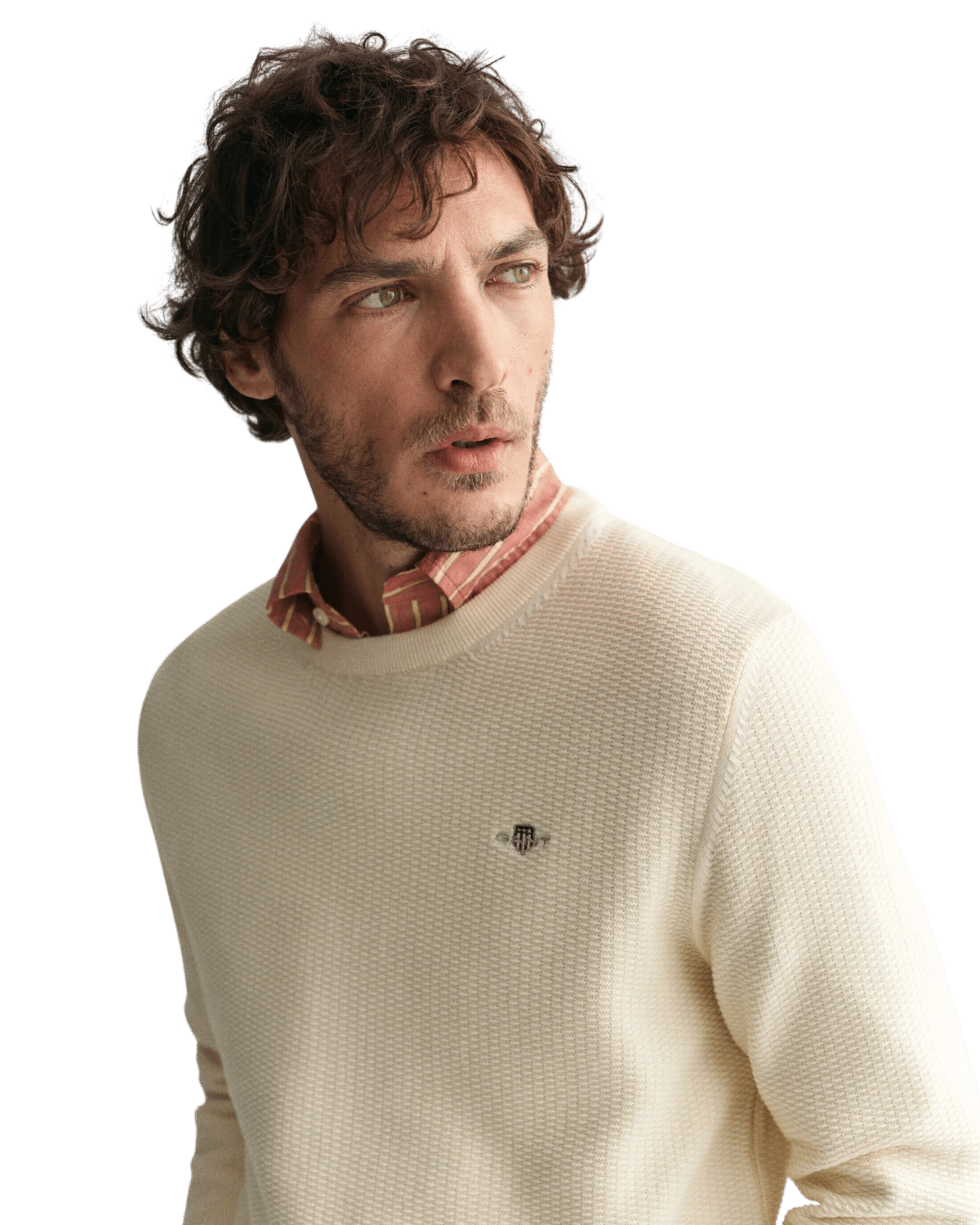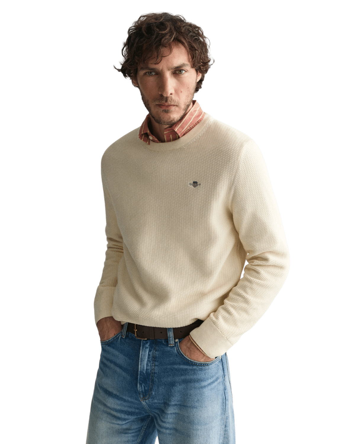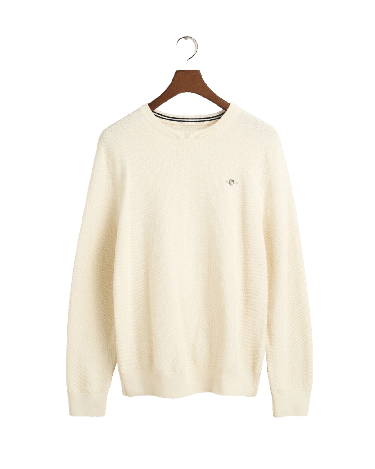 הסוודר כולל צווארון צווארון קלאסי, סוודר עם קצוות מצולעים בשוליים ובשרוולים וגרפיקה של מגן ארכיון GANT רקום בחזה.