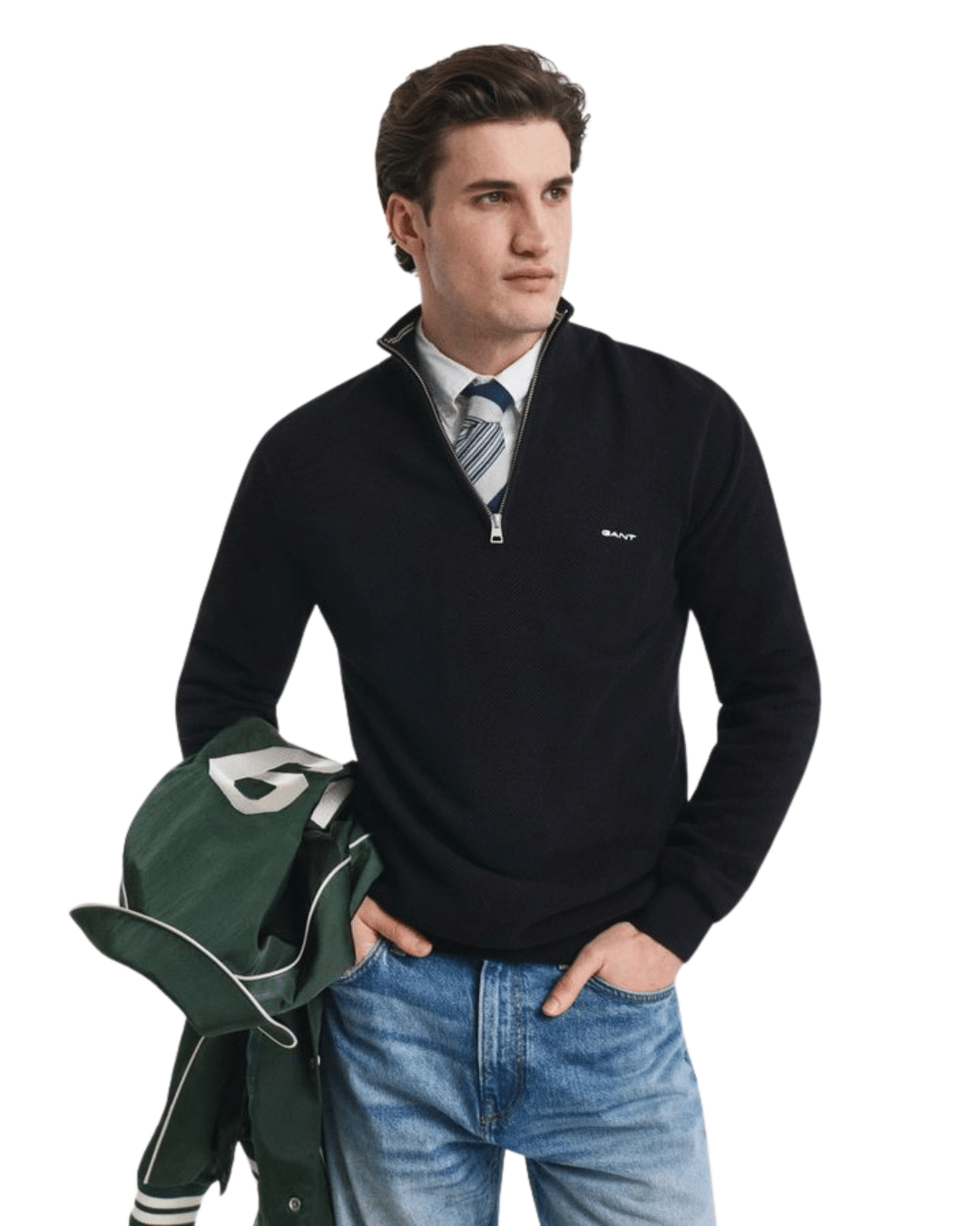 הסווטשירט כולל רוכסן חצי קדמי, צווארון גבוה, ולוגו רקום בחזה, המעניקים לו מראה אלגנטי ונעים.