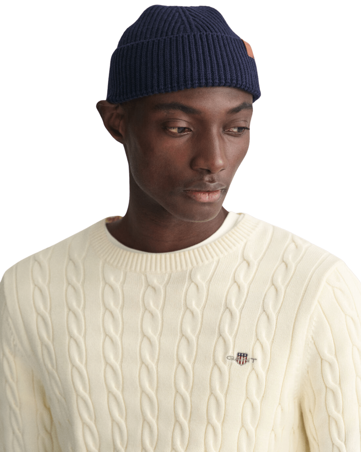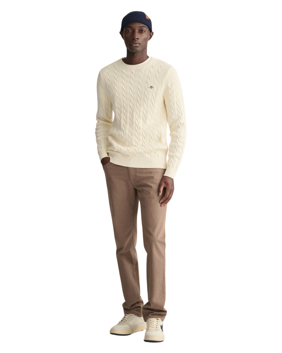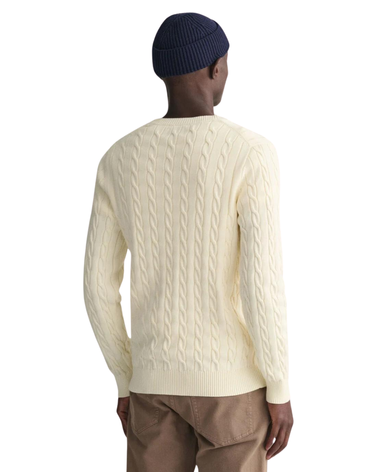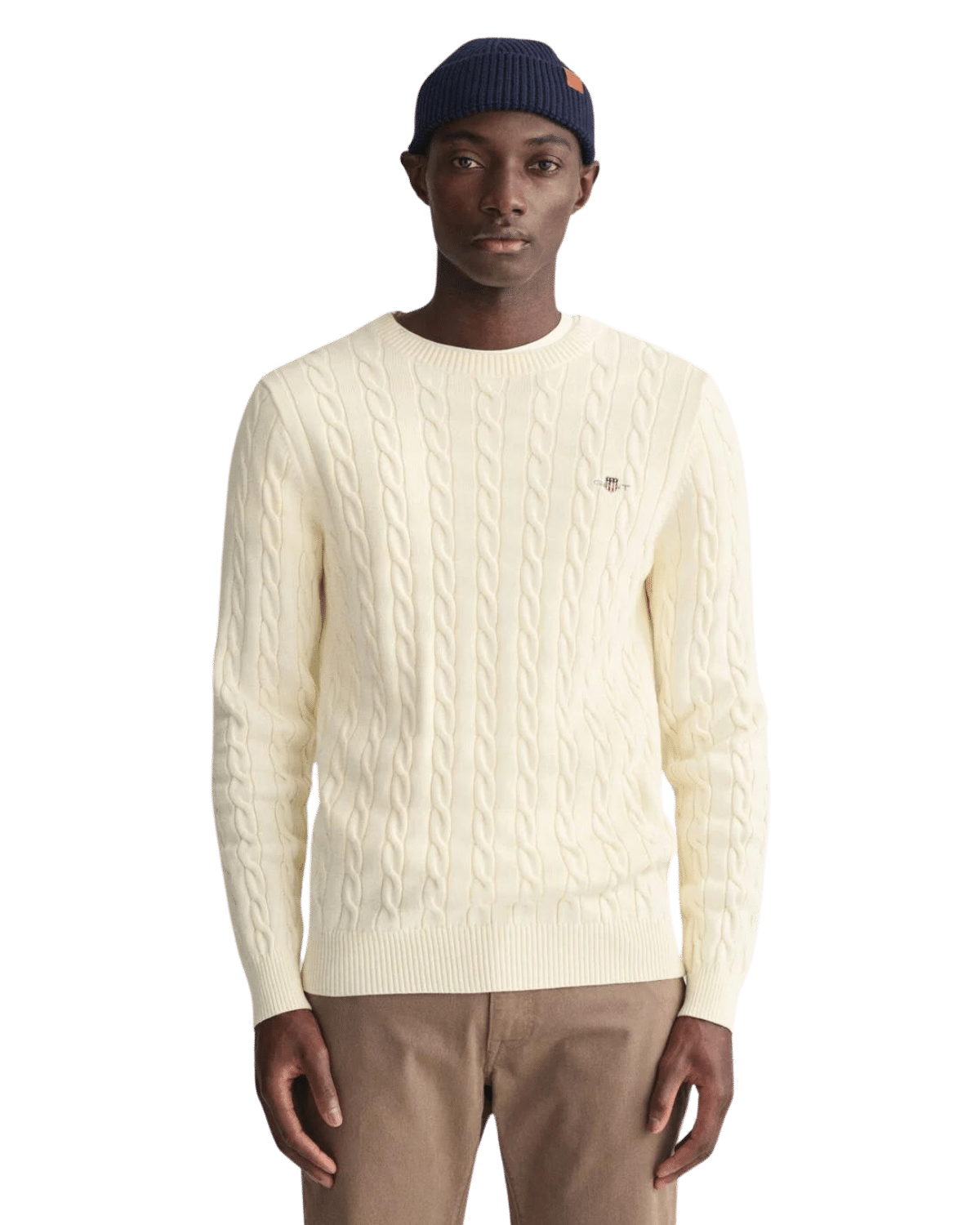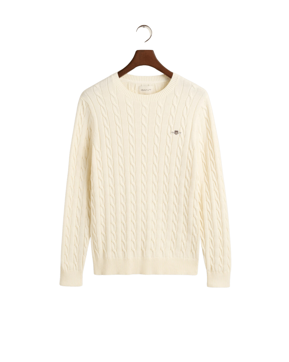 סוודר רך זה מעוצב בכותנה עם מבנה סריג כבל, בעל התאמה רגילה וצווארון קלאסי.