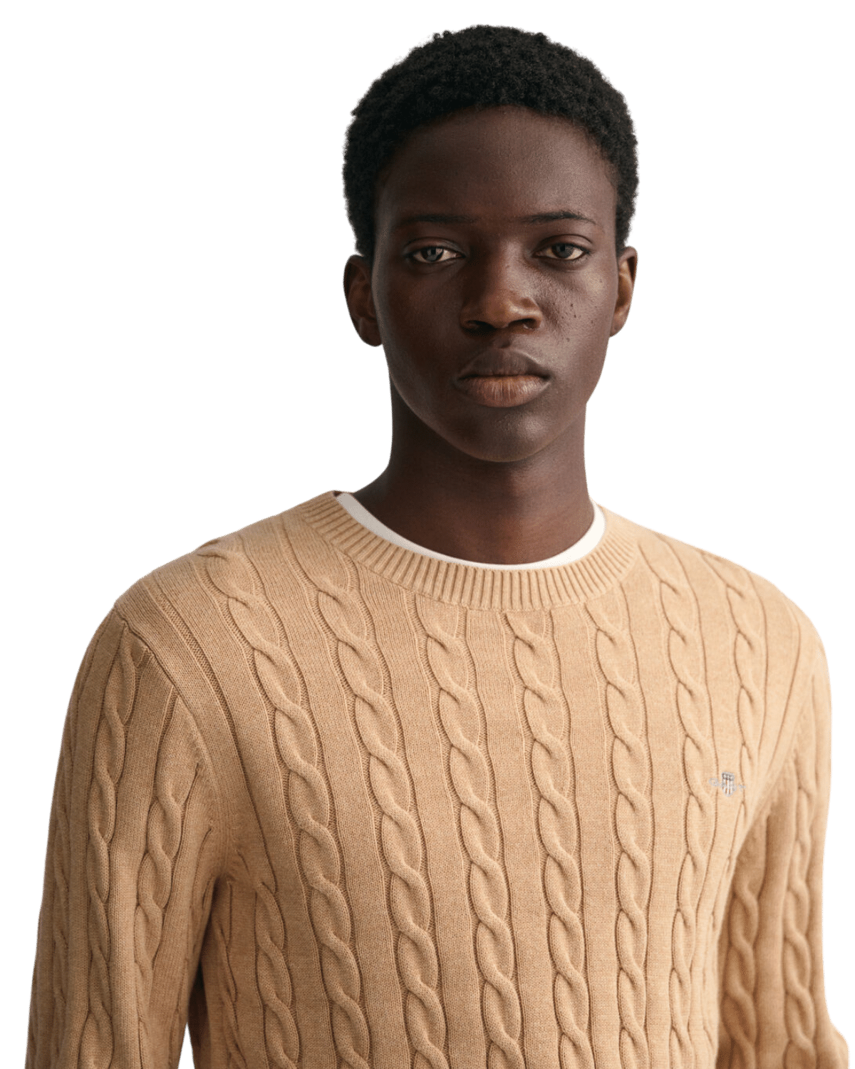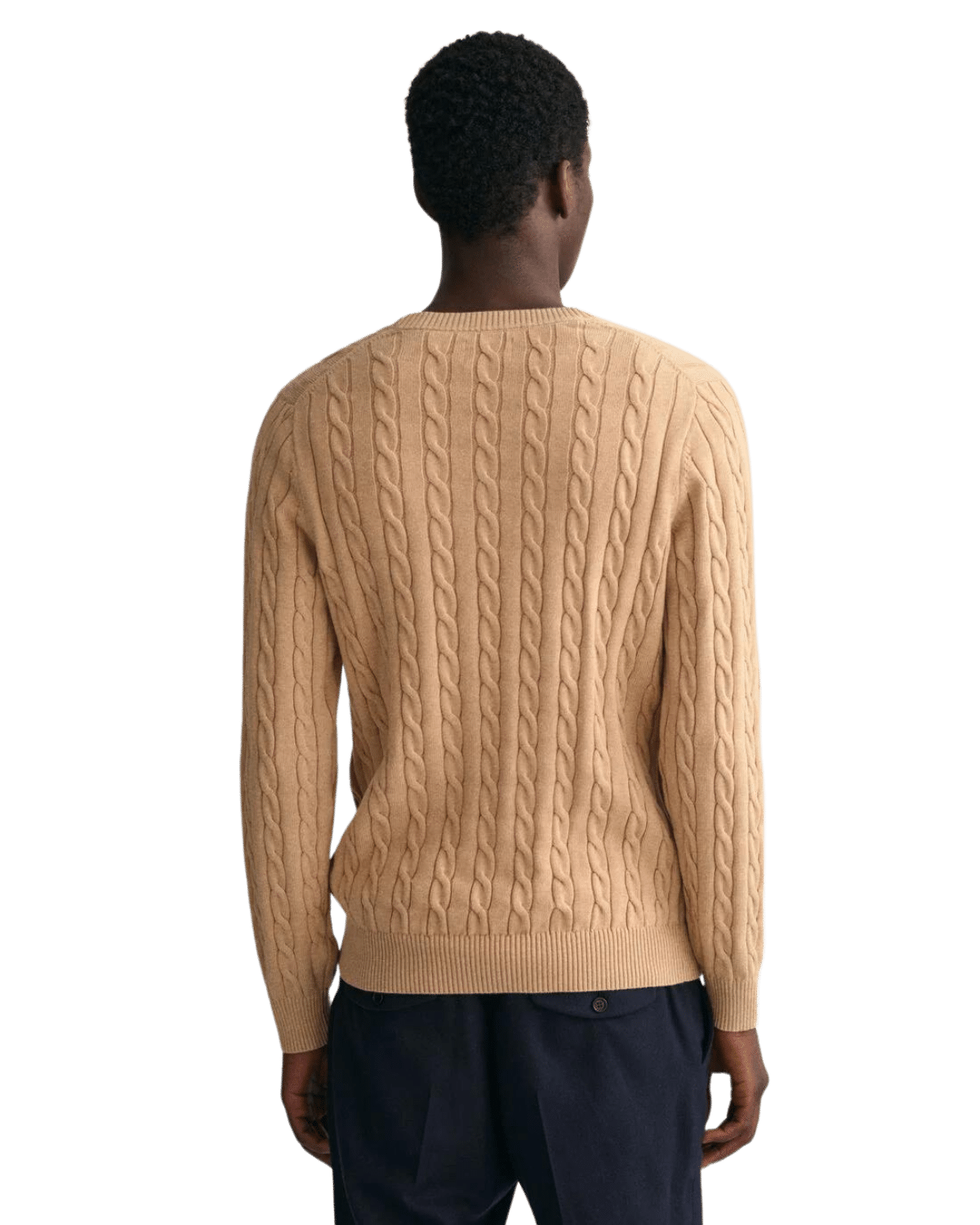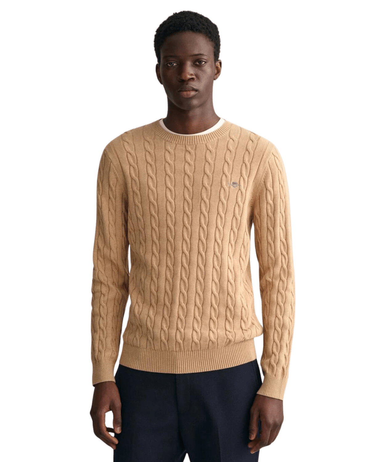 סוודר רך זה מעוצב בכותנה עם מבנה סריג כבל, בעל התאמה רגילה וצווארון קלאסי.