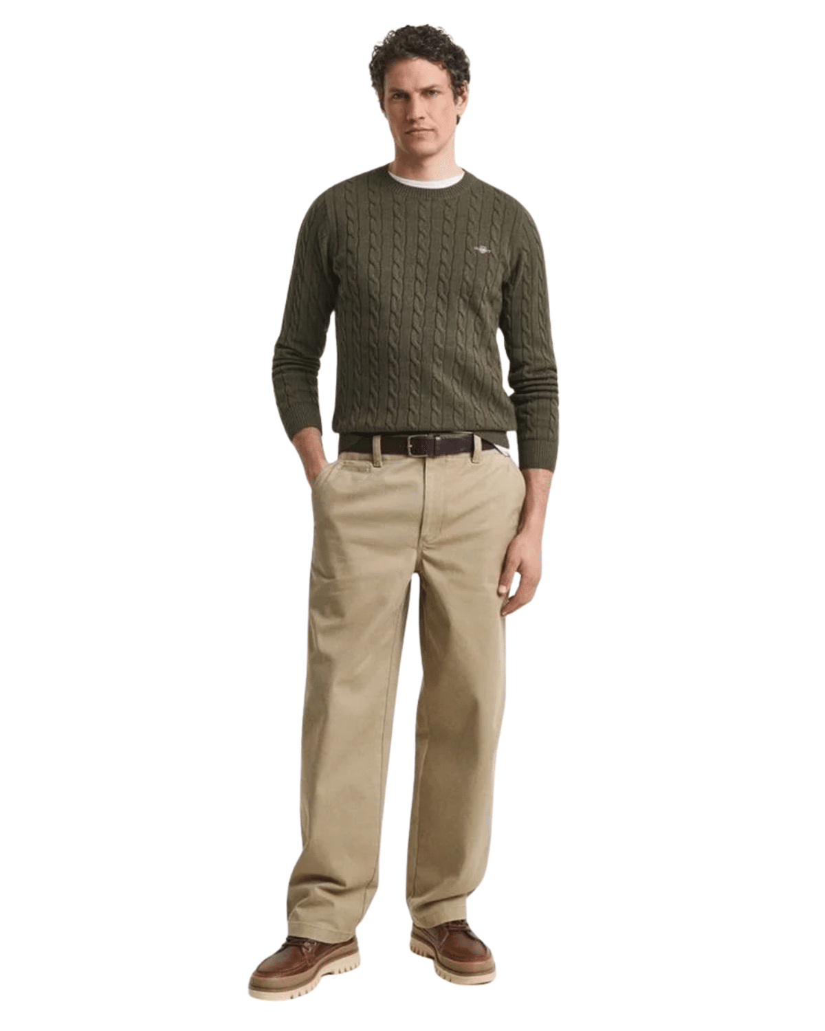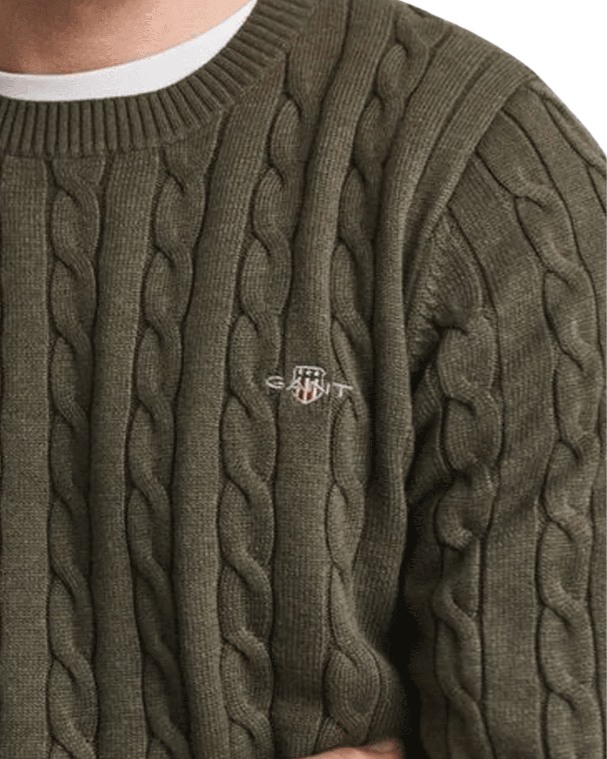 סריג גברי בעיצוב קלאסי מבית GANT בסגנון Cable Knit עם מבנה סריגת צמות לאורך כל הפריט.