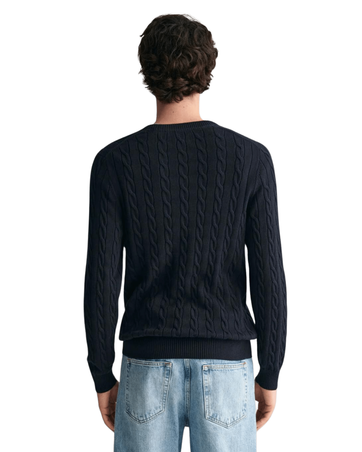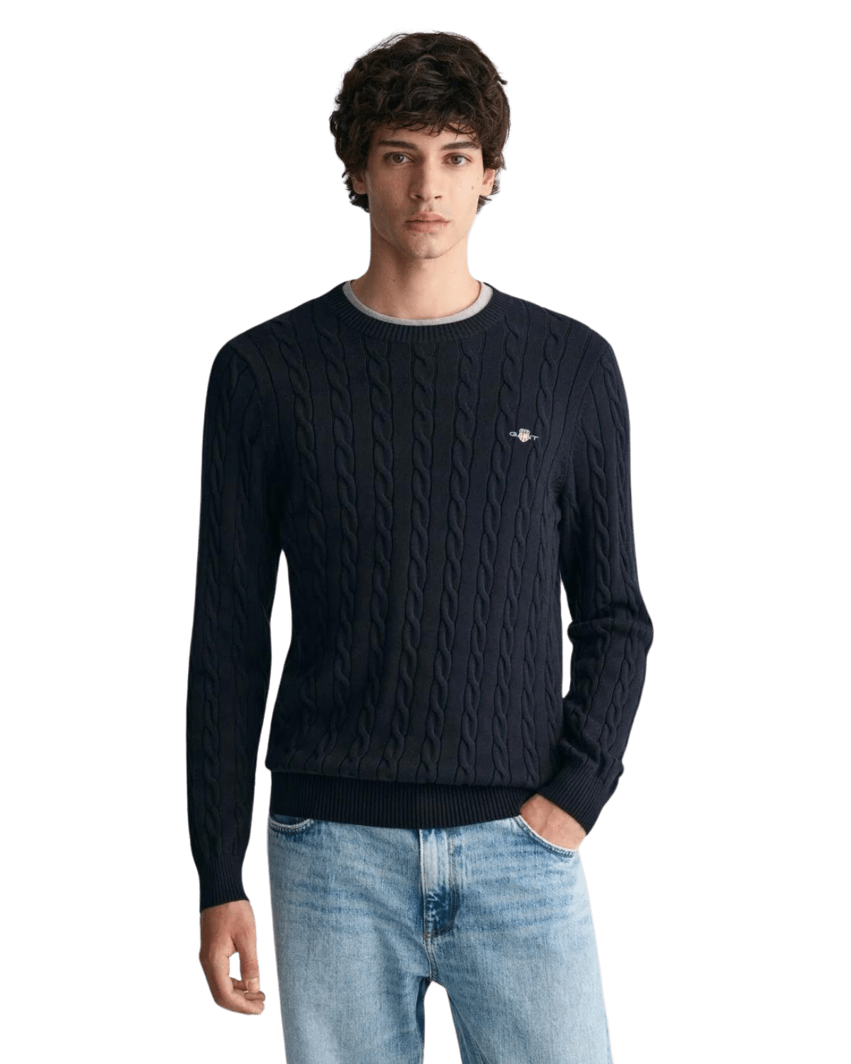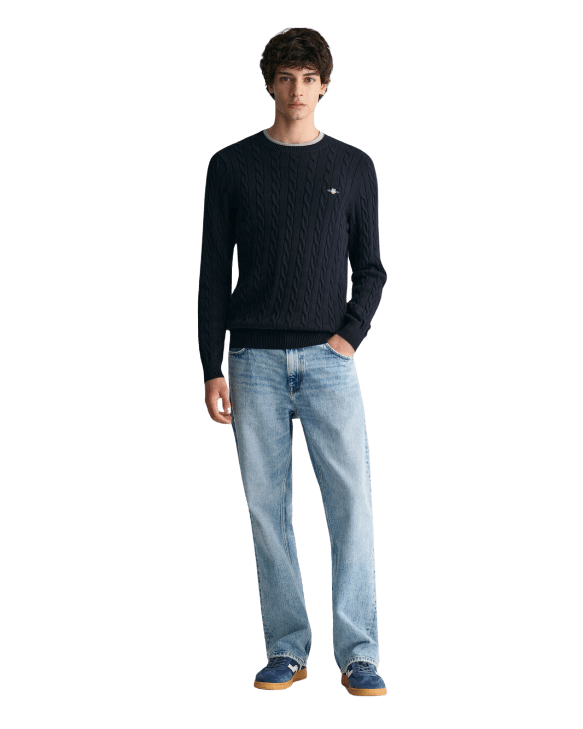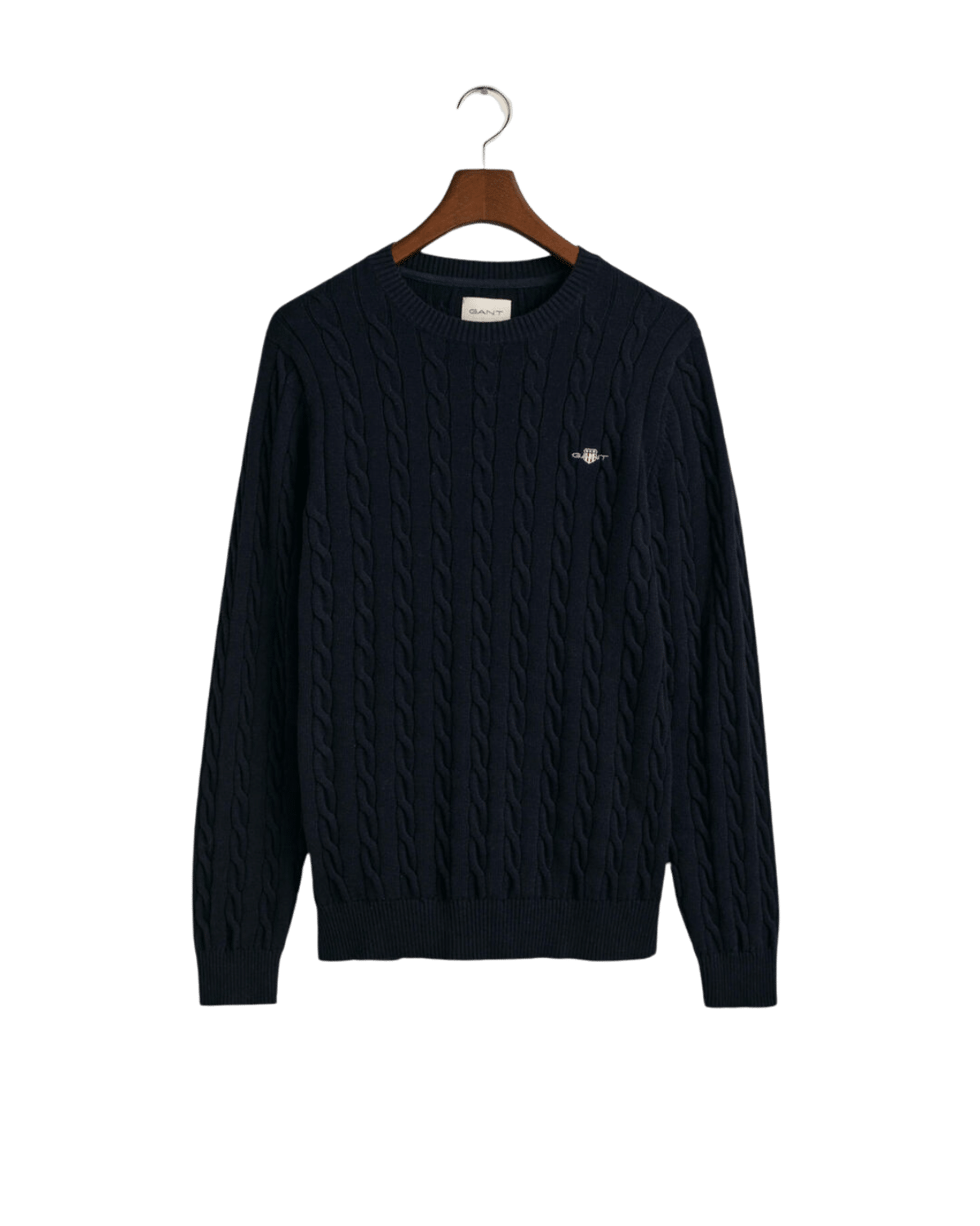 סוודר רך זה מעוצב בכותנה עם מבנה סריג כבל, בעל התאמה רגילה וצווארון קלאסי.