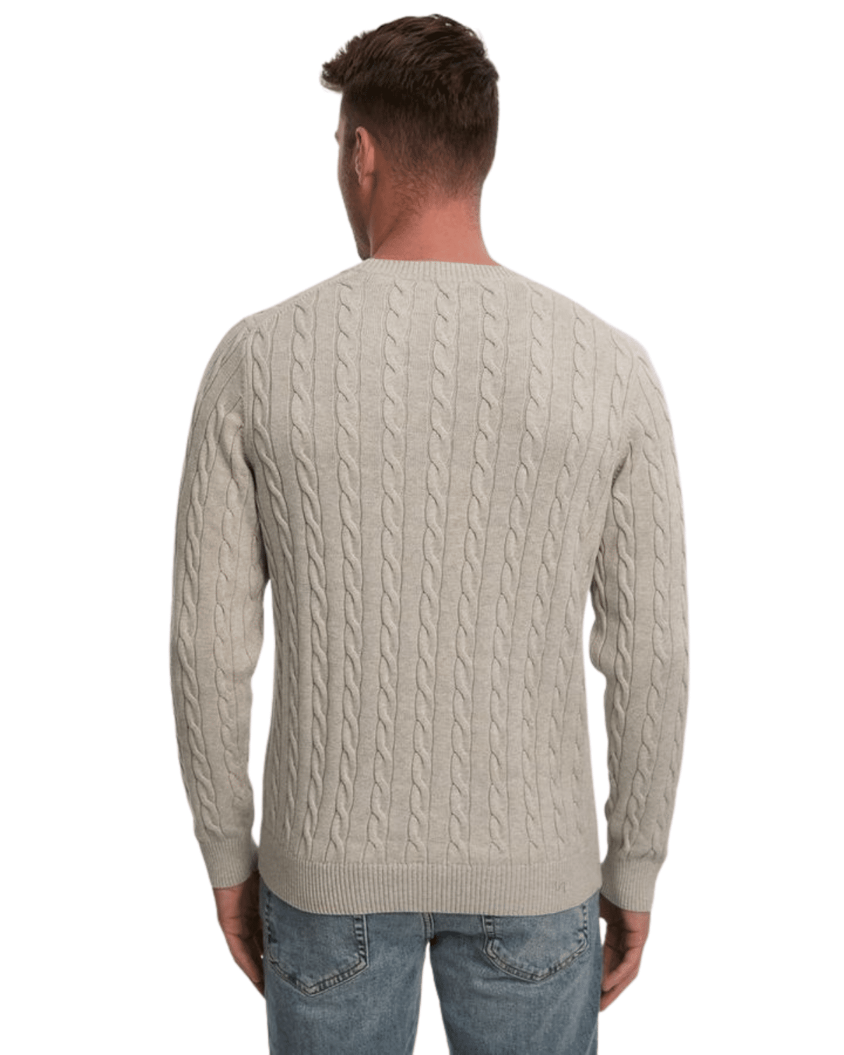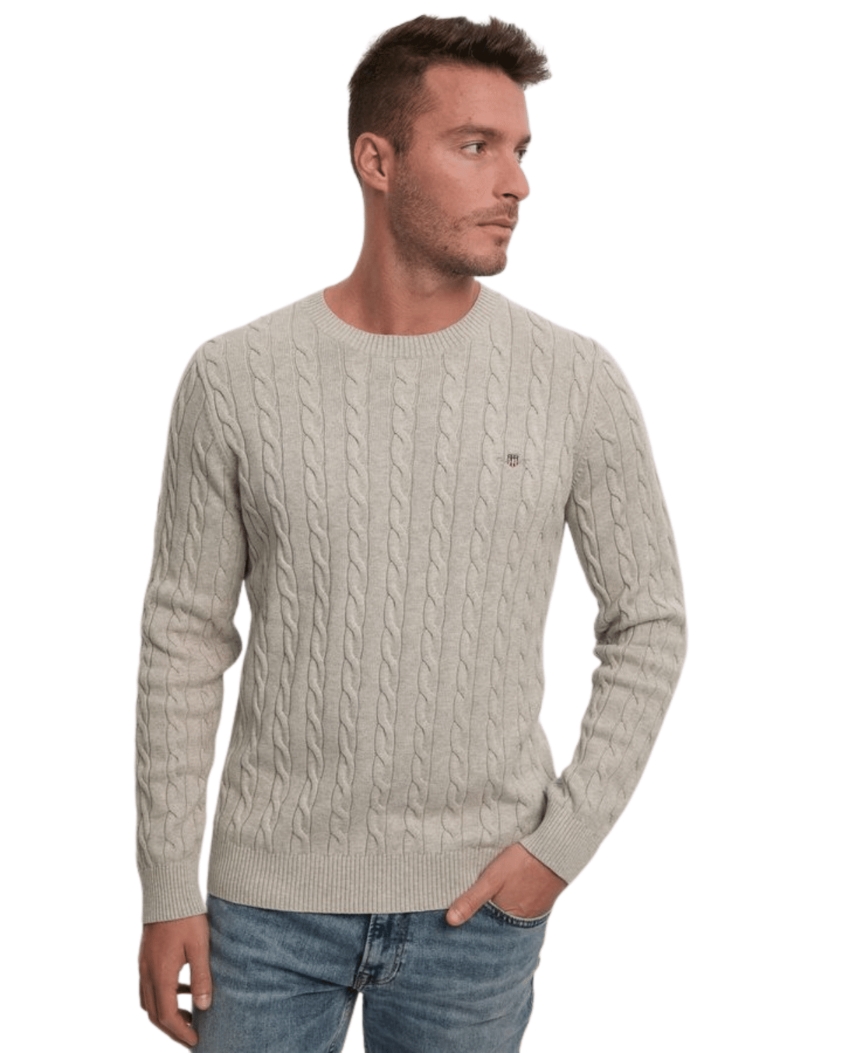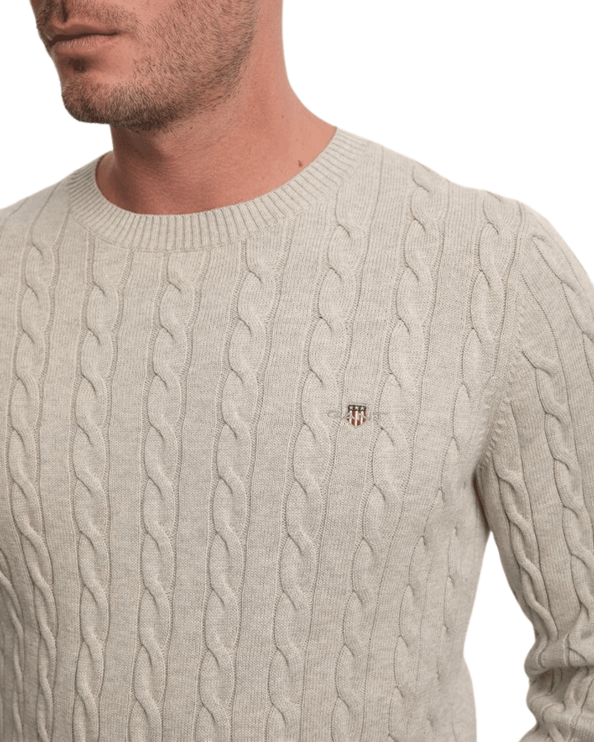 סריג לגברים מבית GANT בצבע אפור בהיר-מלנג’ (Cloud Grey Melange). מדובר בפריט עליון קלאסי עם אריגת צמות (cable knit) לכל פני הבד, המספק מראה עשיר ומרקם ייחודי שמוסיף עומק למלתחה.