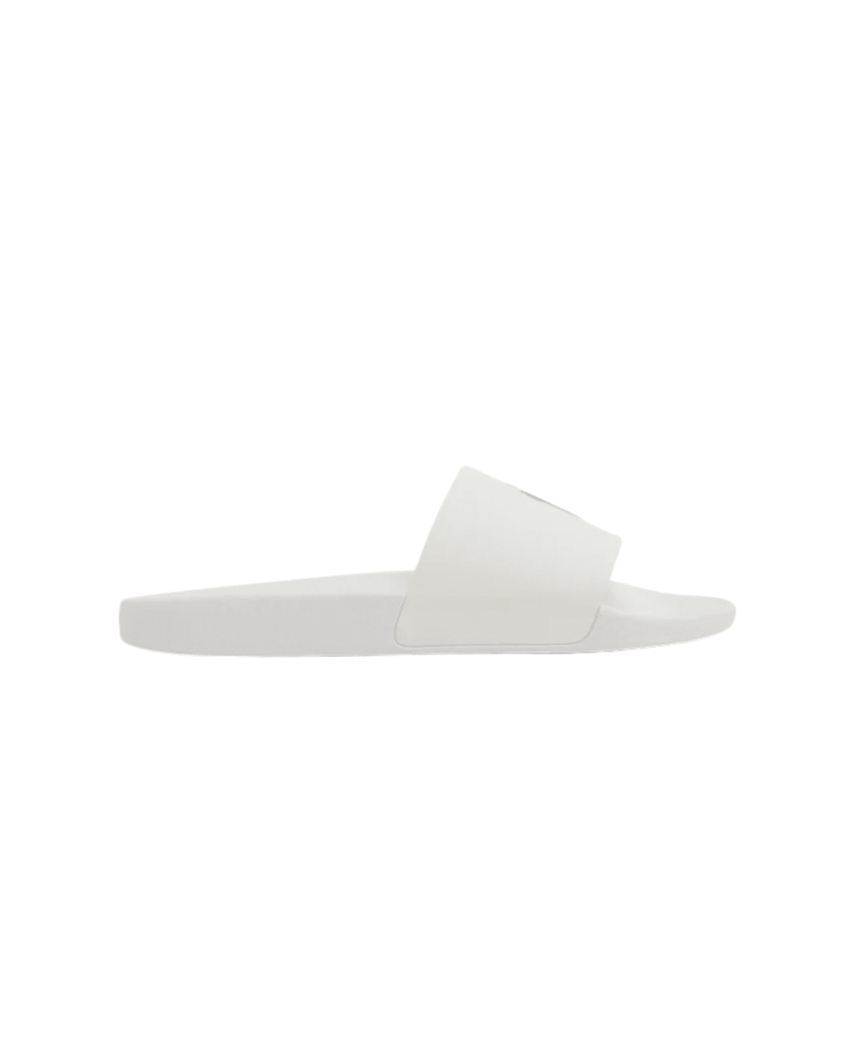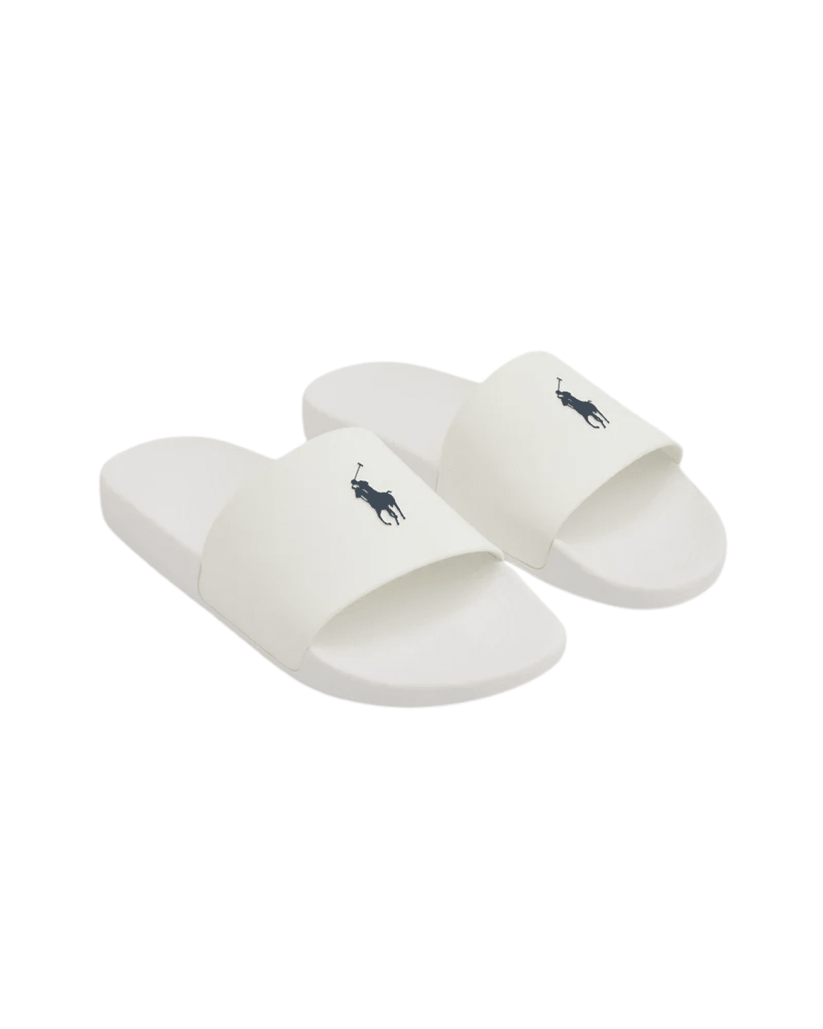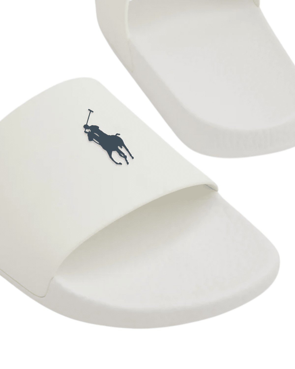 כפכפי גברים בצבע לבן מלא מבית POLO RALPH LAUREN עם רצועה רחבה על פני כף הרגל ושפה תחתונה חלקה המעניקה מראה נקי ומודרני