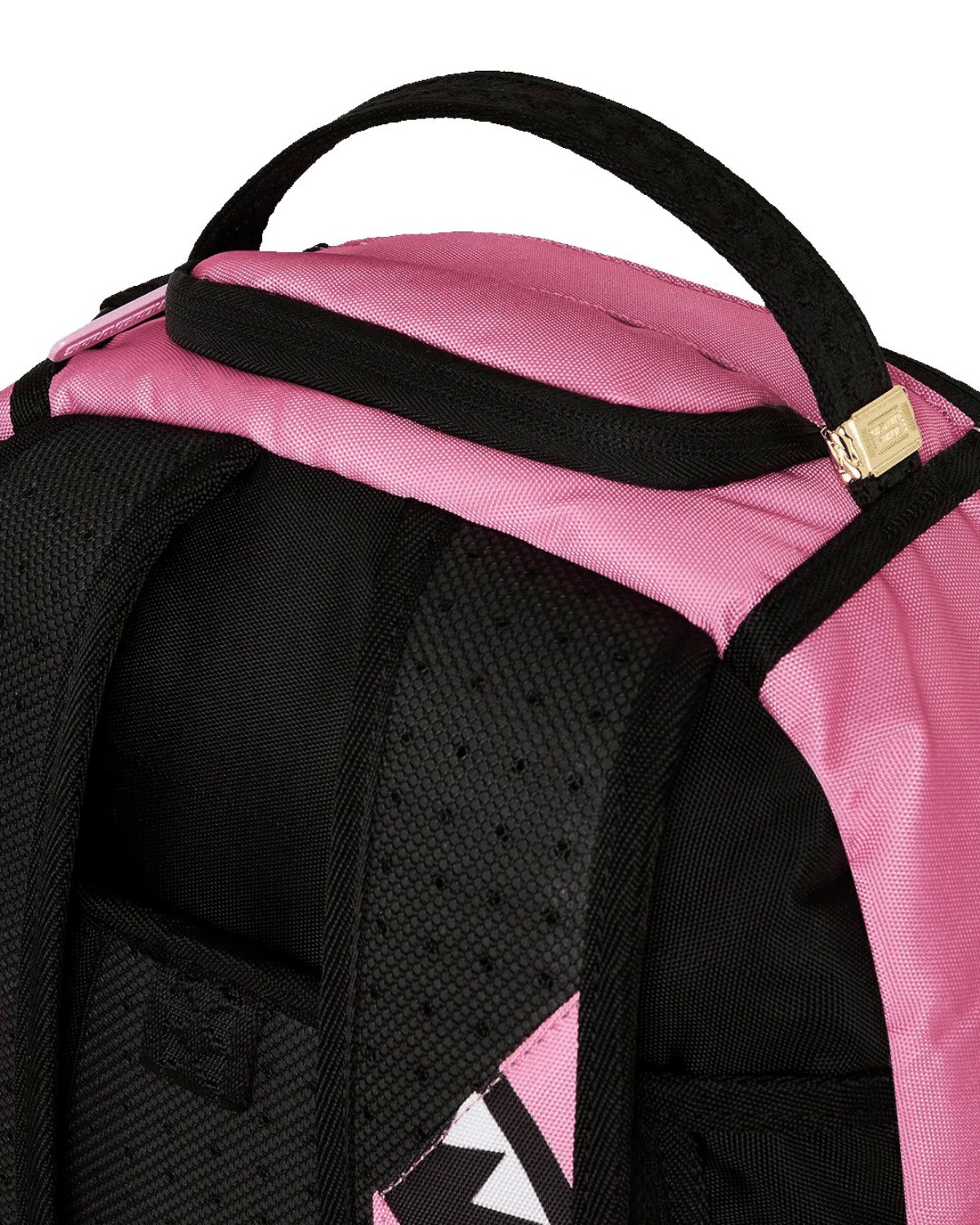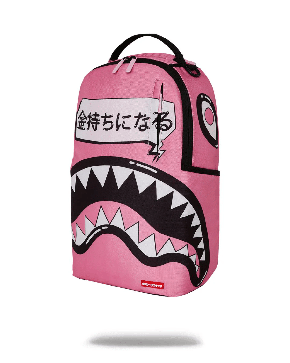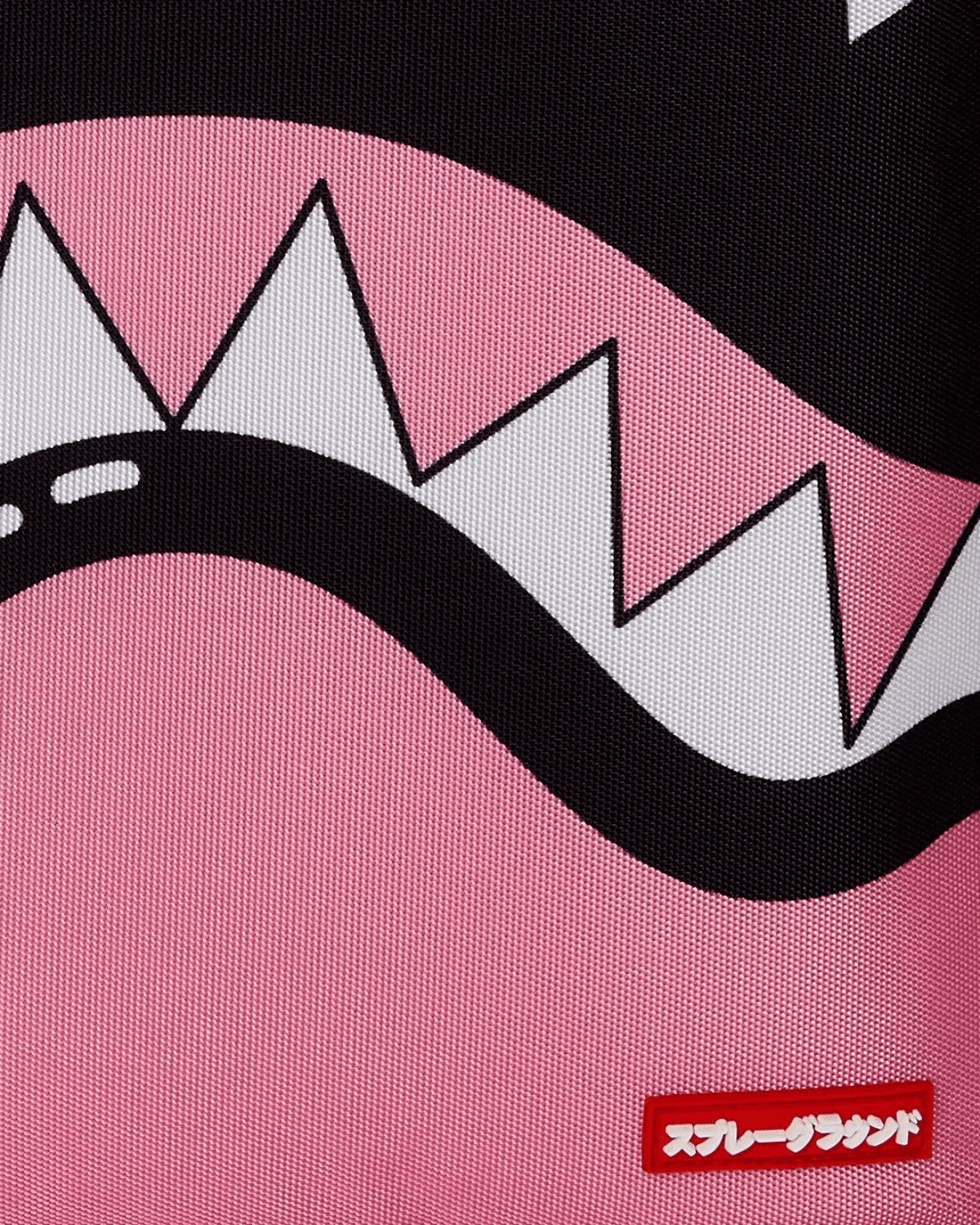 תיק גב ייחודי בגוון ורוד בועתי עם מוטיב כריש עוצמתי ובלסת פתוחה בחזית. בועת דיבור קטנה עם כתב יפני מוסיפה תחושה גרפית וקצת שיק קומיקאי.