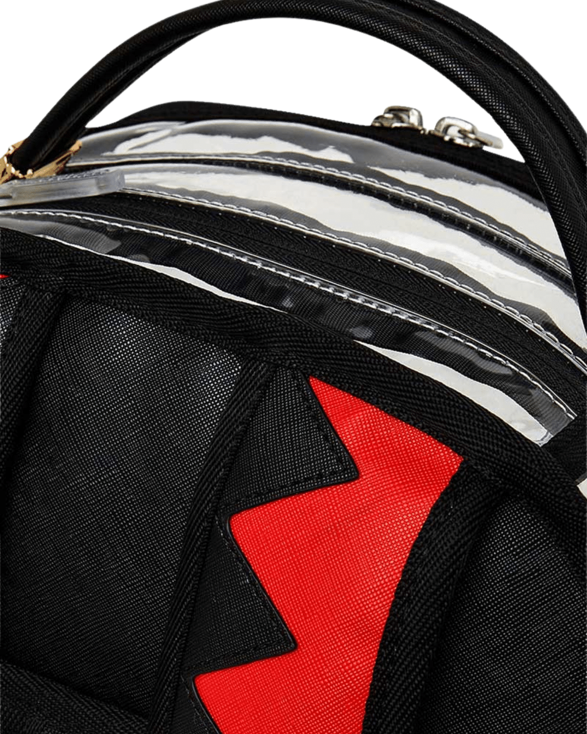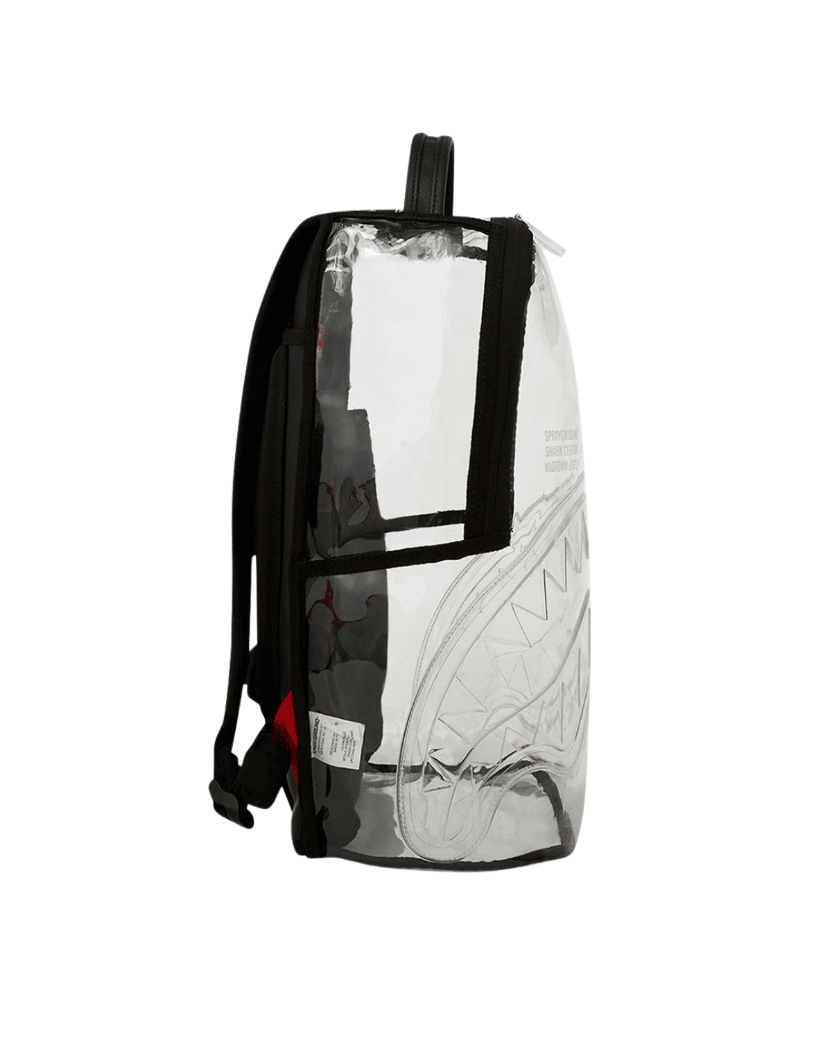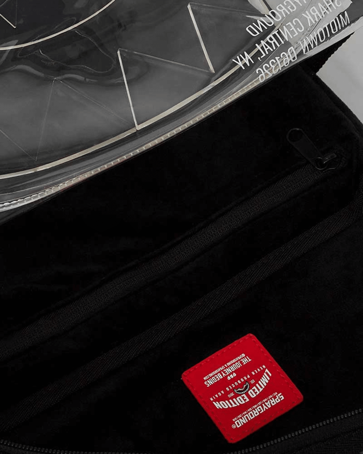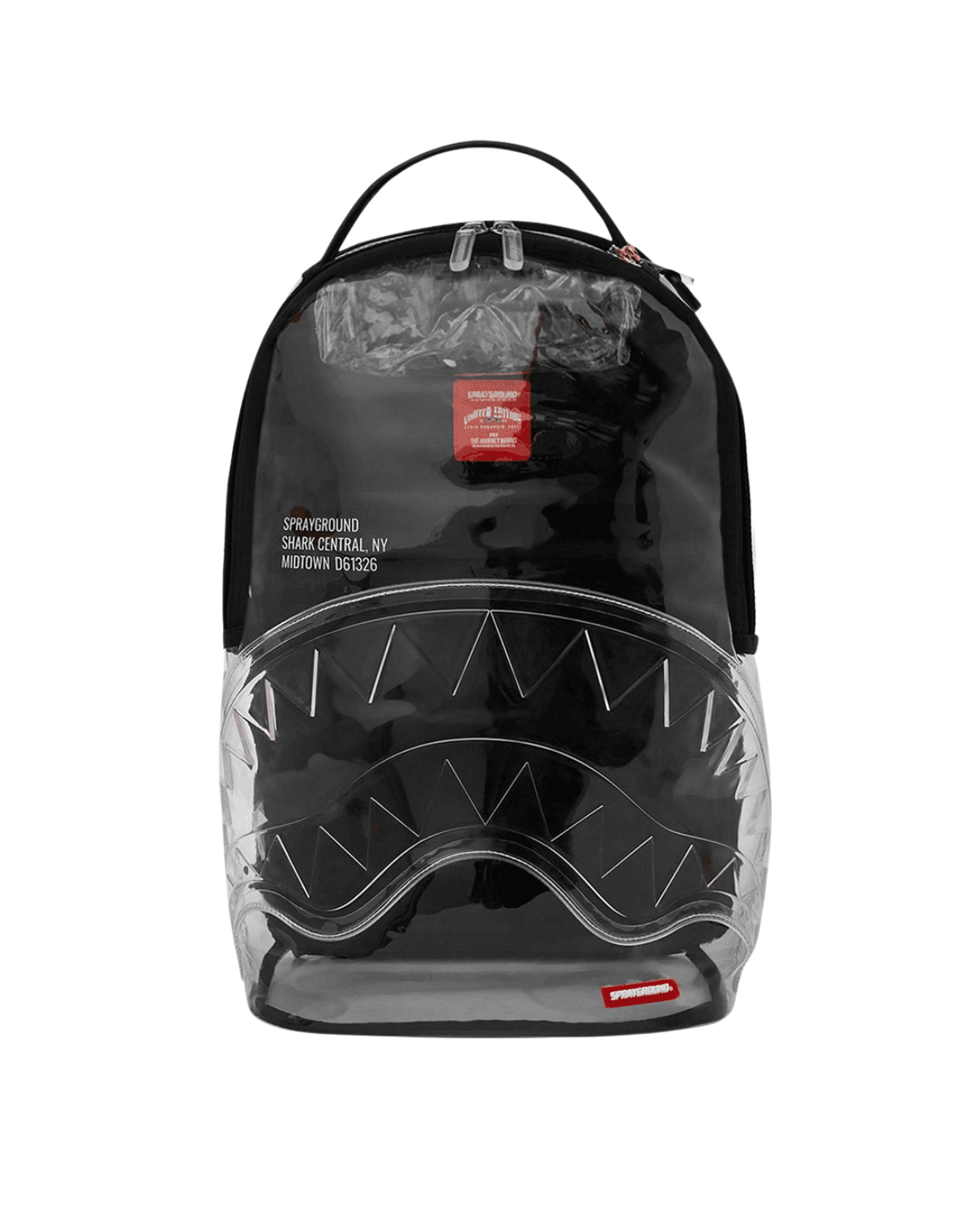 תיק הגב משלב עיצוב שקוף ייחודי בבליטת הכריש האייקוני של SPRAYGROUND, המעניק לו מראה בולט ובלתי מתפשר