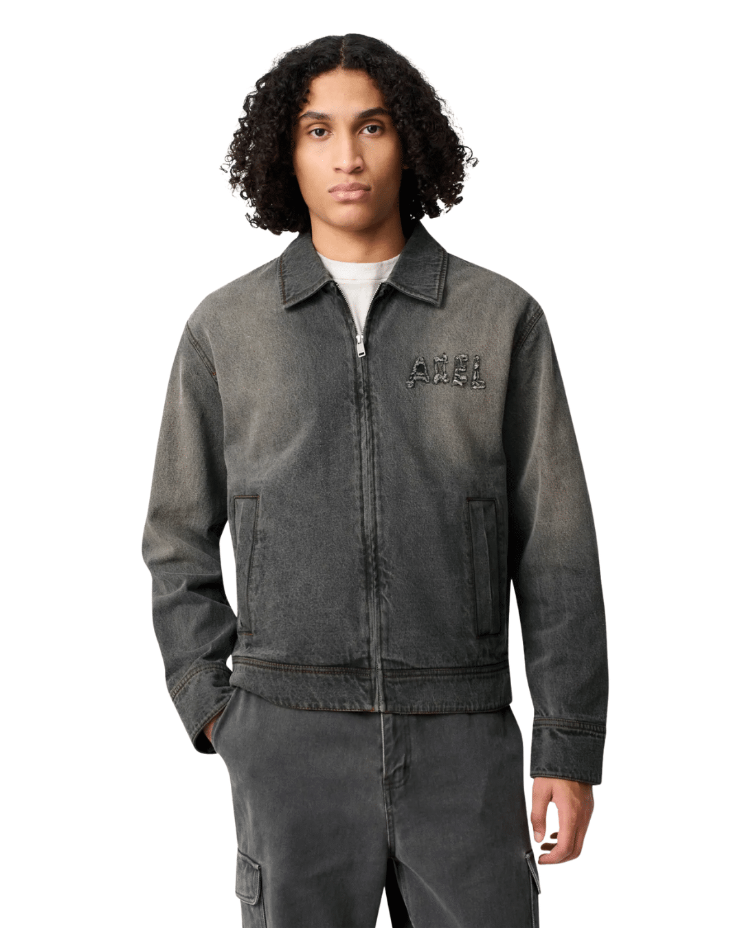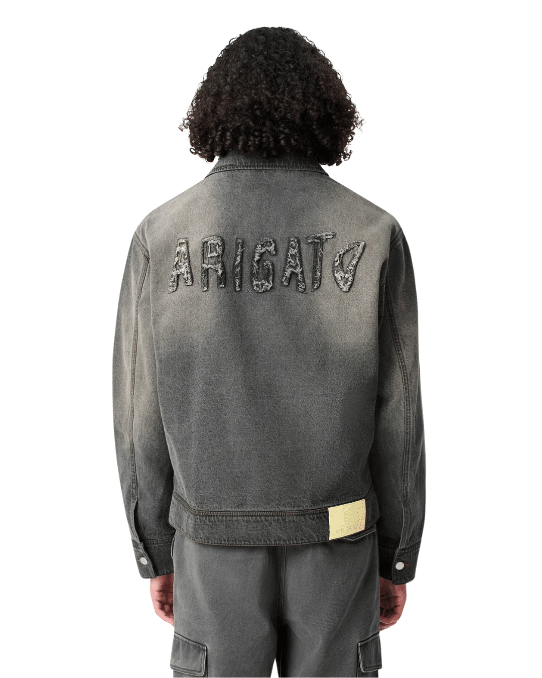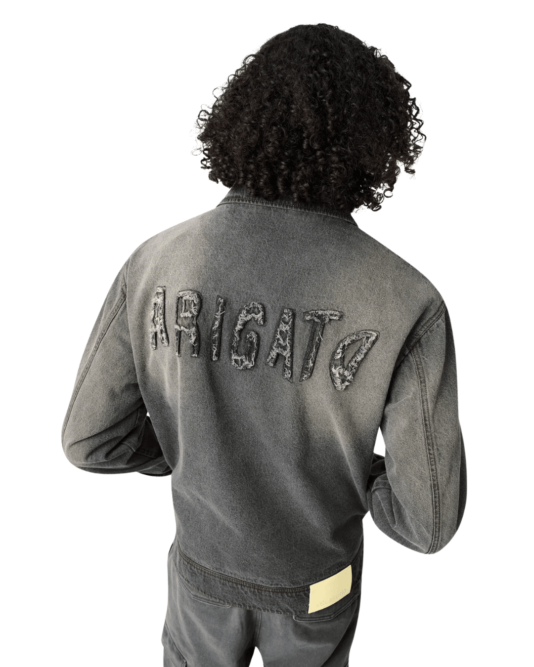 פרטים: שטיפה שמעניקה אפקט דהוי, אפליקציות עם קצוות frayed על החזה והגב