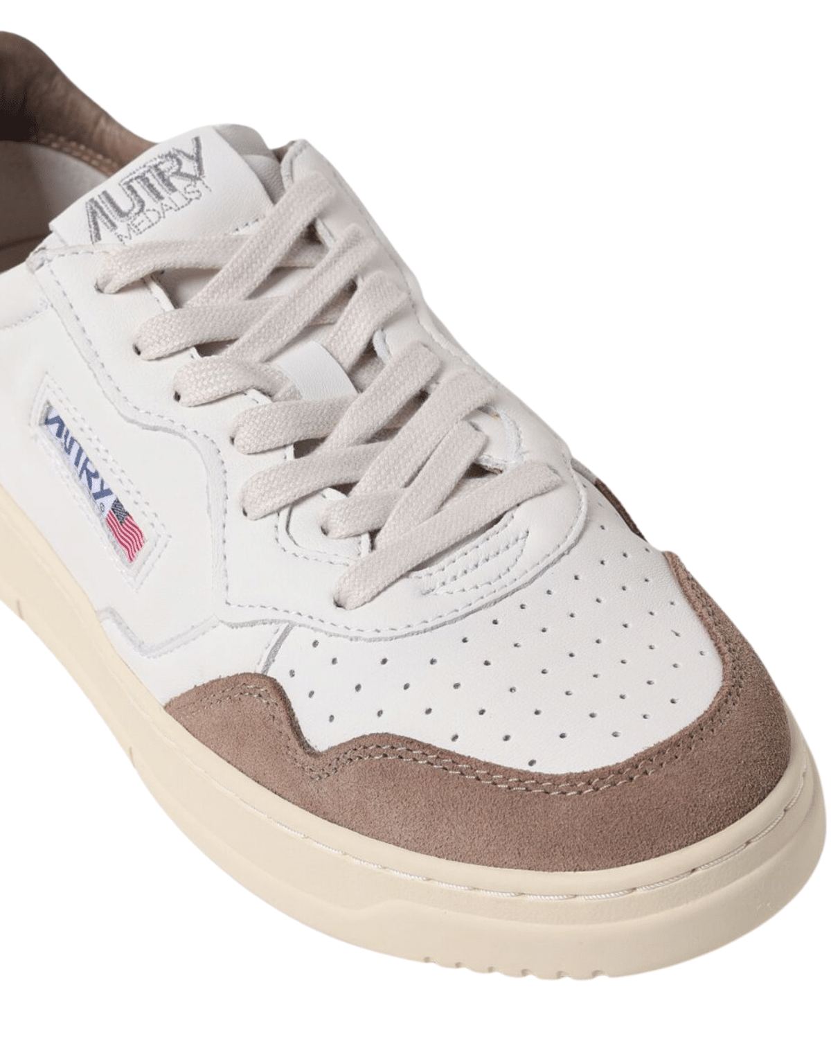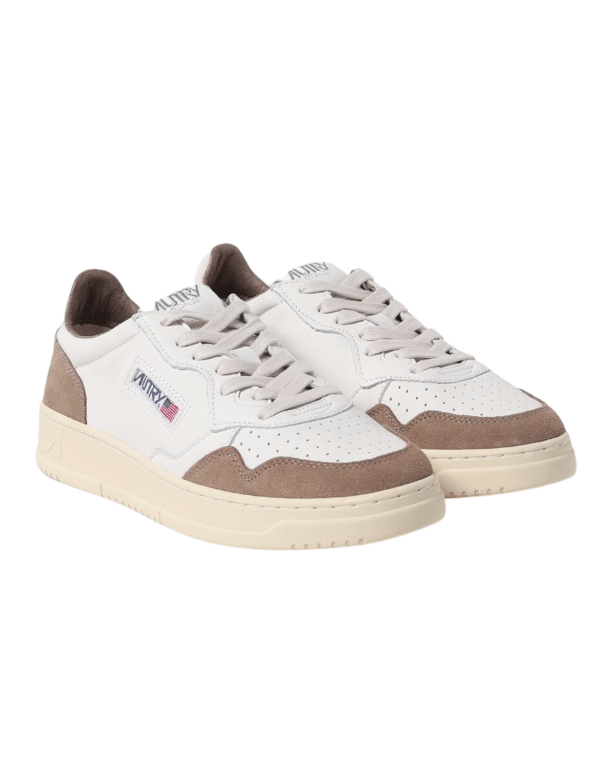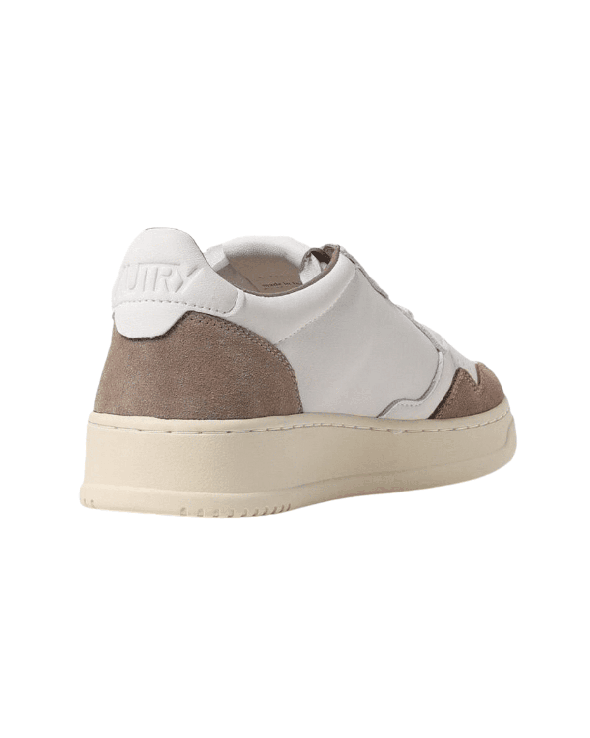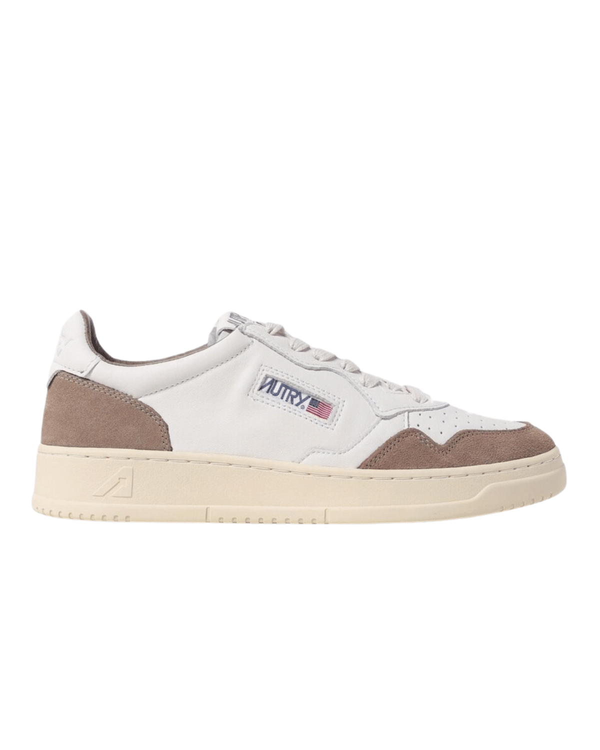נעלי סניקרס יוקרתיות לגברים בגזרה נמוכה ועיצוב נקי עם נגיעות של חום בהיר, בהשראת סגנון רטרו-אמריקאי משנות ה-80 מבית AUTRY.