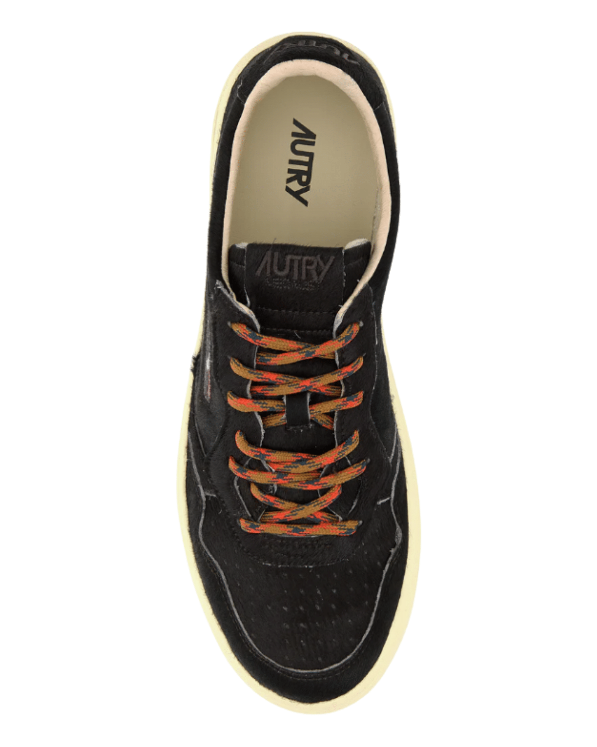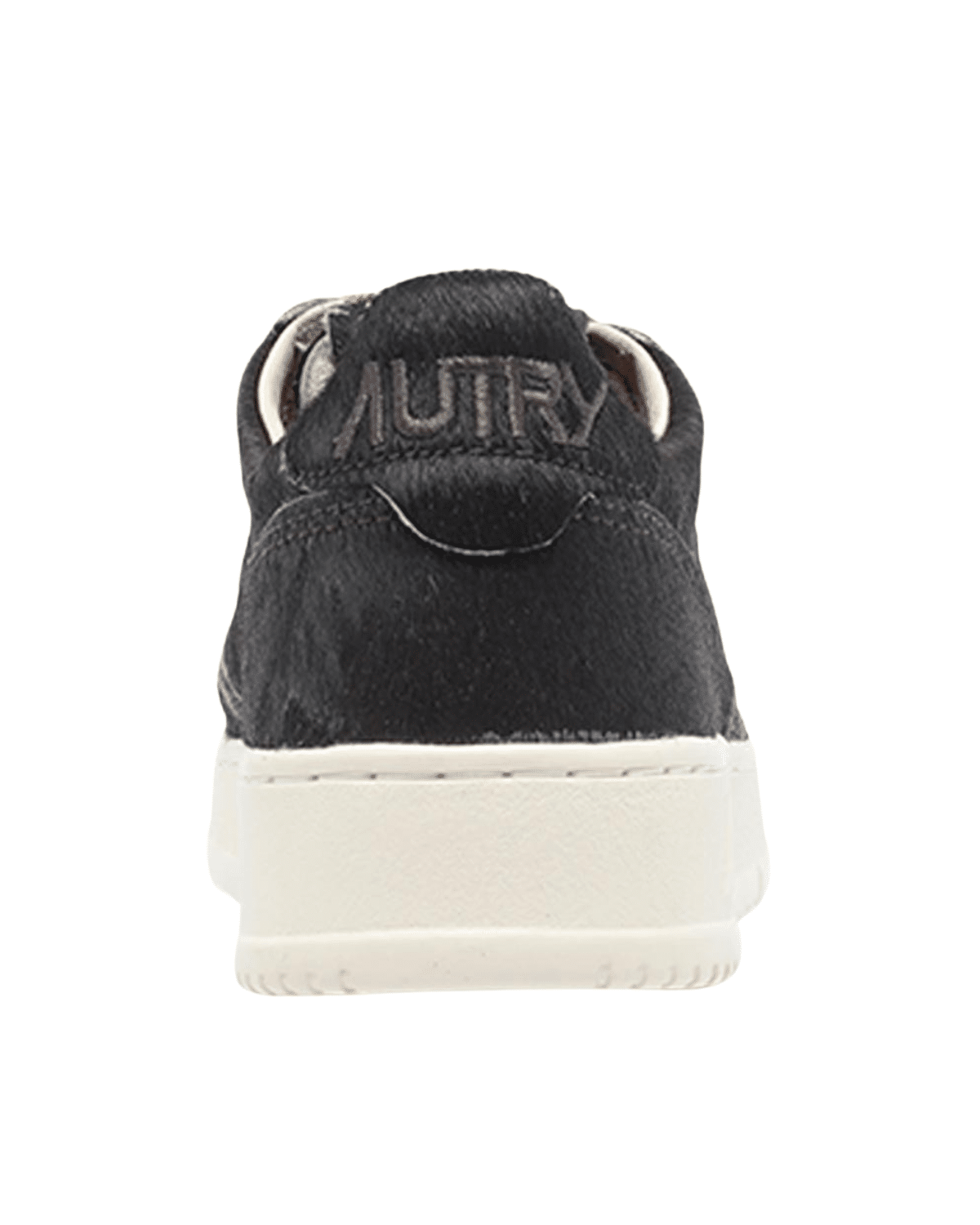 נעלי סניקרס לגבר בעיצוב מורכב בגוון שחור אלגנטי עשויות מעור פרה עם שילוב פרווה טבעית.