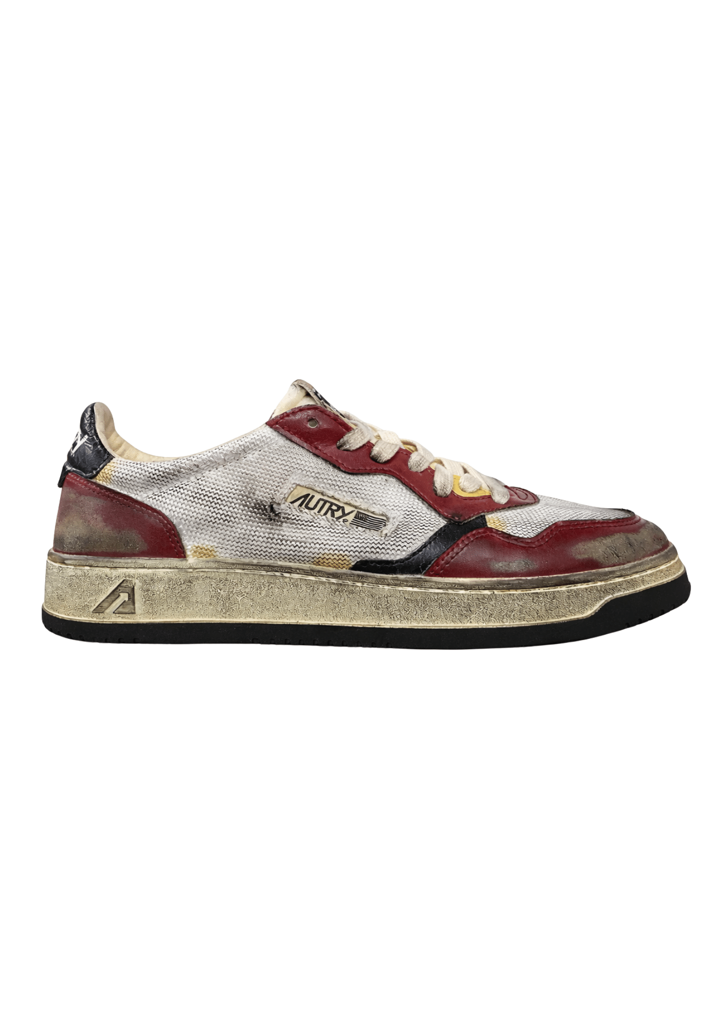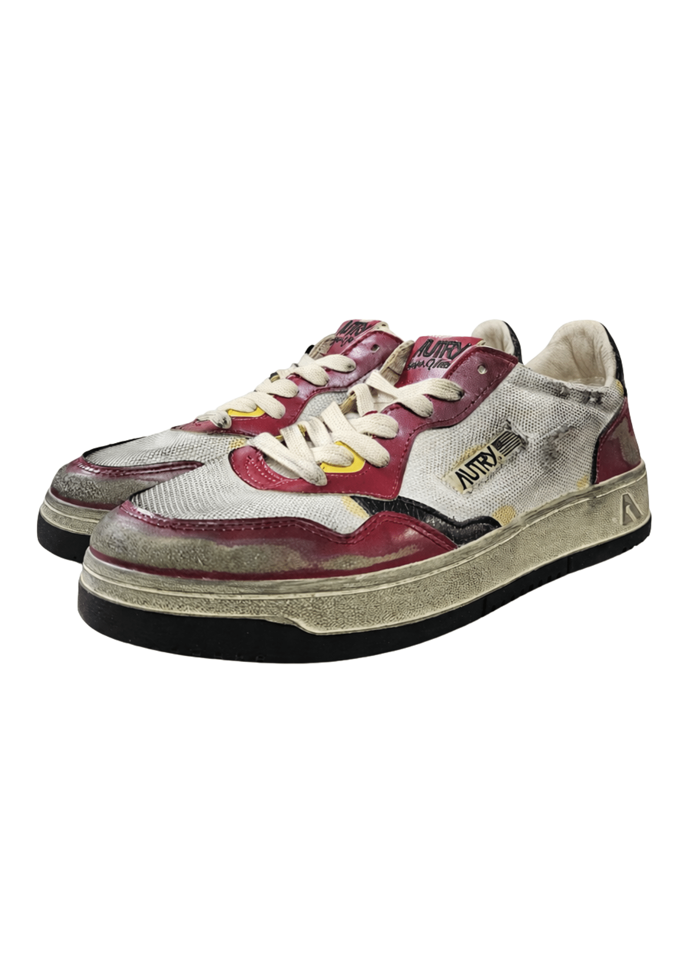 סניקרס לגברים בעיצוב וינטג’ מודגש עם אפקט “מלוכלך” ייחודי בגווני אדום, קרם ושחור.