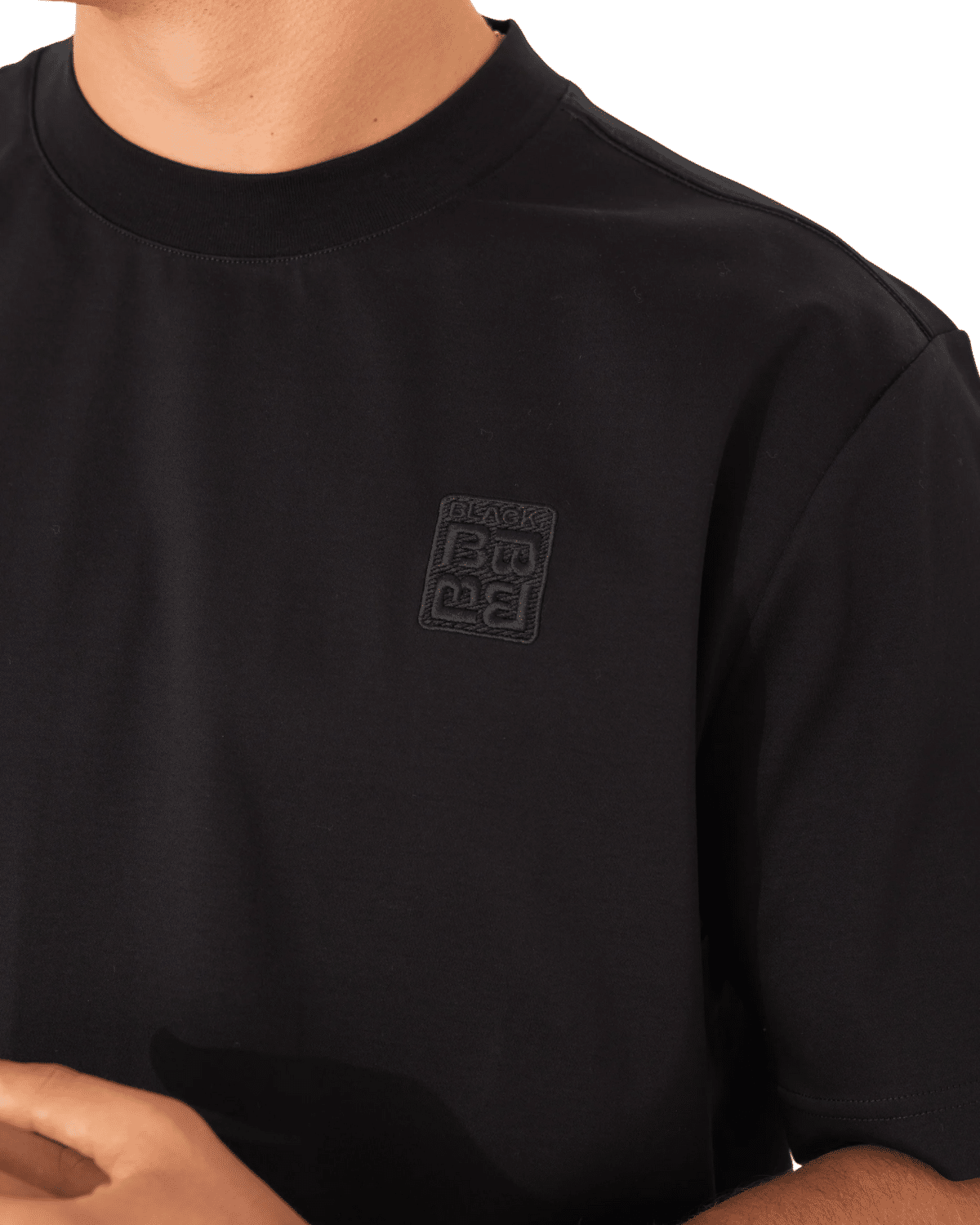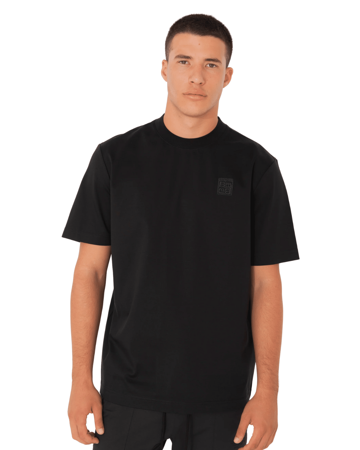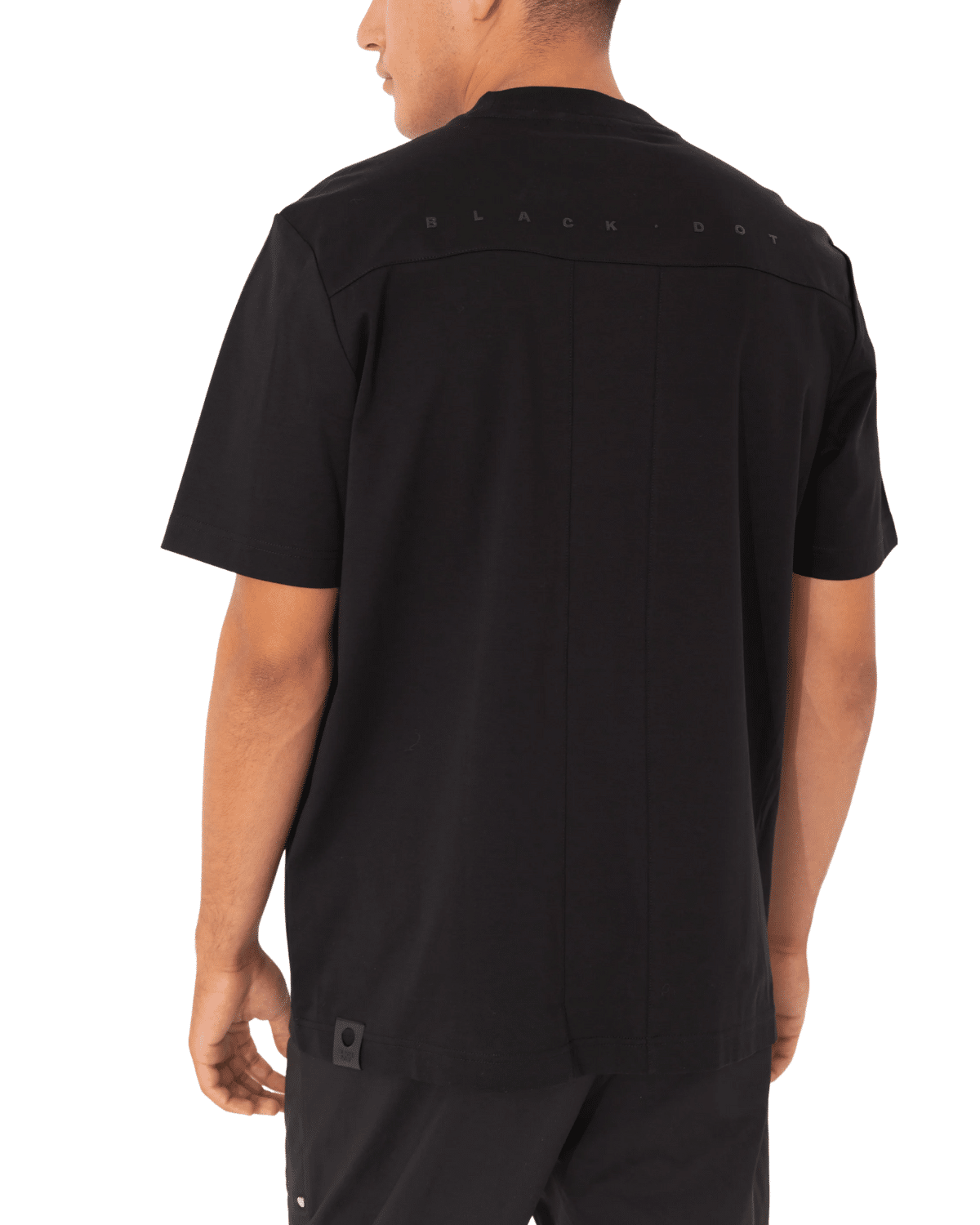 טי־שירט גברים בצבע שחור מלא עם תפר אנכי בולט בגב ולוגו עדין בחזה שמעניקים מראה נקי ועכשווי מבית BLACK DOT