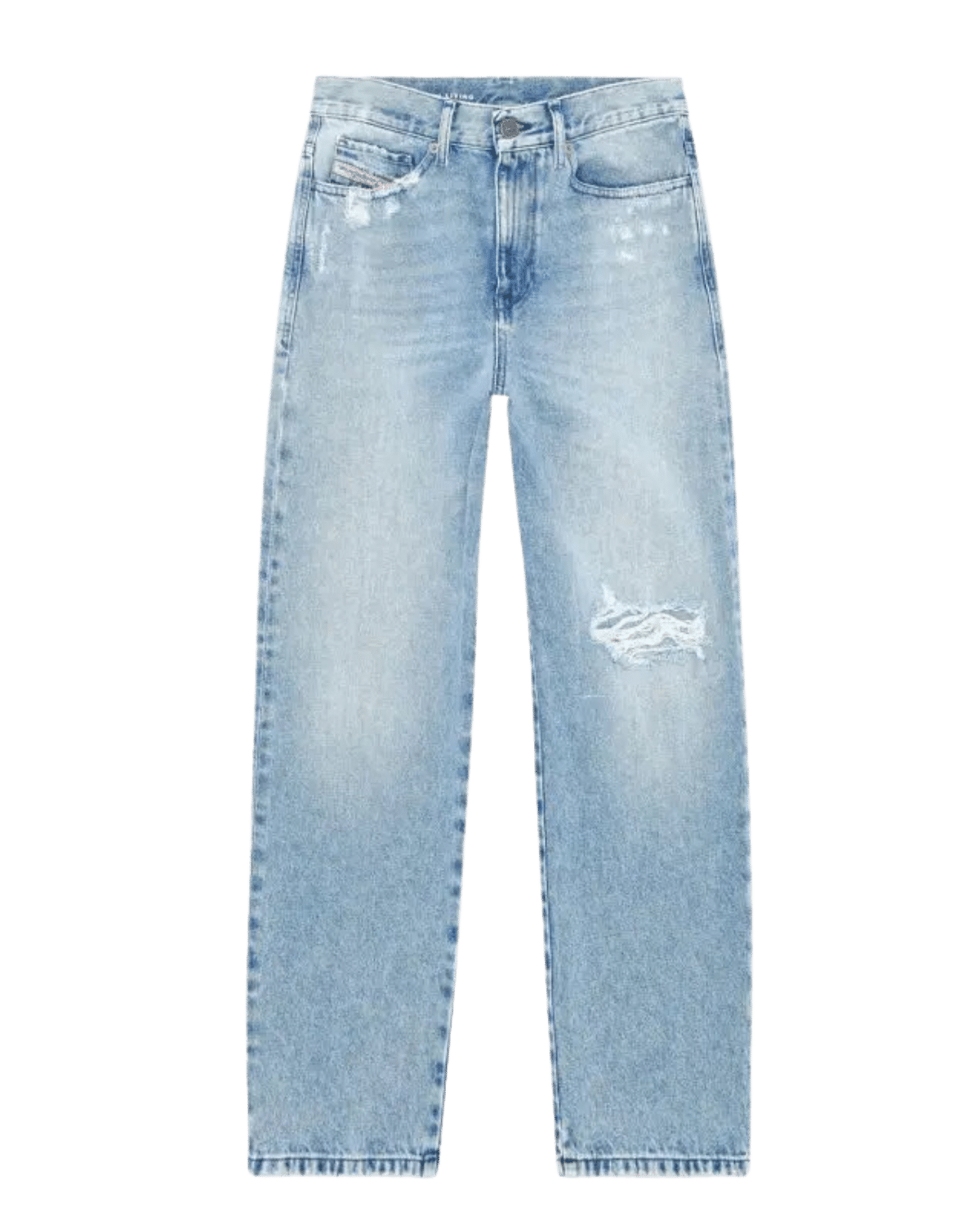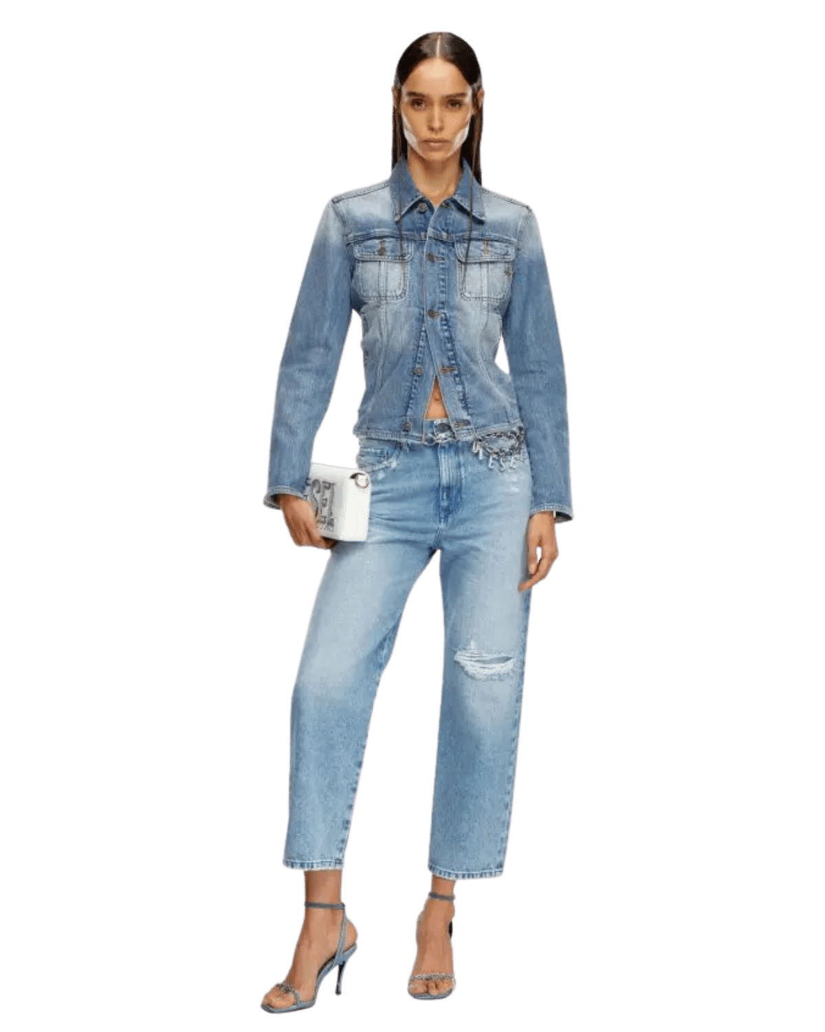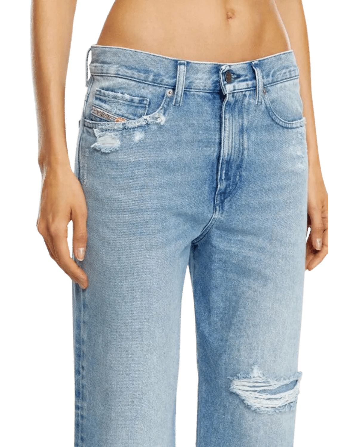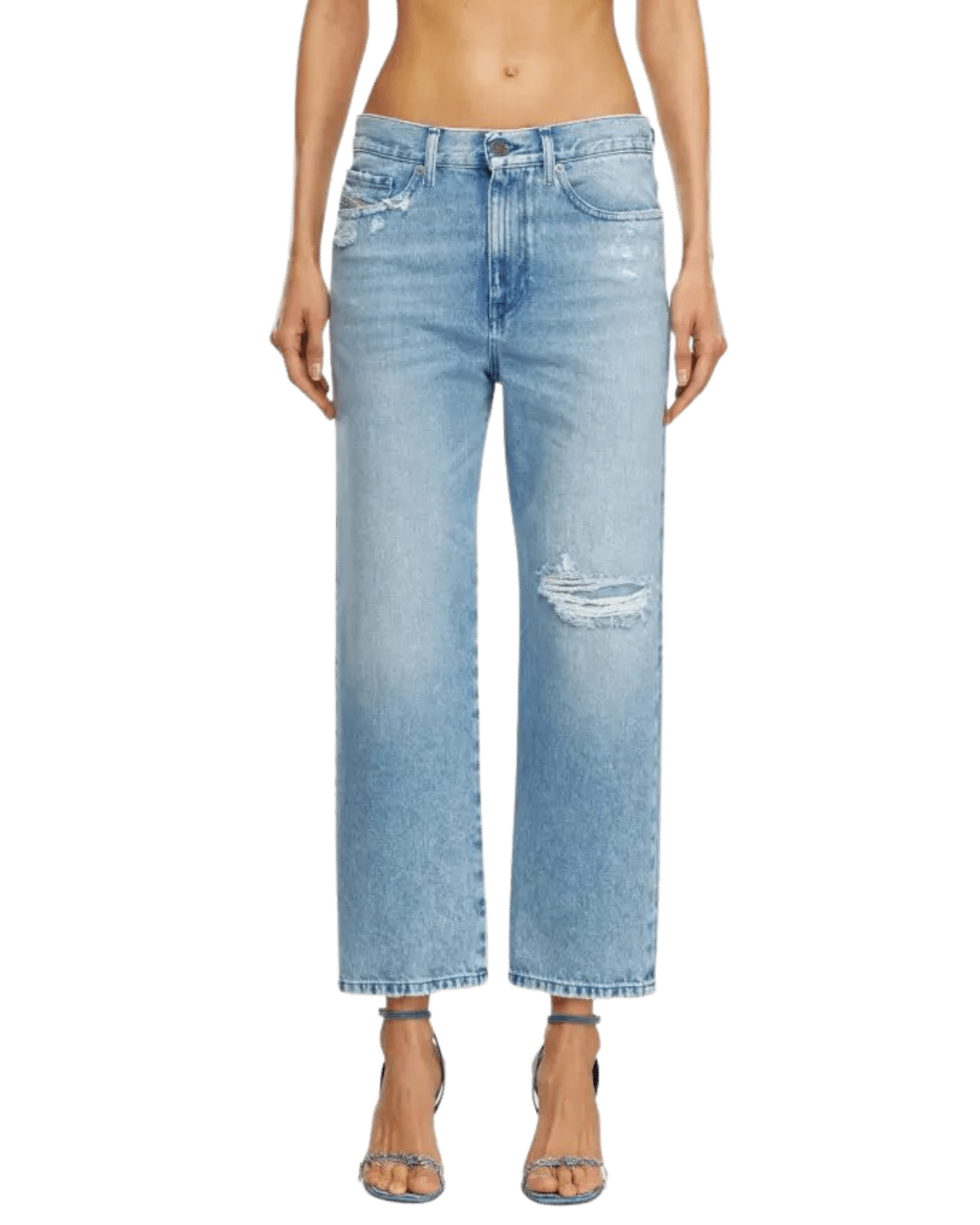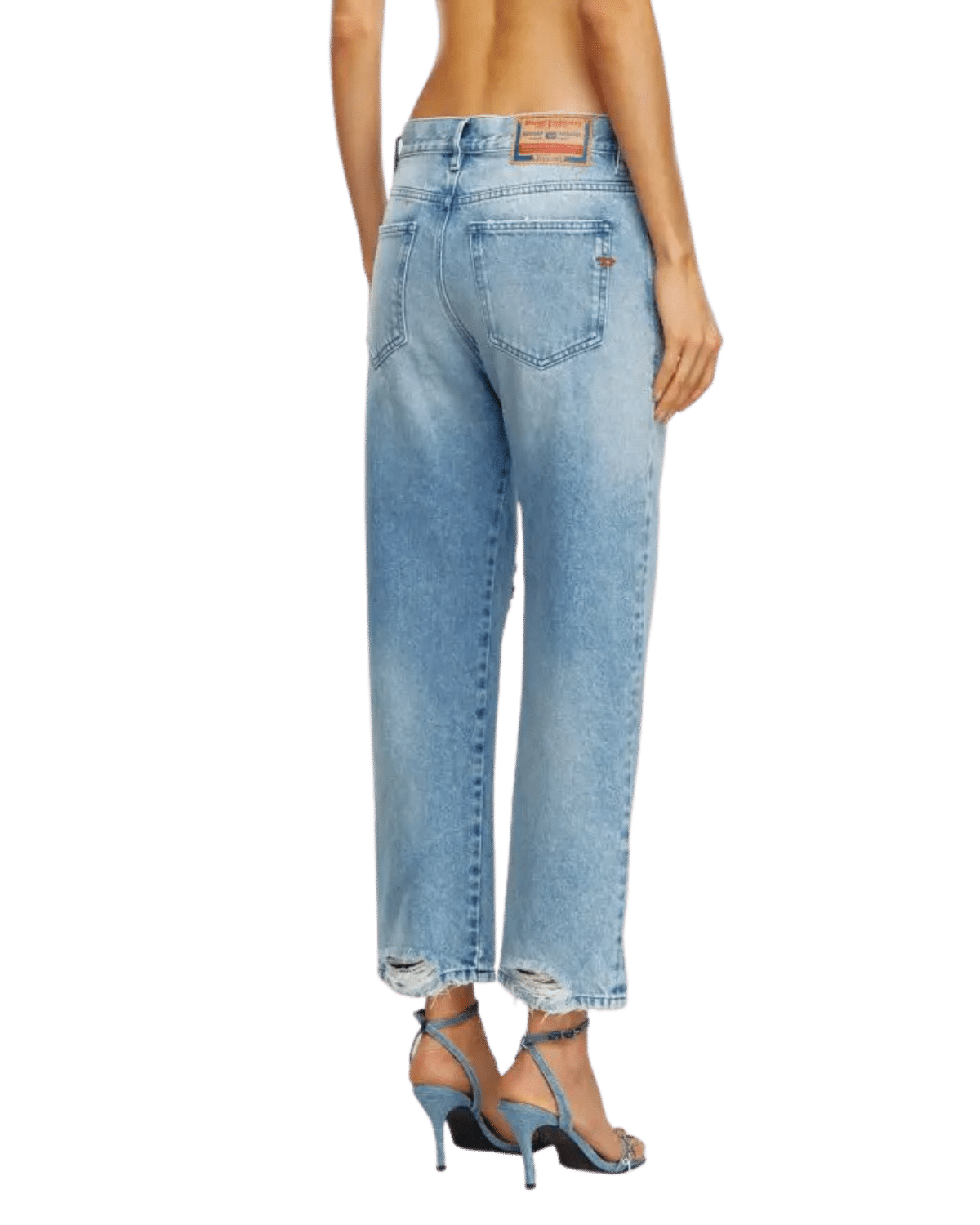 ג׳ינס בגזרת בויפרנד משוחררת בצבע כחול בהיר, באורך קרופ עד הקרסול עם קרעים קטנים.