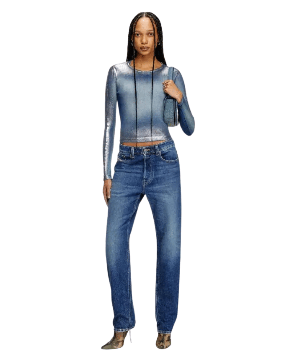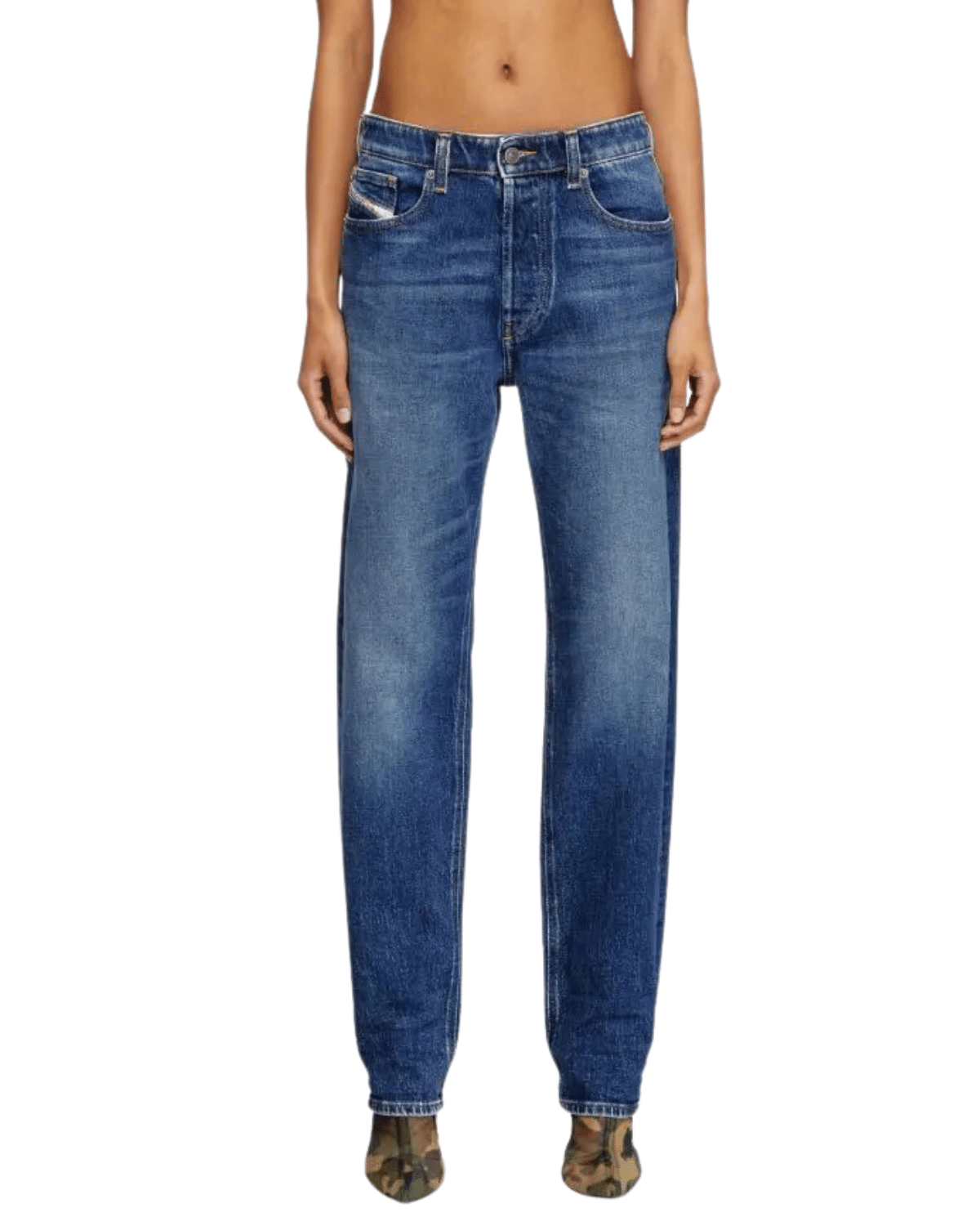 ג׳ינס כחול בגזרה מעט רפויה עם מותן בגובה רגיל ורגל ישרה עם הצרה קלה בתחתית.