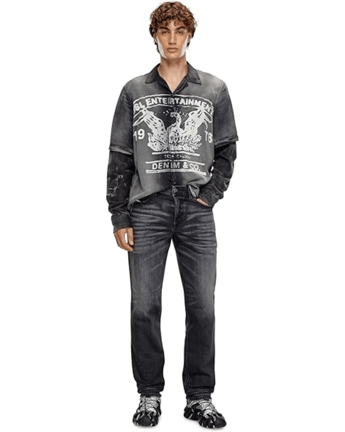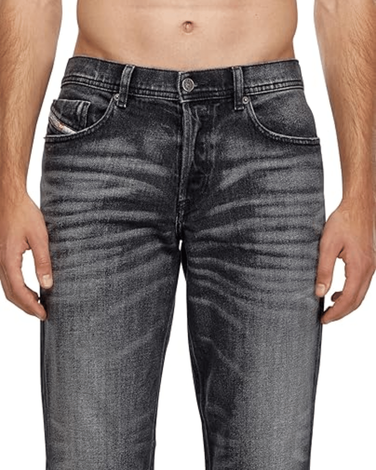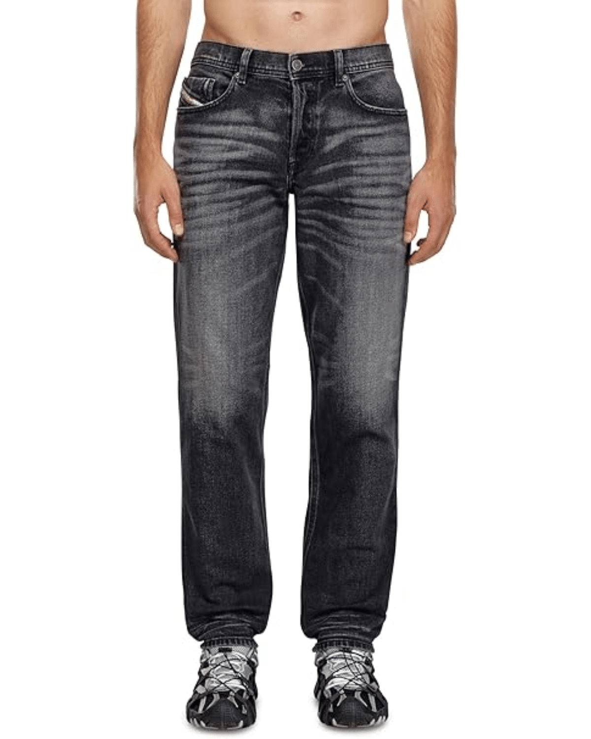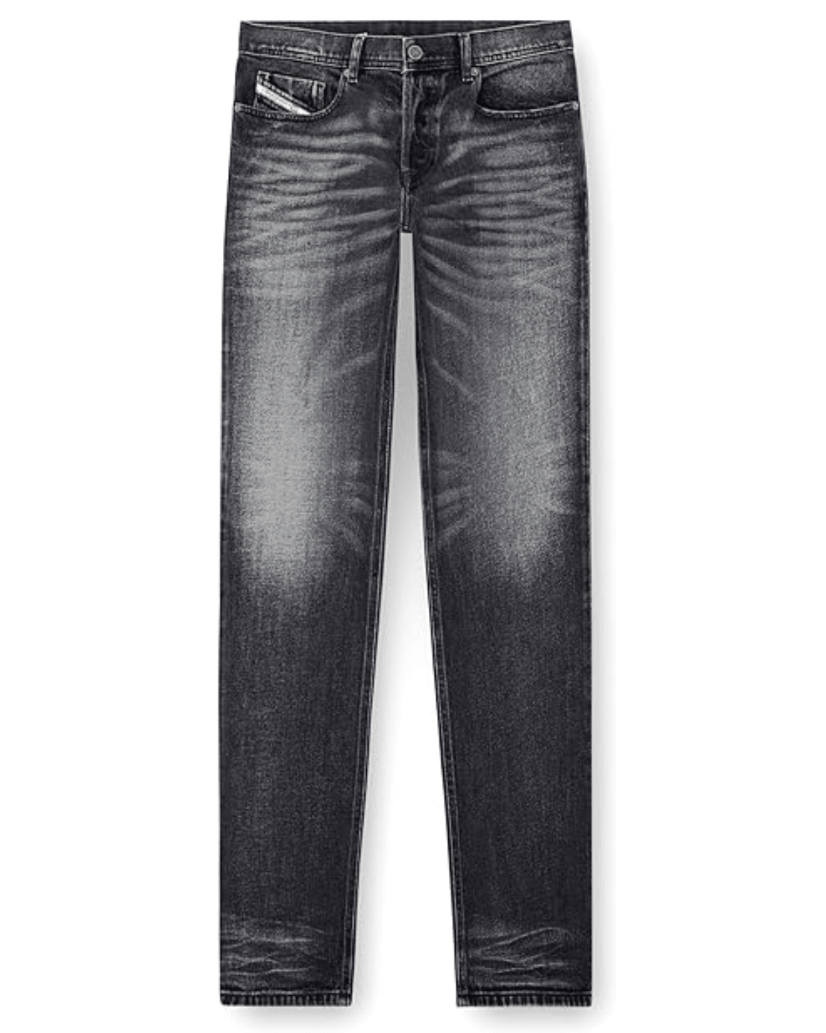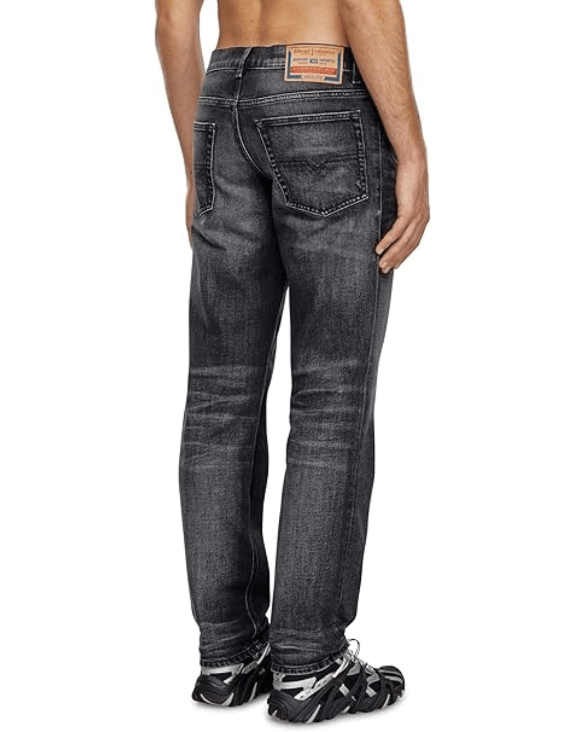 הג'ינס הנוחות מציג שטיפה שחורה שעברה טיפול עדין למראה משומש רך שאופייני לאסתטיקת ה-DNA של דיזל.