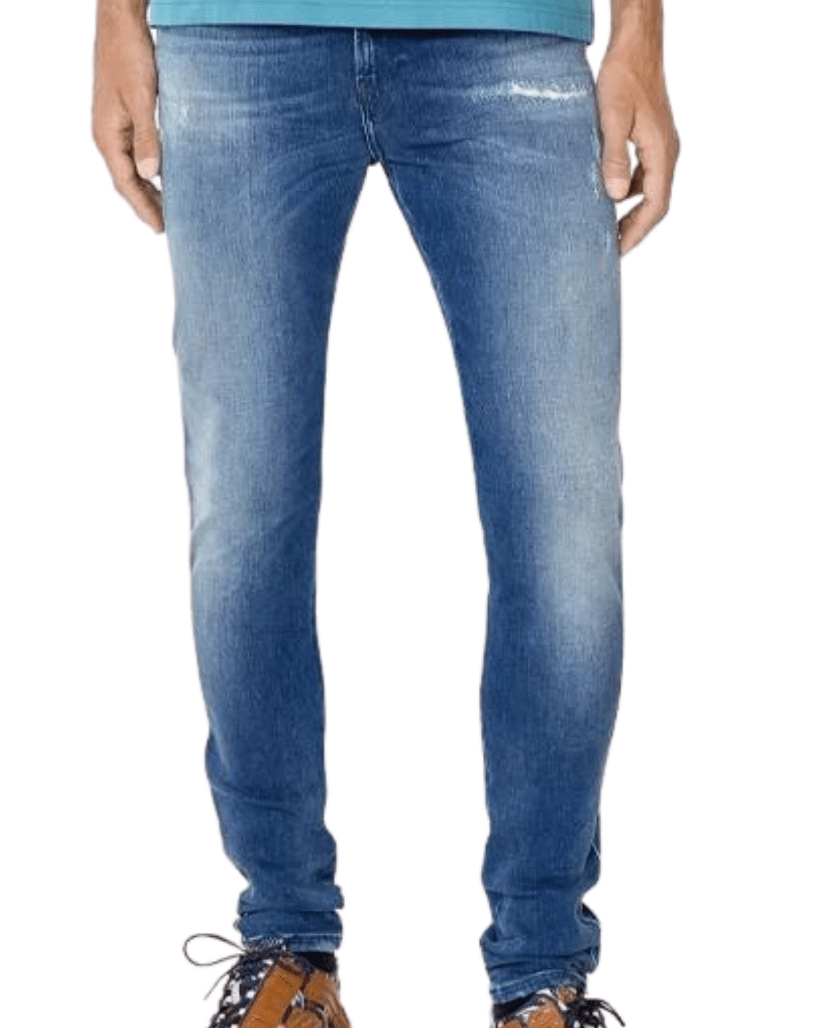 ג׳ינס סקיני כחול באורך ארוך מהרגיל, כך שאפשר לקפל את הקצוות או ללבוש כמו שהוא ליצירת כיווצים קלים בתחתית