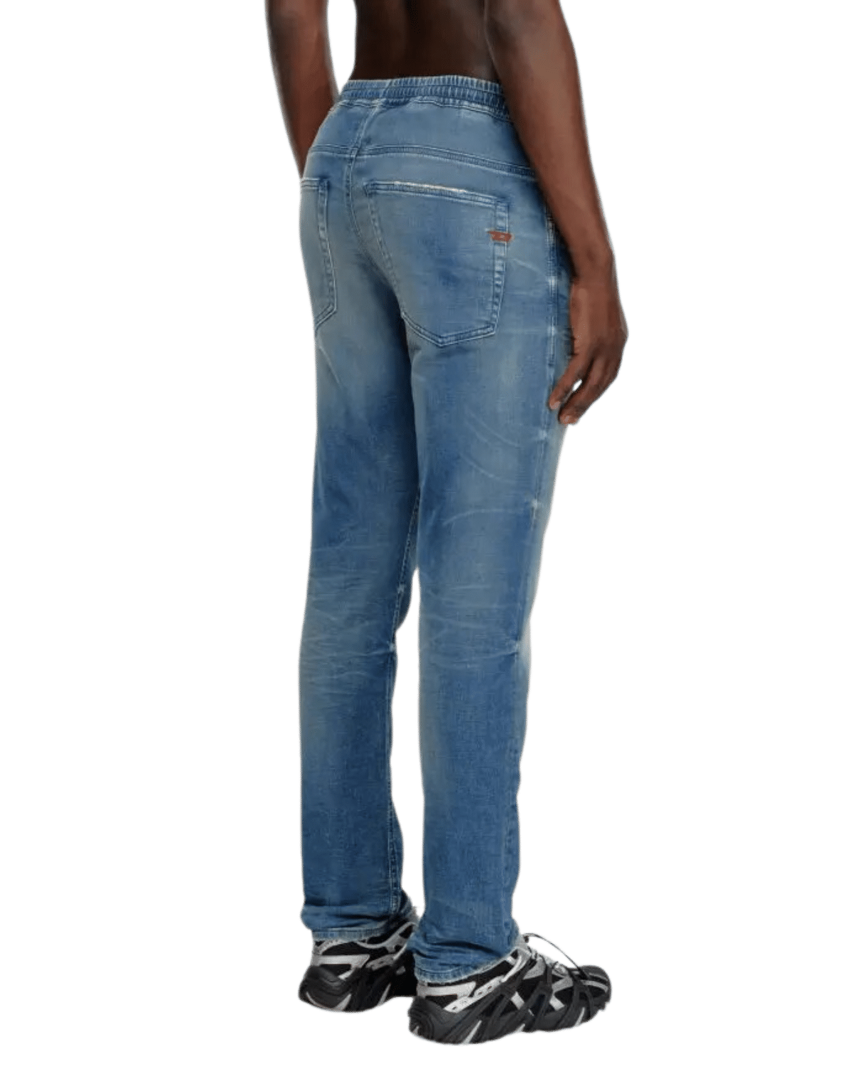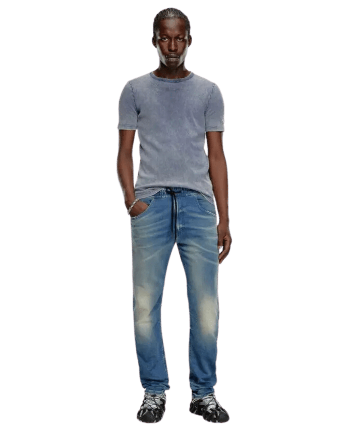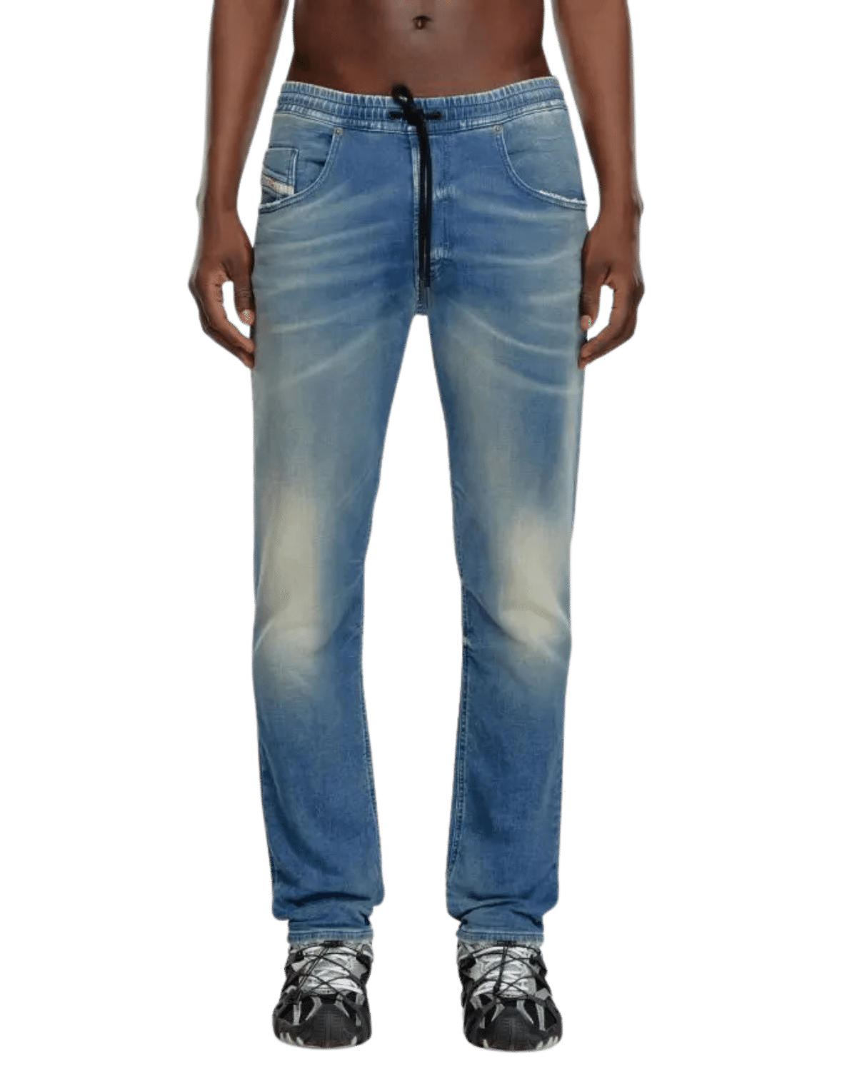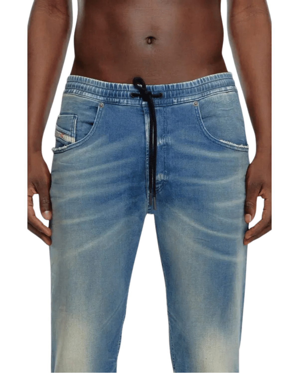 ג׳ינס כחול מבד ג׳וג ג׳ינס נעים ונוח, בגזרה מעט משוחררת במותניים והירכיים וצרה בקרסוליים, עם גומי ושרוך קשירה.